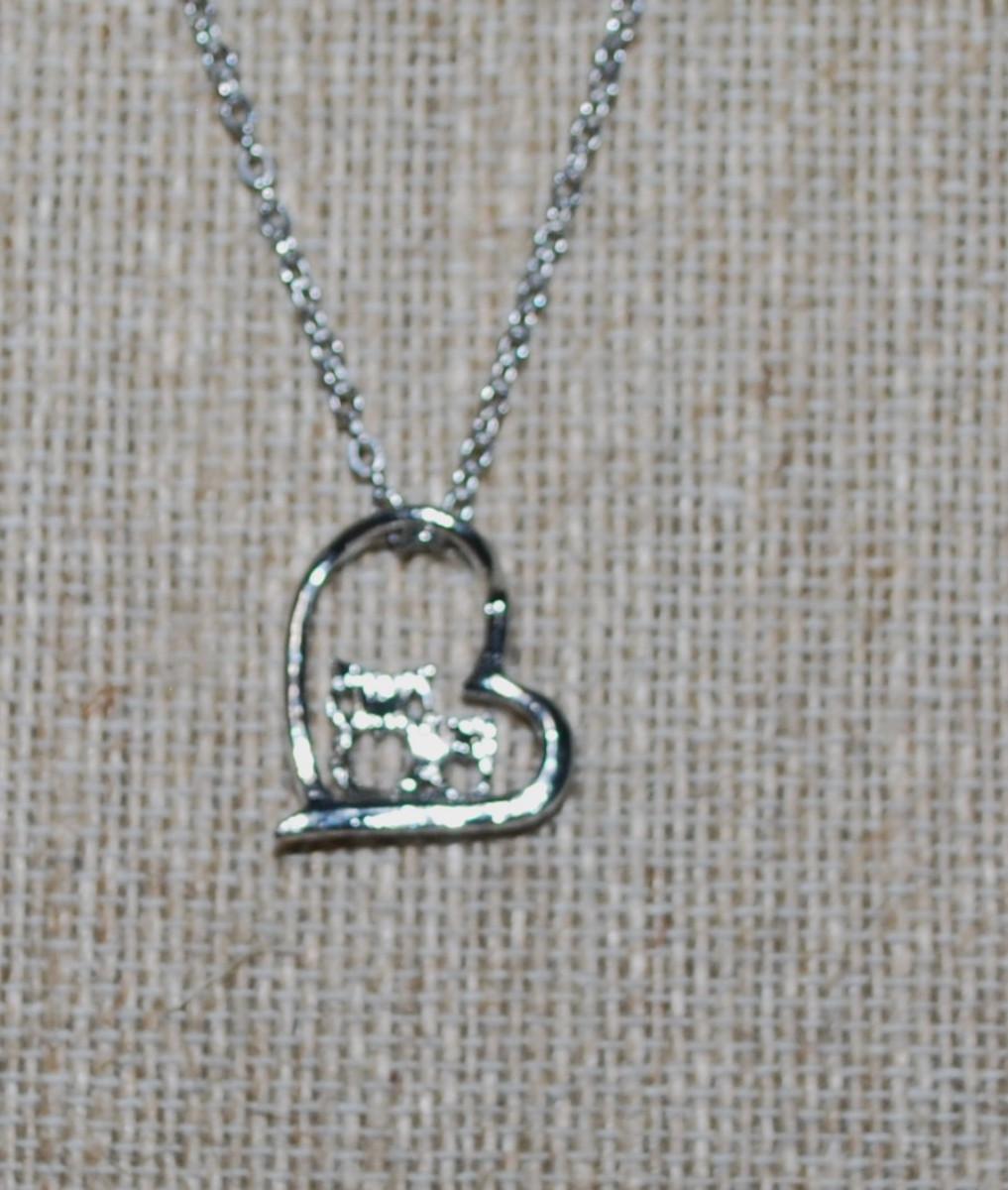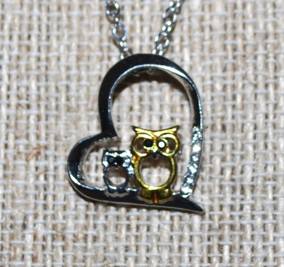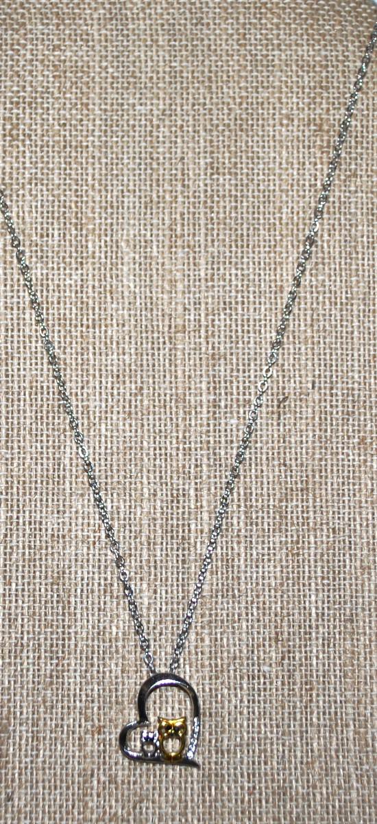 Two Tone Mother & Baby Owl HEART PENDANT (¾" x ¾") on a Silver Tone Necklace Chain 16" L