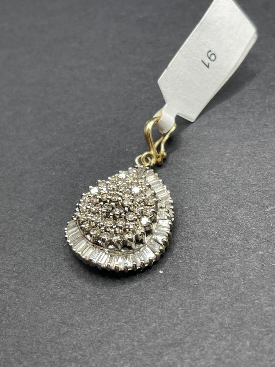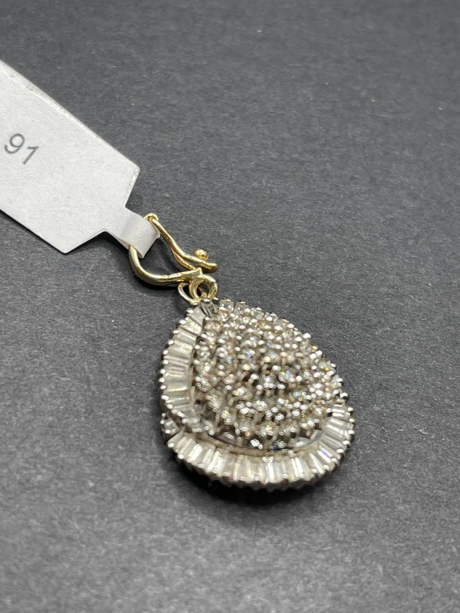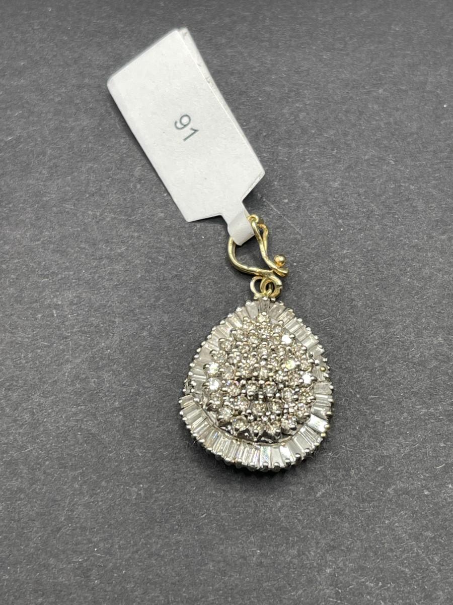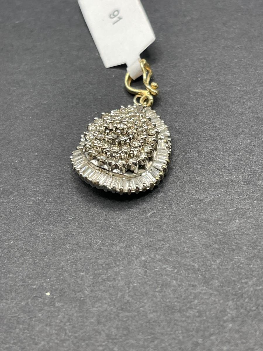 two tone pendant set with small round and large baguette diamonds. 14K yellow and white gold. 6.66 total grams. I-JI1. Good condition.
