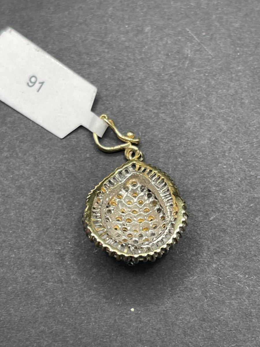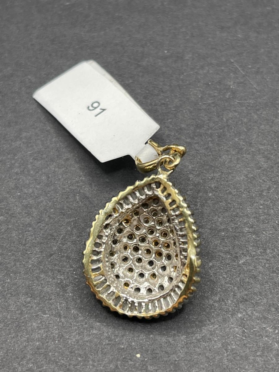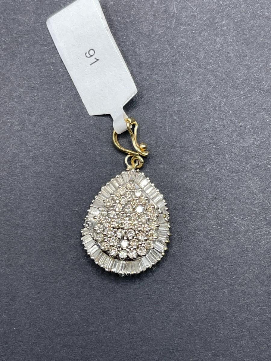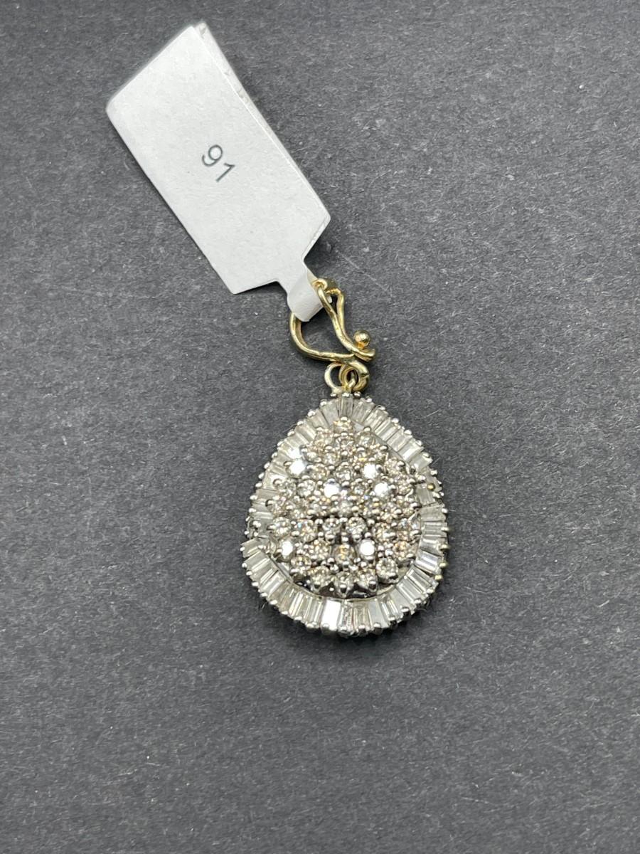 two tone pendant set with small round and large baguette diamonds. 14K yellow and white gold. 6.66 total grams. I-JI1. Good condition.