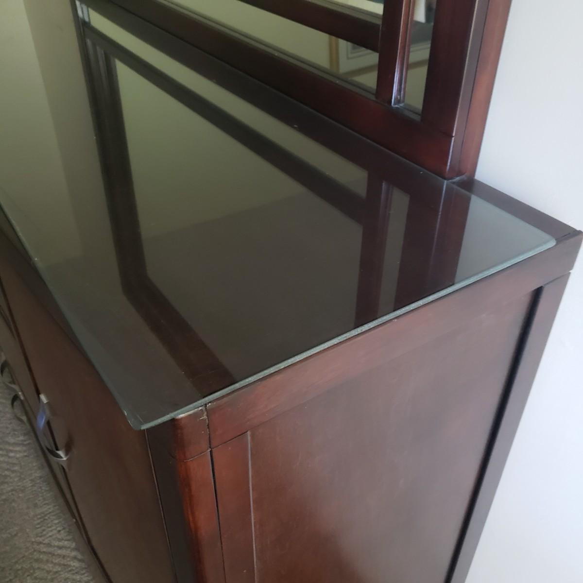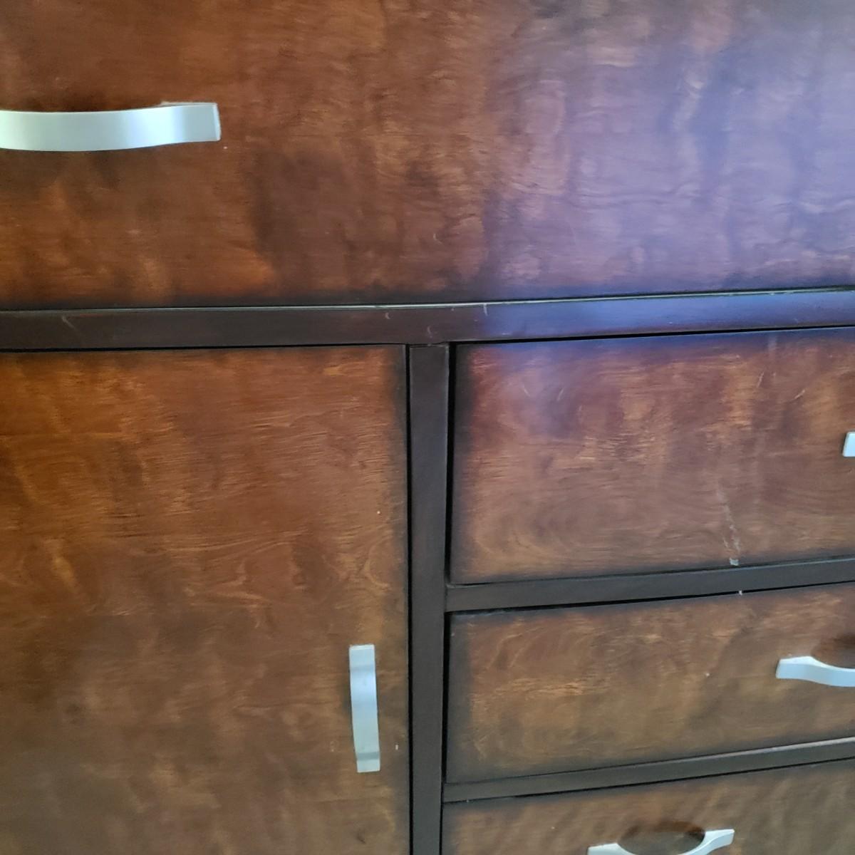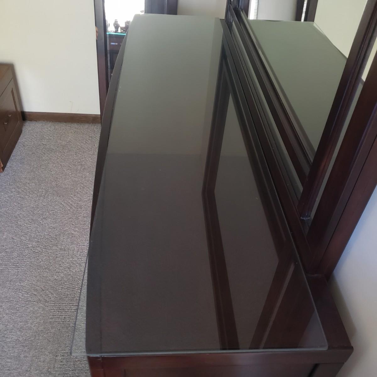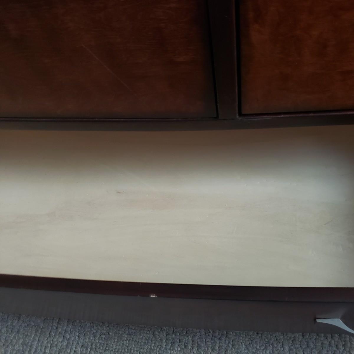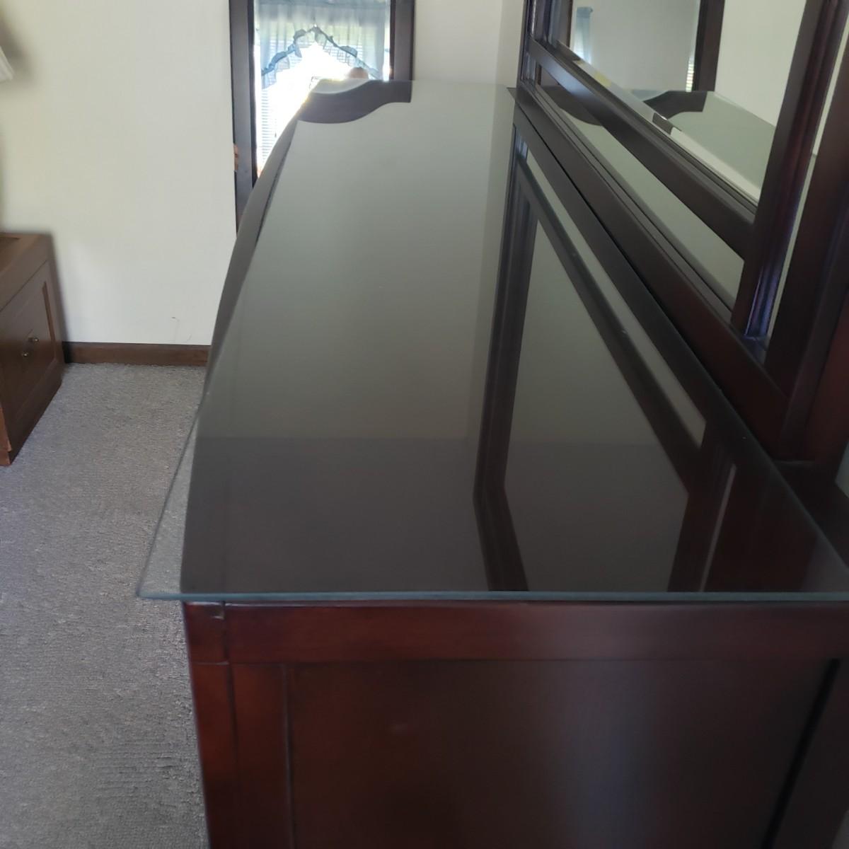 This is a two toned wooden dresser with attached mirror. The dresser comes with a glass topper. The dresser is curved outward, so the glass sticks out at the two corners, see pictures. The dresser measures 64" x 18" x 43"H. The mirror measures 52" x 38"H. The dresser has two cabinets with a fixed shelf in each. There are two large drawers and two smaller drawers. The handles are a silver metal. The dresser has some blemishes, see pictures. This piece does match a set listed as other lots in this sale. Local pickup only. This item is located on the ground floor with three steps down from the porch to the driveway.