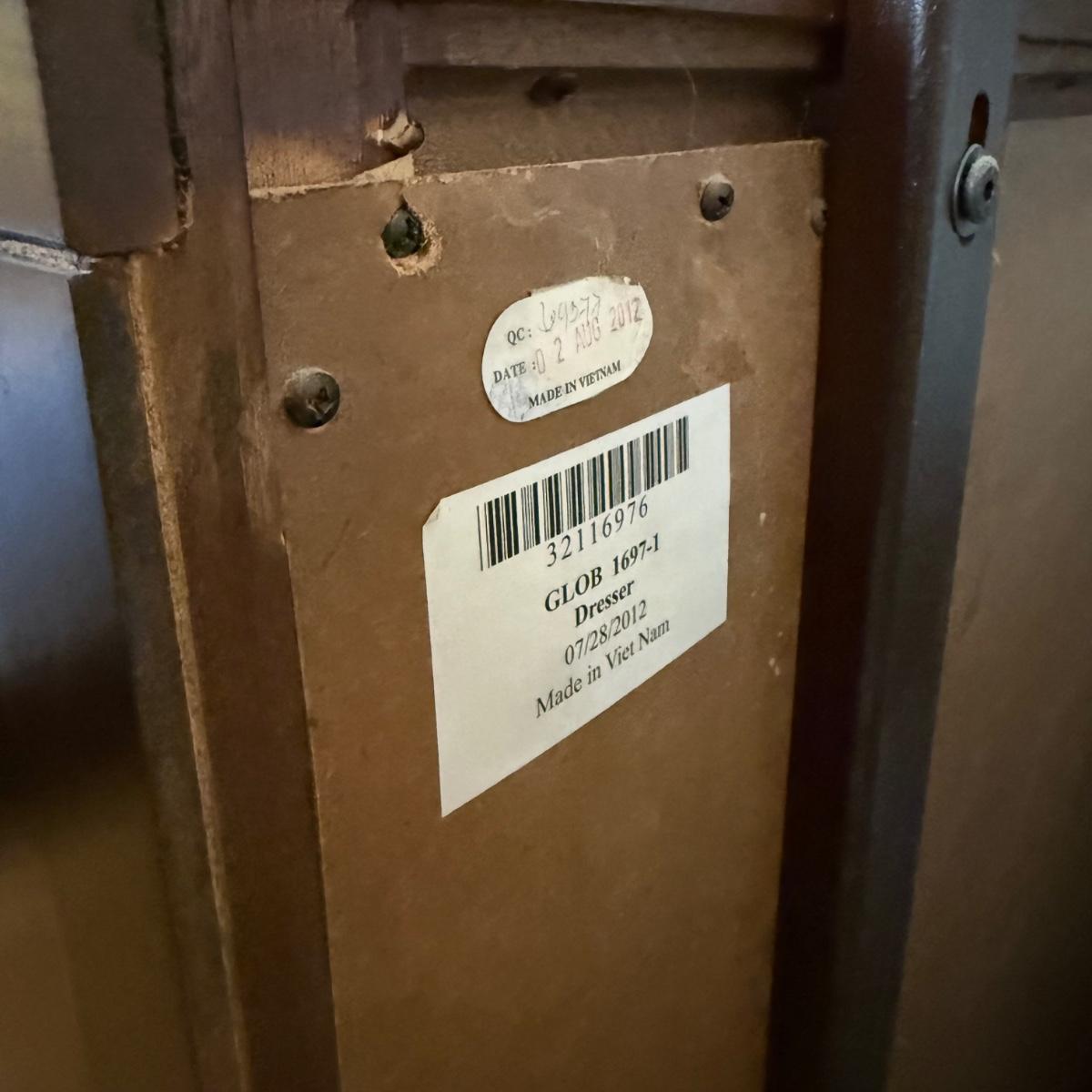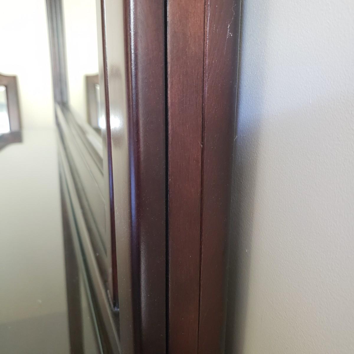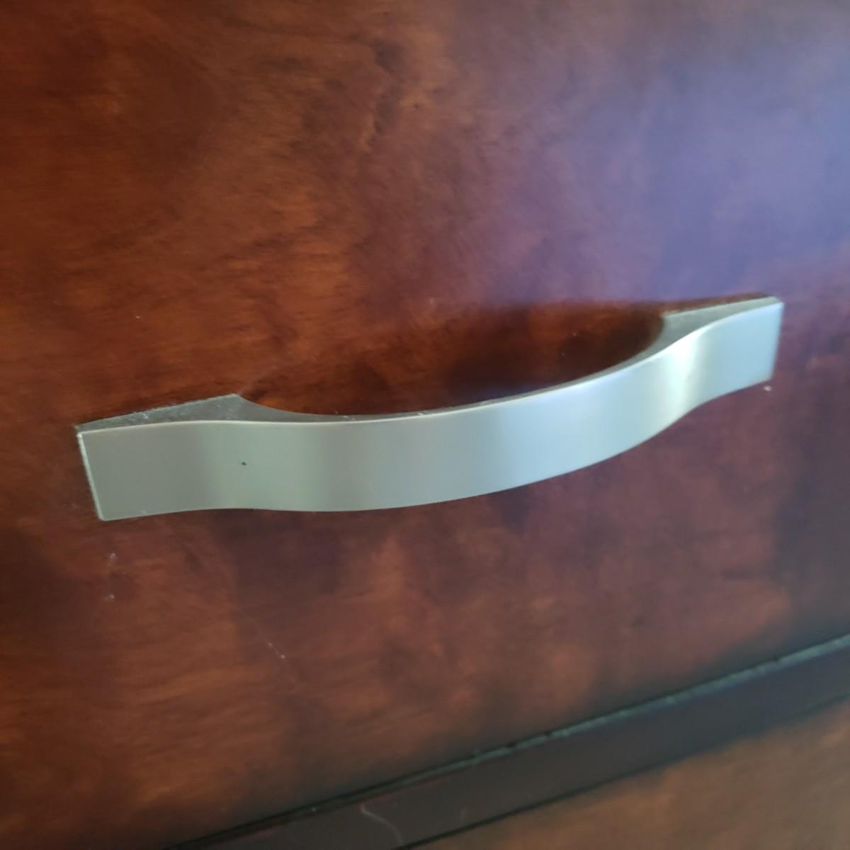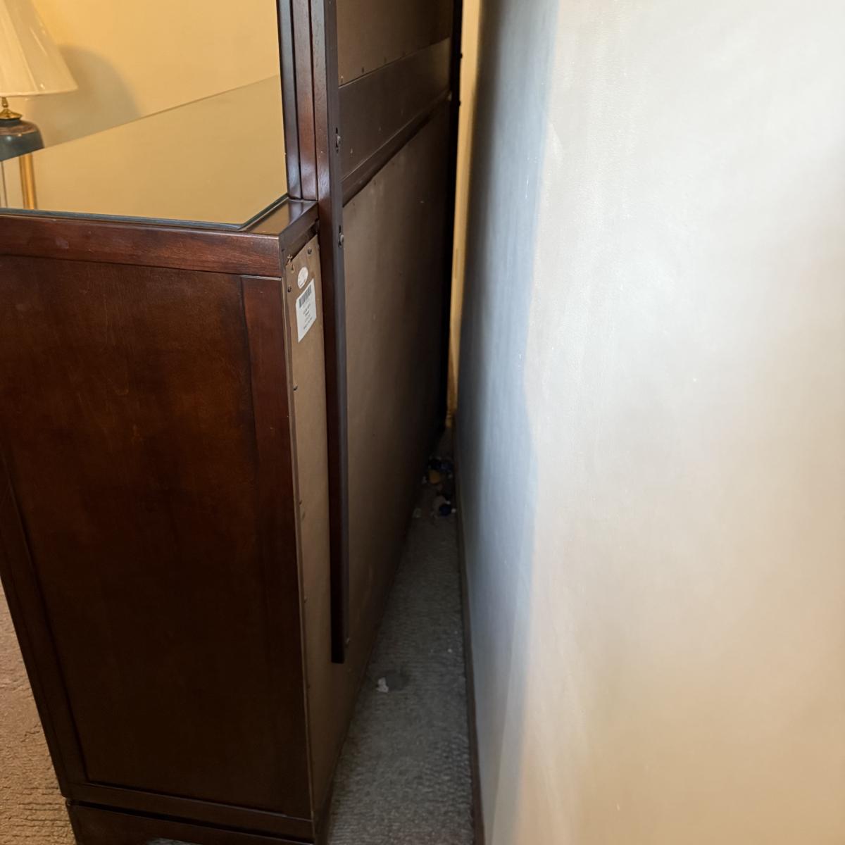 This is a two toned wooden dresser with attached mirror. The dresser comes with a glass topper. The dresser is curved outward, so the glass sticks out at the two corners, see pictures. The dresser measures 64" x 18" x 43"H. The mirror measures 52" x 38"H. The dresser has two cabinets with a fixed shelf in each. There are two large drawers and two smaller drawers. The handles are a silver metal. The dresser has some blemishes, see pictures. This piece does match a set listed as other lots in this sale. Local pickup only. This item is located on the ground floor with three steps down from the porch to the driveway.