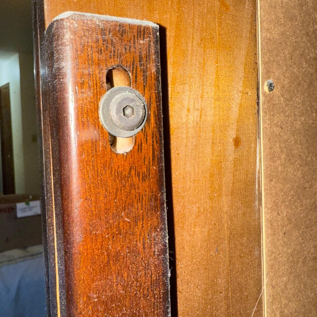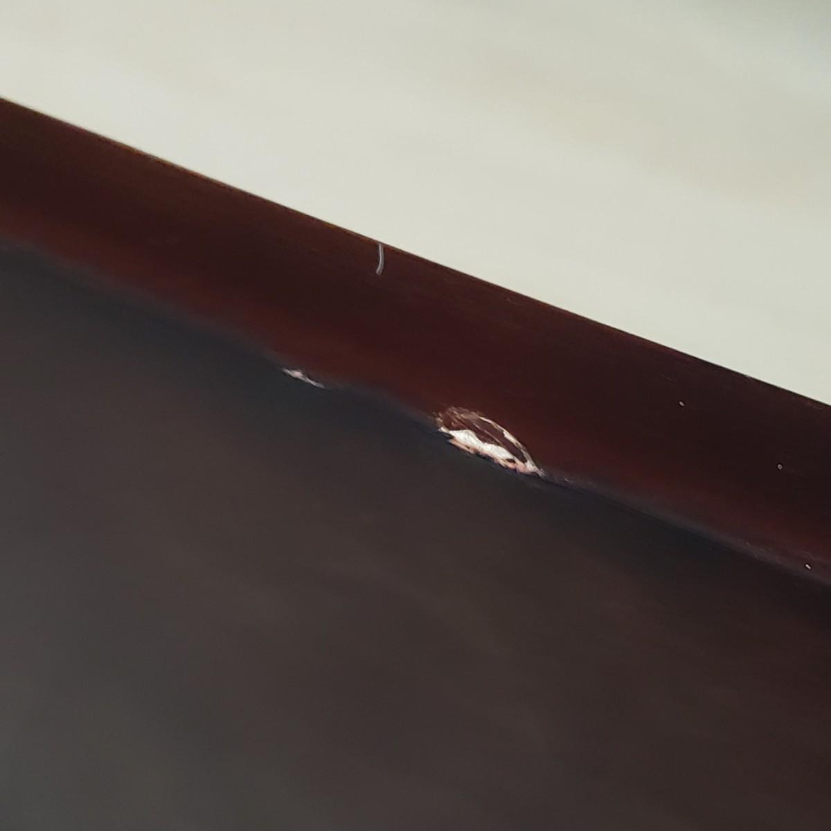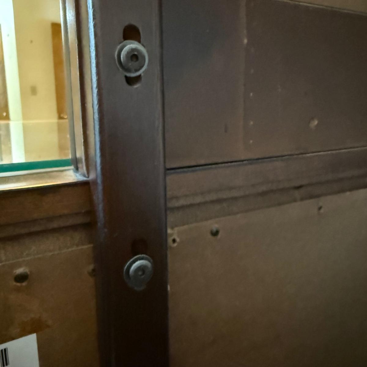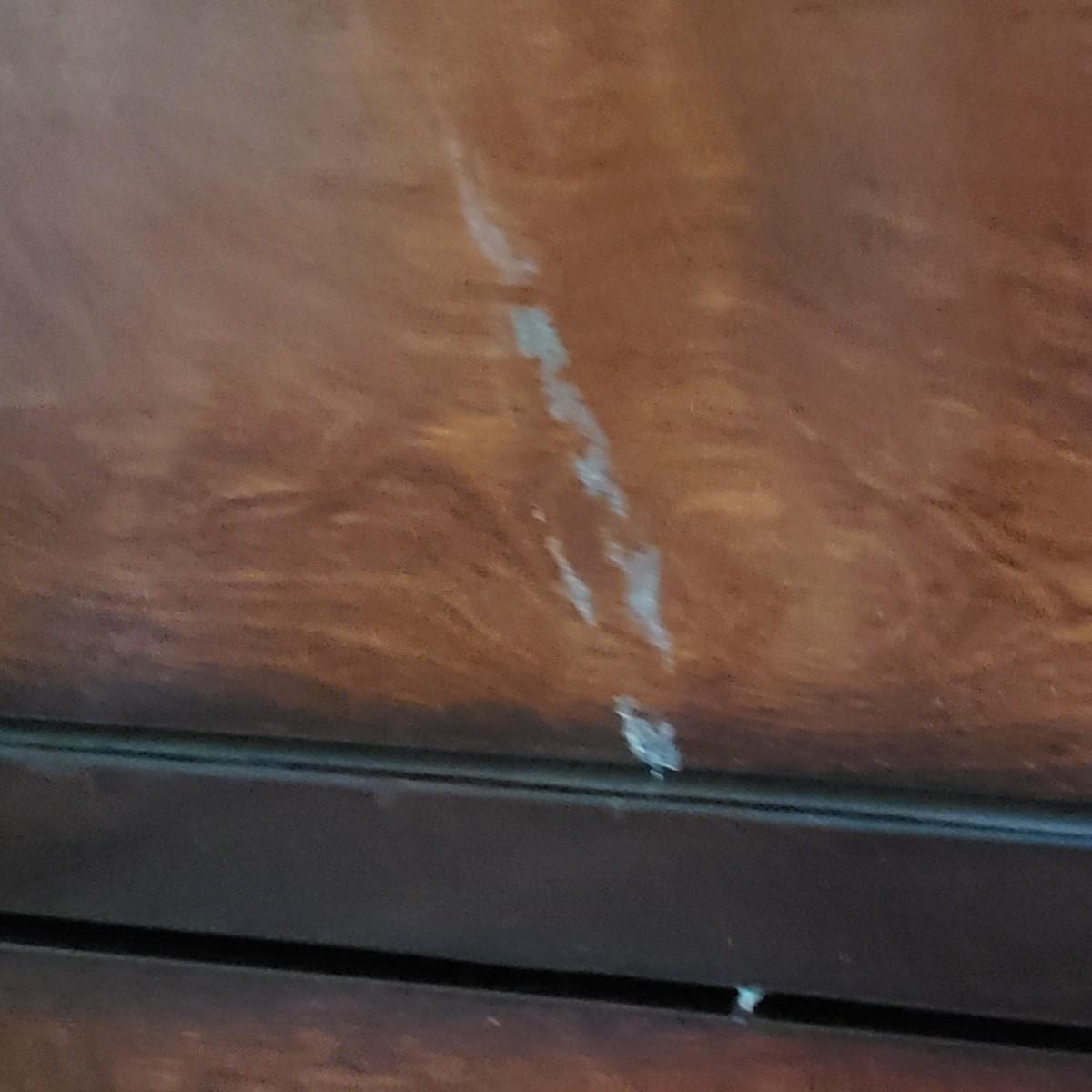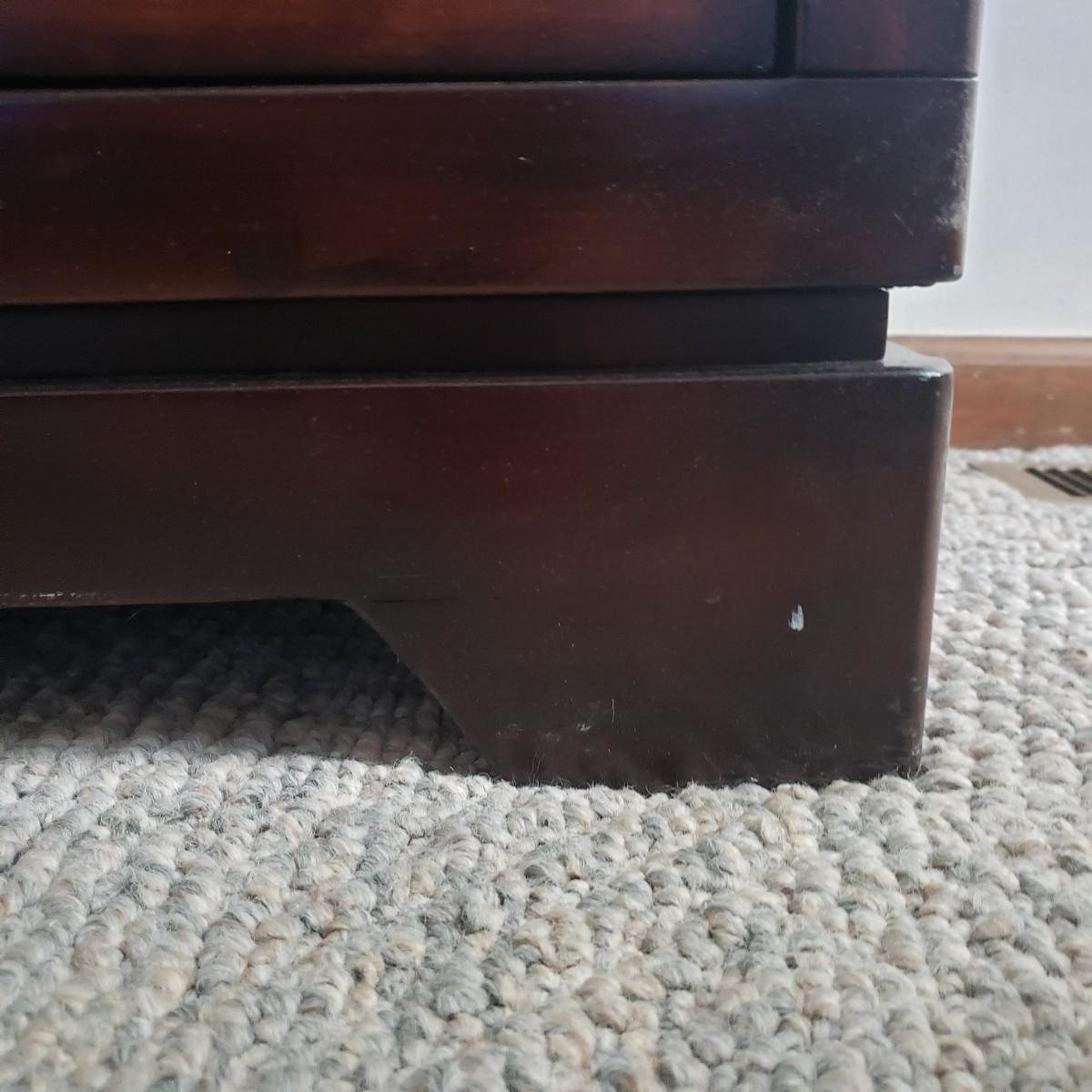 This is a two toned wooden dresser with attached mirror. The dresser comes with a glass topper. The dresser is curved outward, so the glass sticks out at the two corners, see pictures. The dresser measures 64" x 18" x 43"H. The mirror measures 52" x 38"H. The dresser has two cabinets with a fixed shelf in each. There are two large drawers and two smaller drawers. The handles are a silver metal. The dresser has some blemishes, see pictures. This piece does match a set listed as other lots in this sale. Local pickup only. This item is located on the ground floor with three steps down from the porch to the driveway.