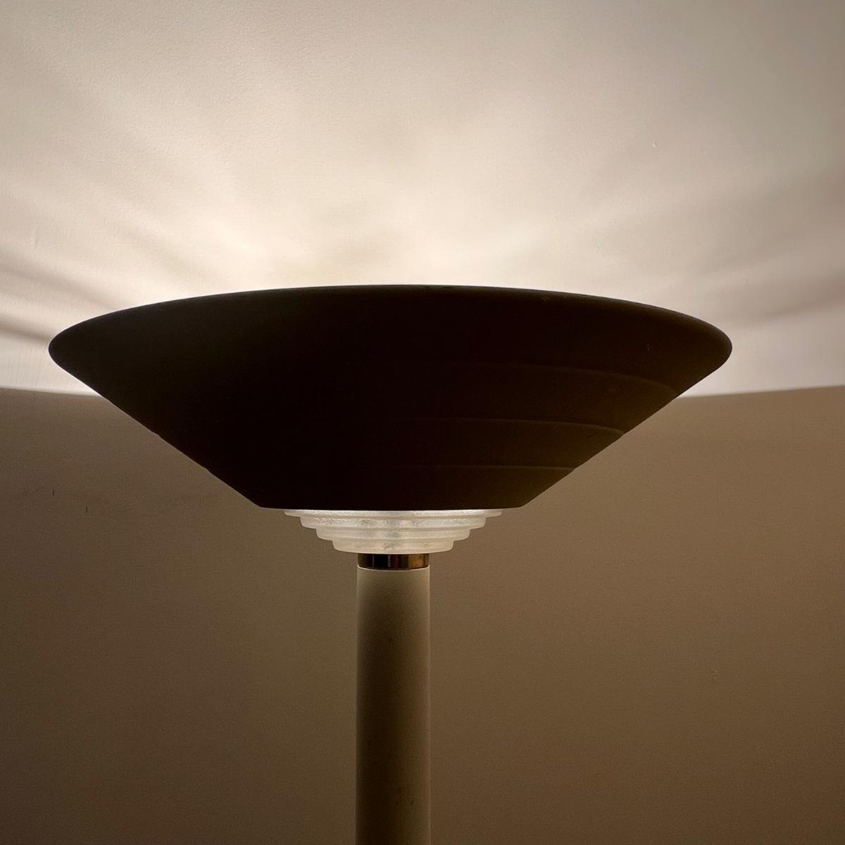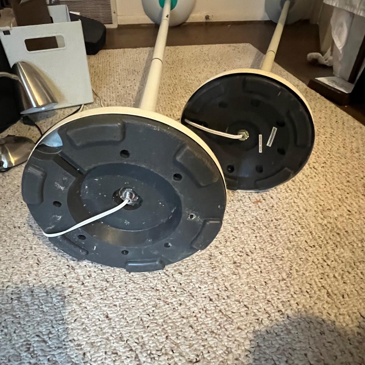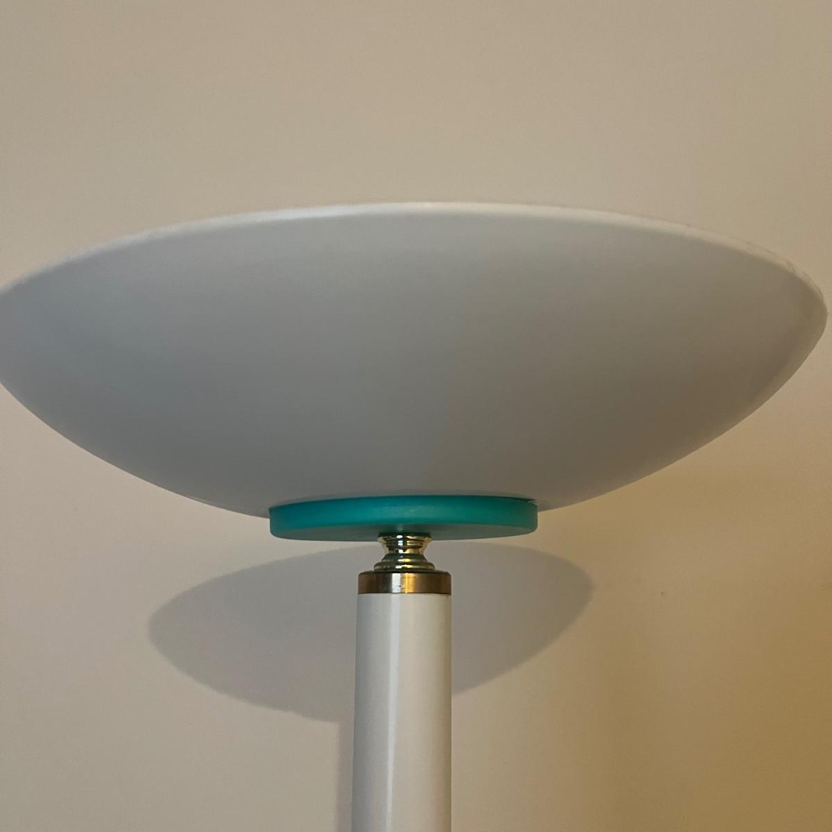 Both of these torchiere lamps stand 71”H ; lamp pictured on the left has a 12” base and this one has a dimmer switch, the other is a two way which offers two levels of lighting. They need cleaning.