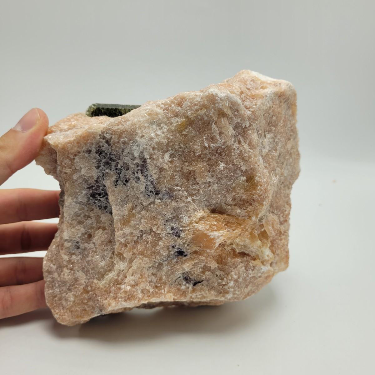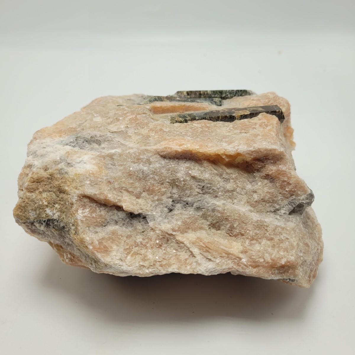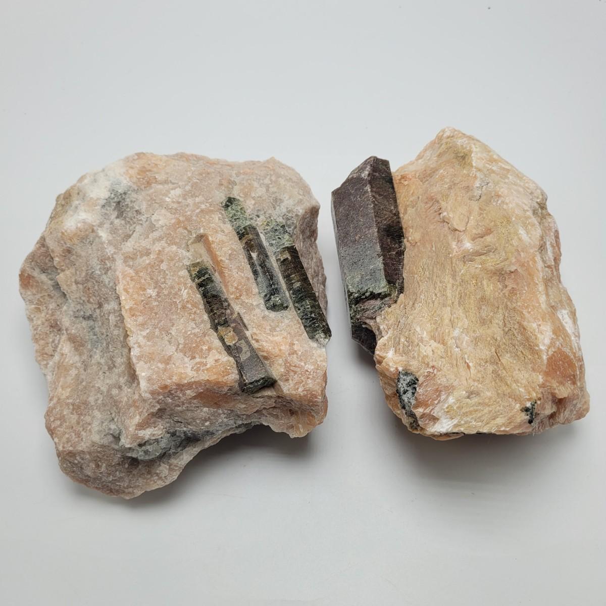 Contains two rocks that appear to be several pieces of tourmaline in rose quartz. Some pieces show watermelon tourmaline colors (red and green). Individually, the stones measure approximately 6.5" x 7" x 4.5"H. All sales are final. No returns or refunds. Please bid accordingly.