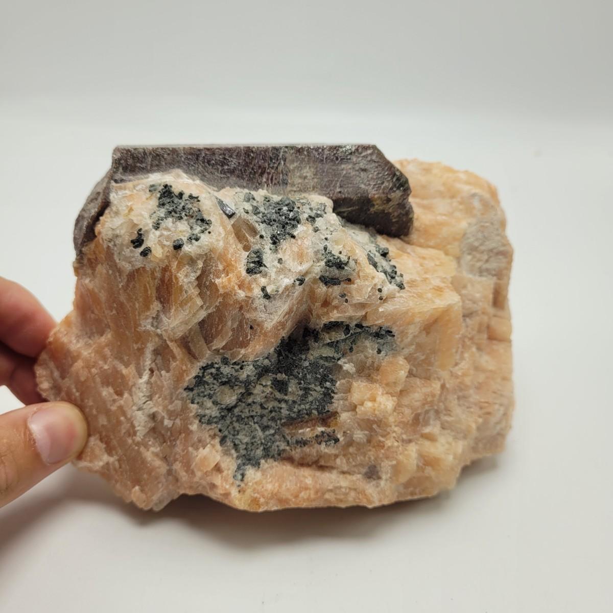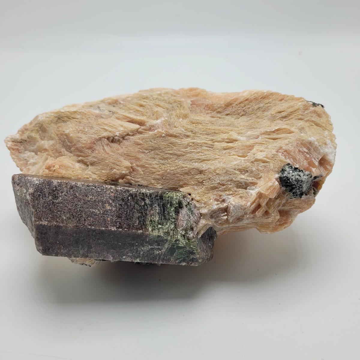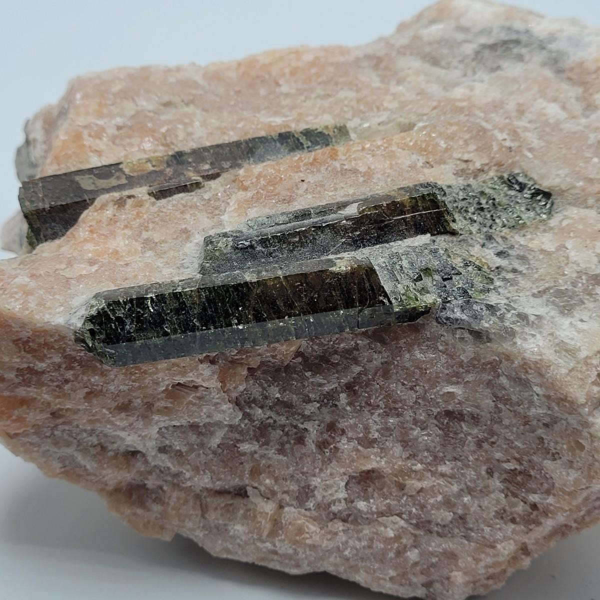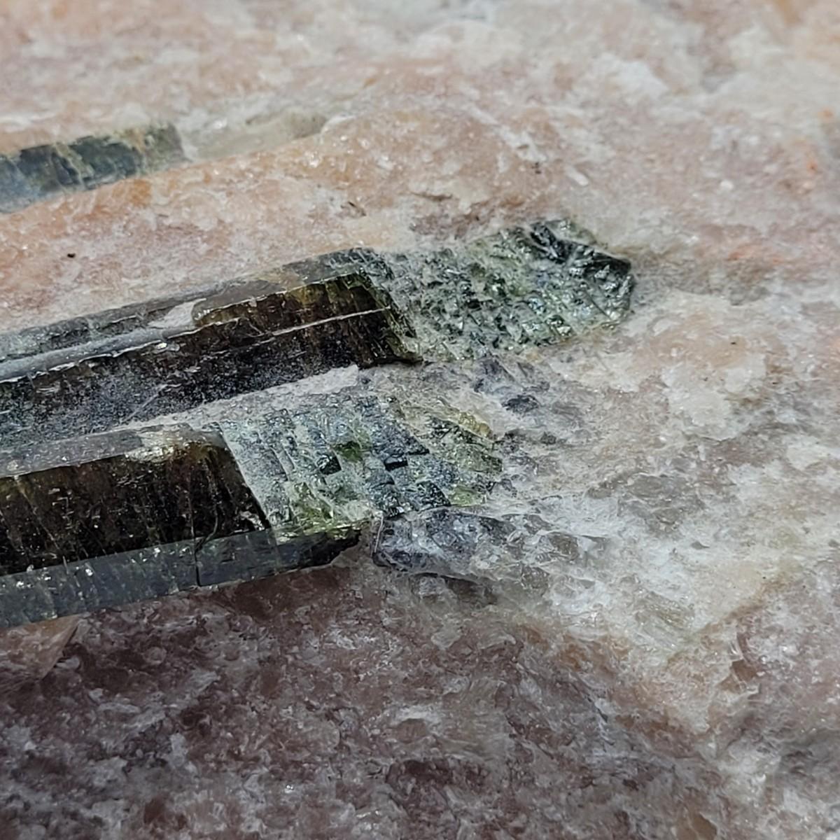 Contains two rocks that appear to be several pieces of tourmaline in rose quartz. Some pieces show watermelon tourmaline colors (red and green). Individually, the stones measure approximately 6.5" x 7" x 4.5"H. All sales are final. No returns or refunds. Please bid accordingly.