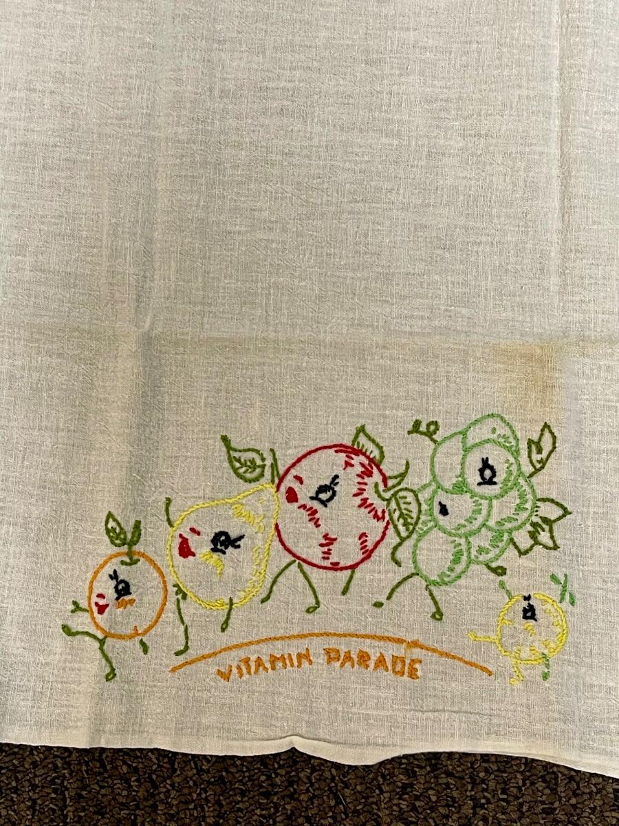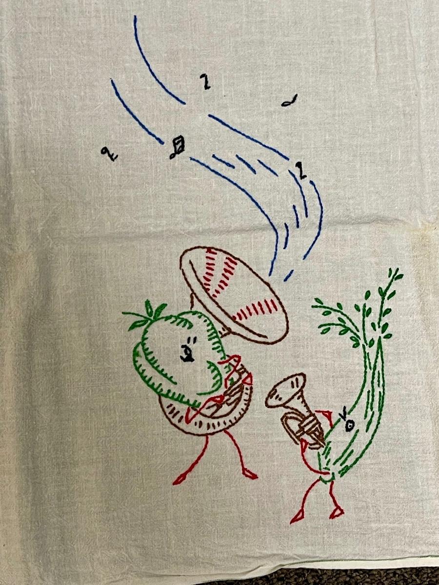 2 Embroidered 100.% Cotton Vintage Tea / Kitchen towel Musical Vegetables