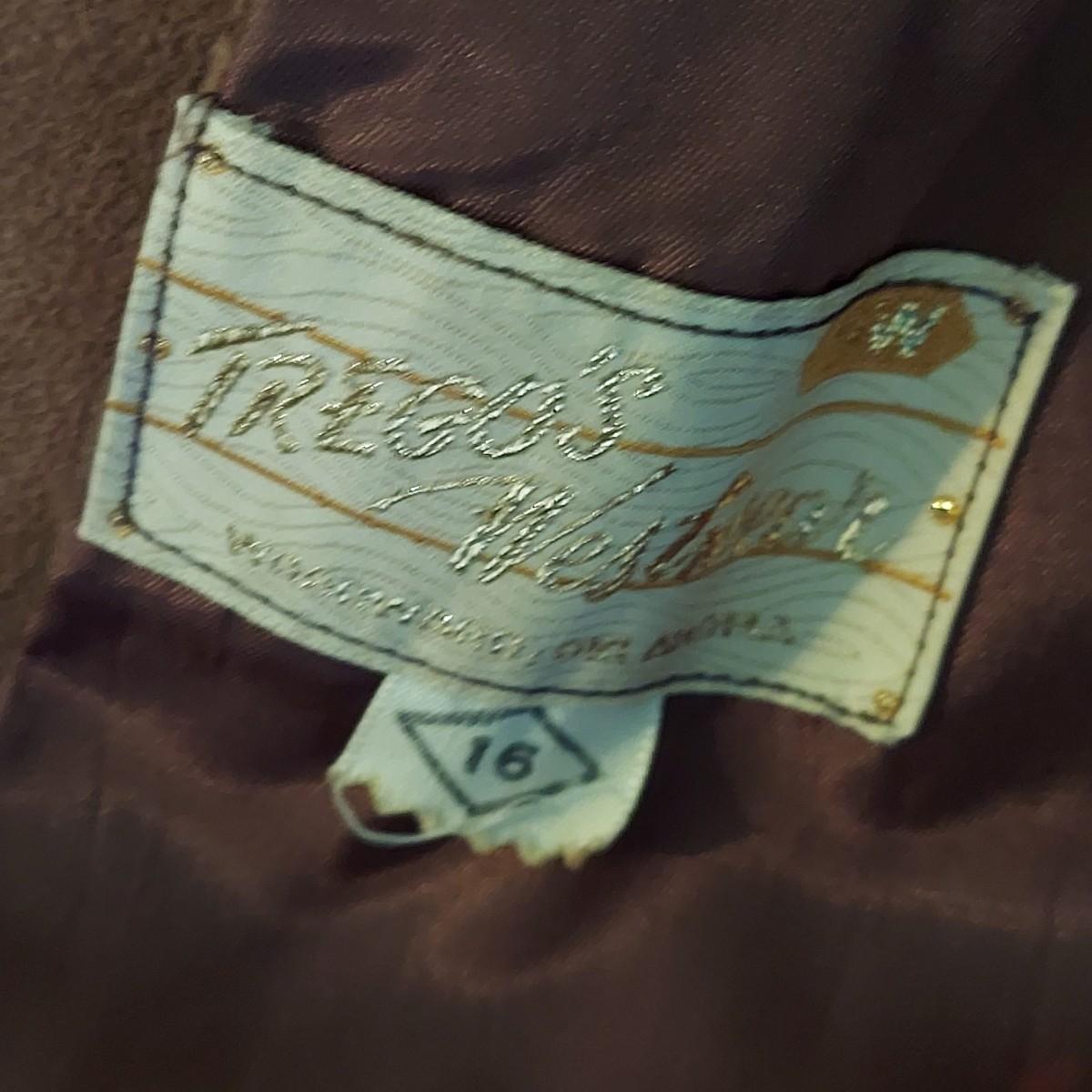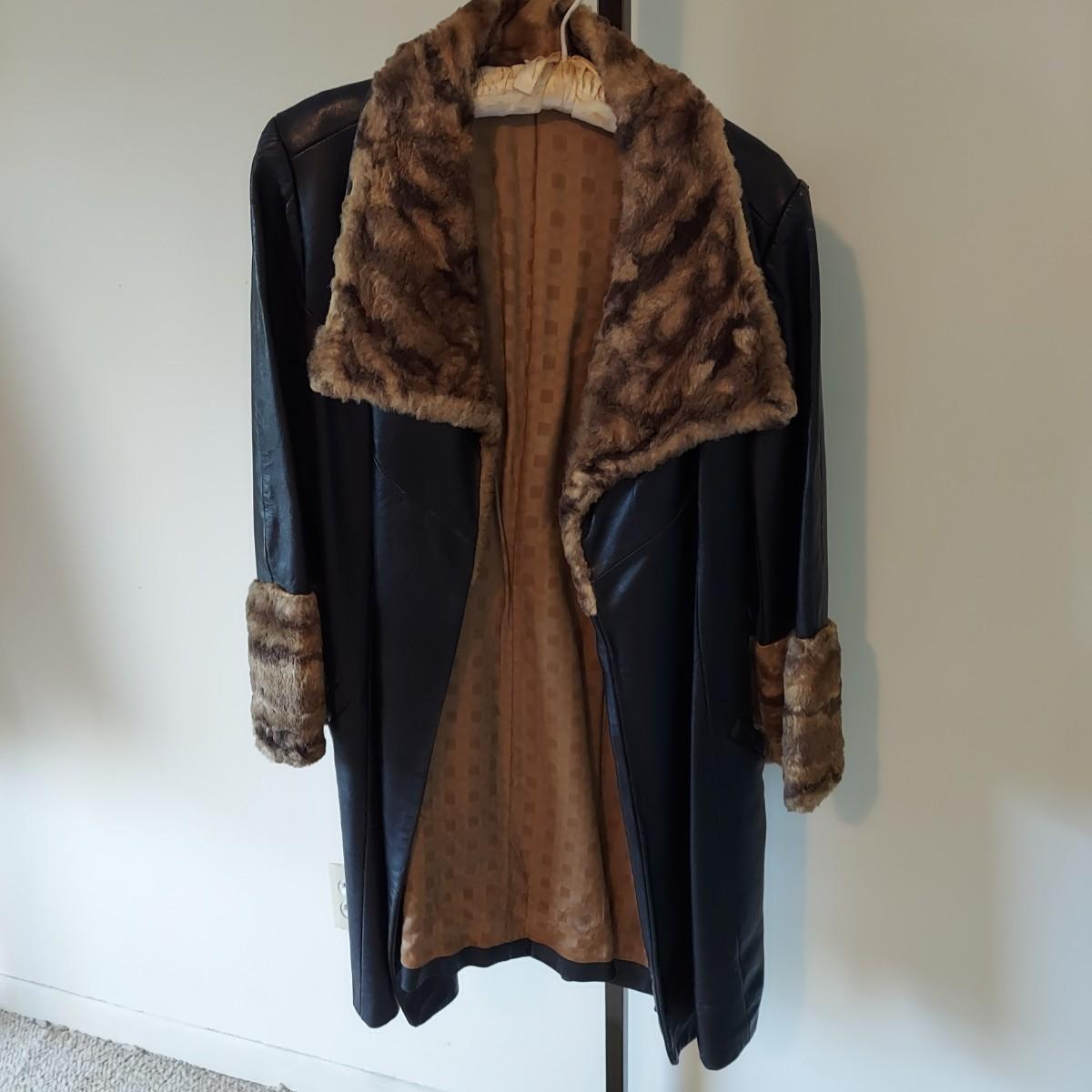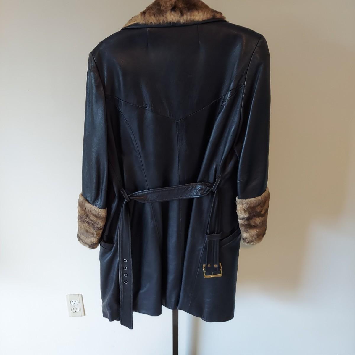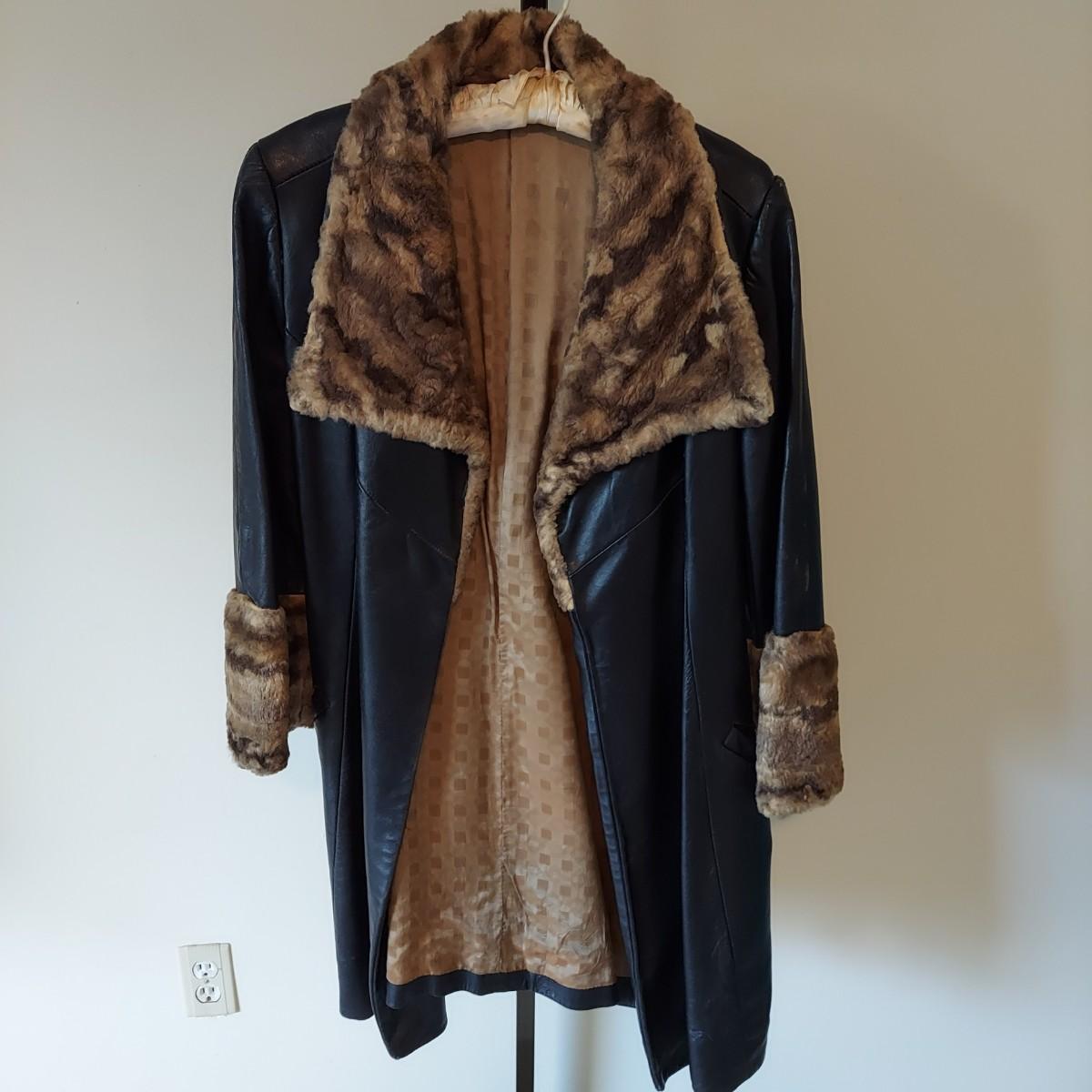 Two leather coats by Trego's Westwear Inc. that appear to be vintage. Best fits approximate size small to petite medium. The black leather trench style has faux fur trim. The brown leather waistcoat style has metal buttons. Both have some condition issues. Please see photos for details. Shipping available. Clothing racks are props and are not included in the auction!