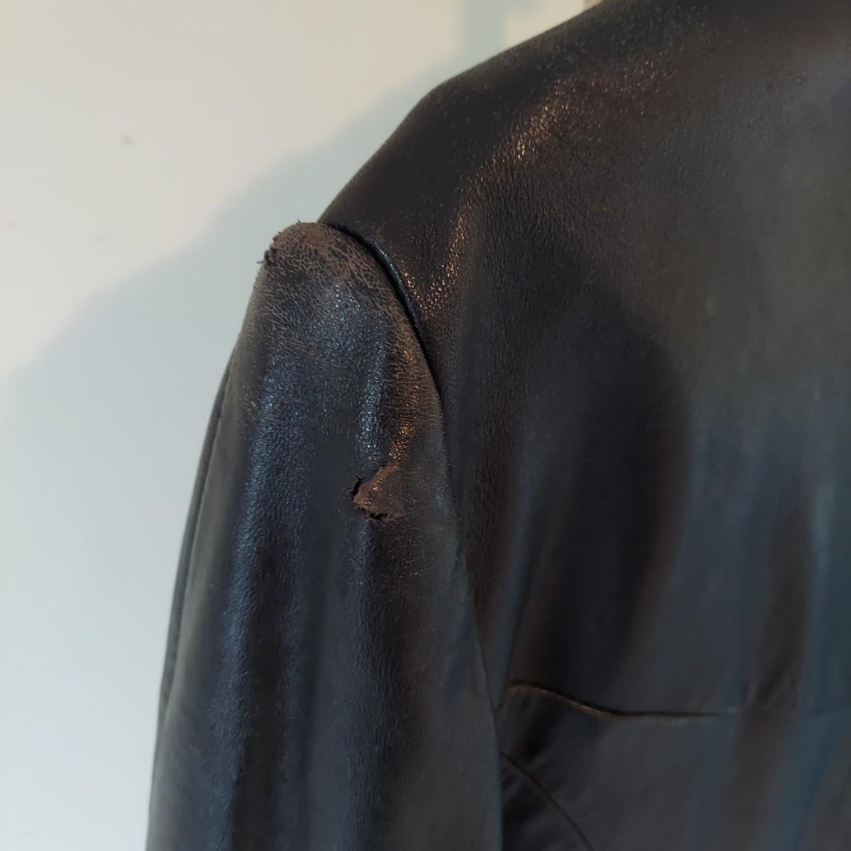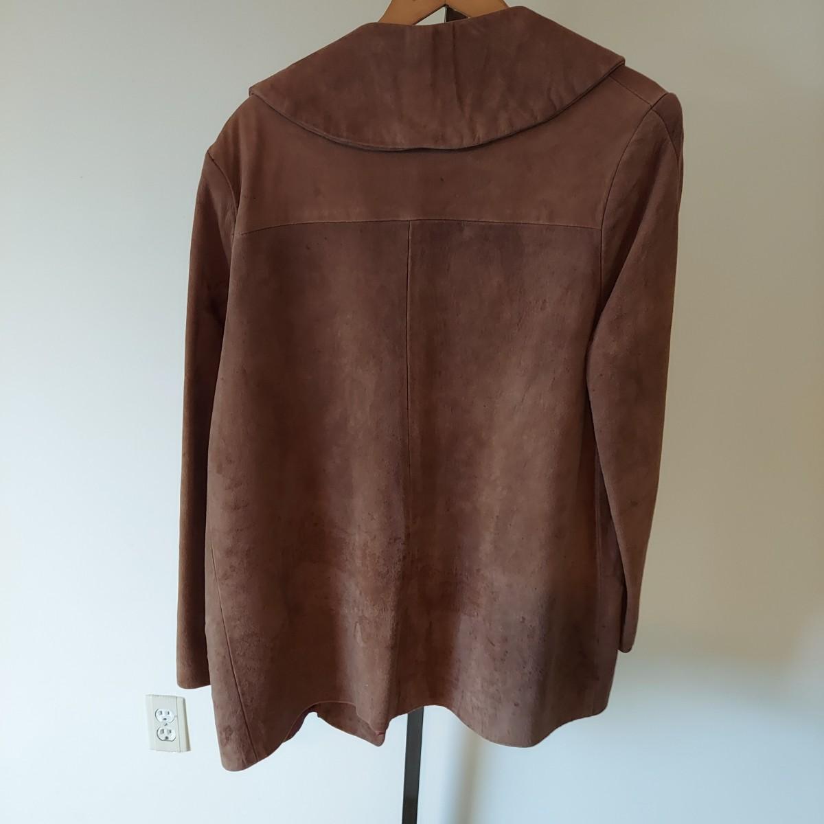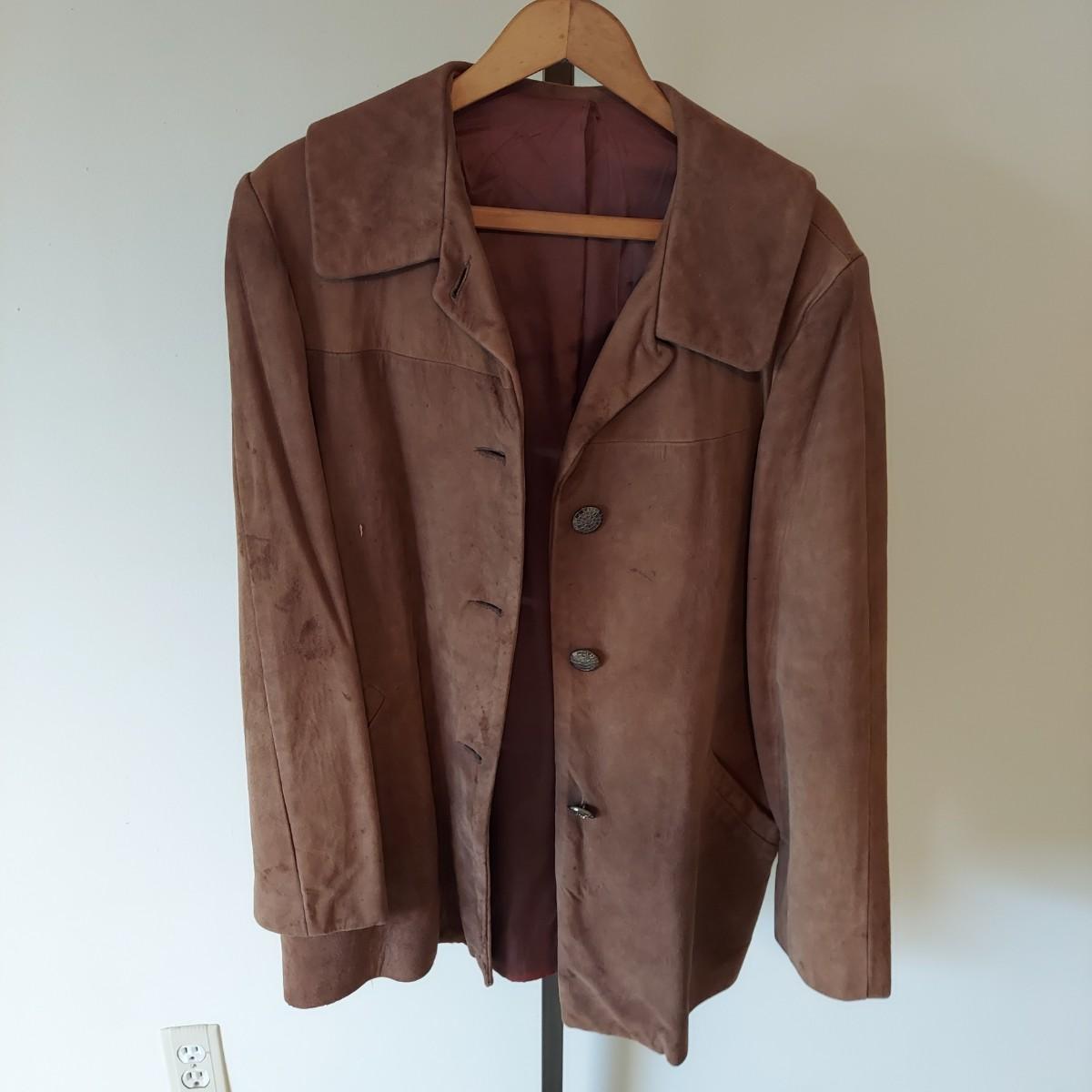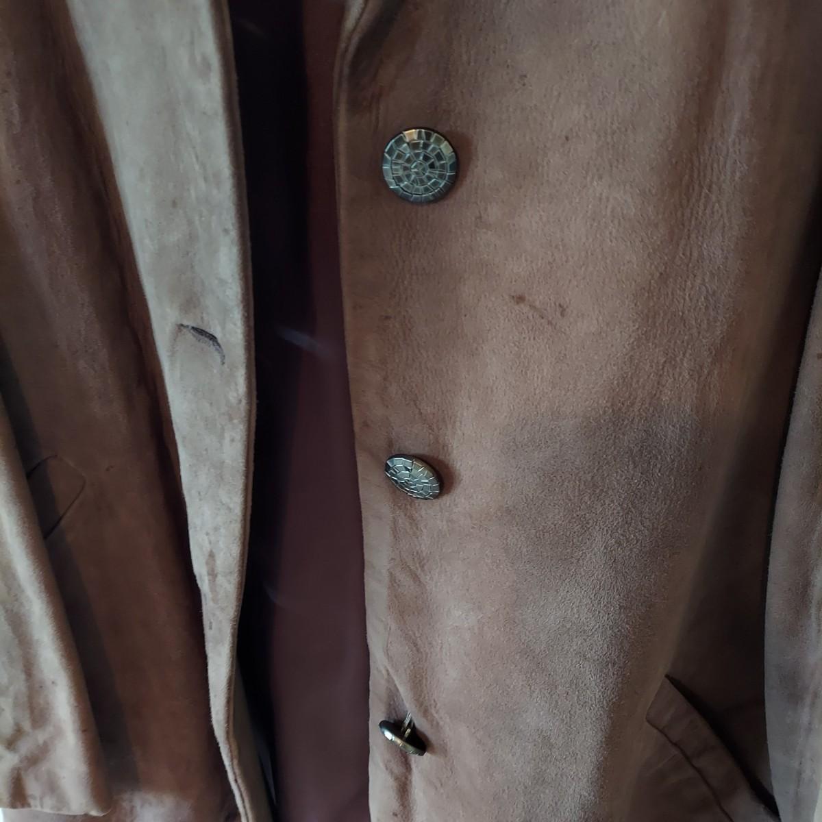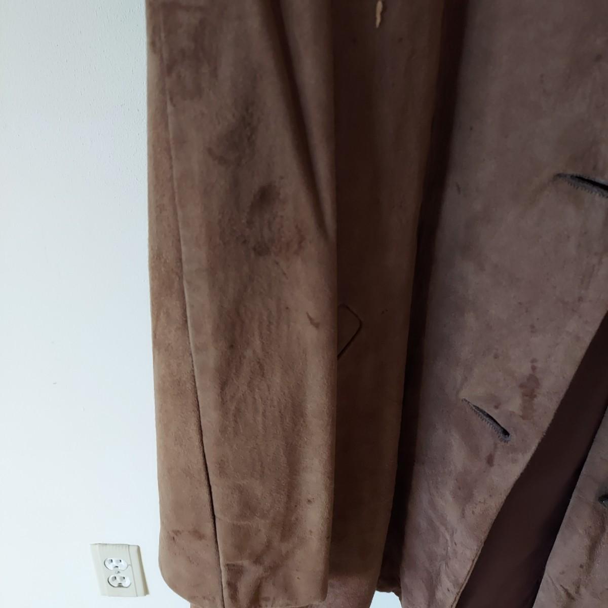 Two leather coats by Trego's Westwear Inc. that appear to be vintage. Best fits approximate size small to petite medium. The black leather trench style has faux fur trim. The brown leather waistcoat style has metal buttons. Both have some condition issues. Please see photos for details. Shipping available. Clothing racks are props and are not included in the auction!