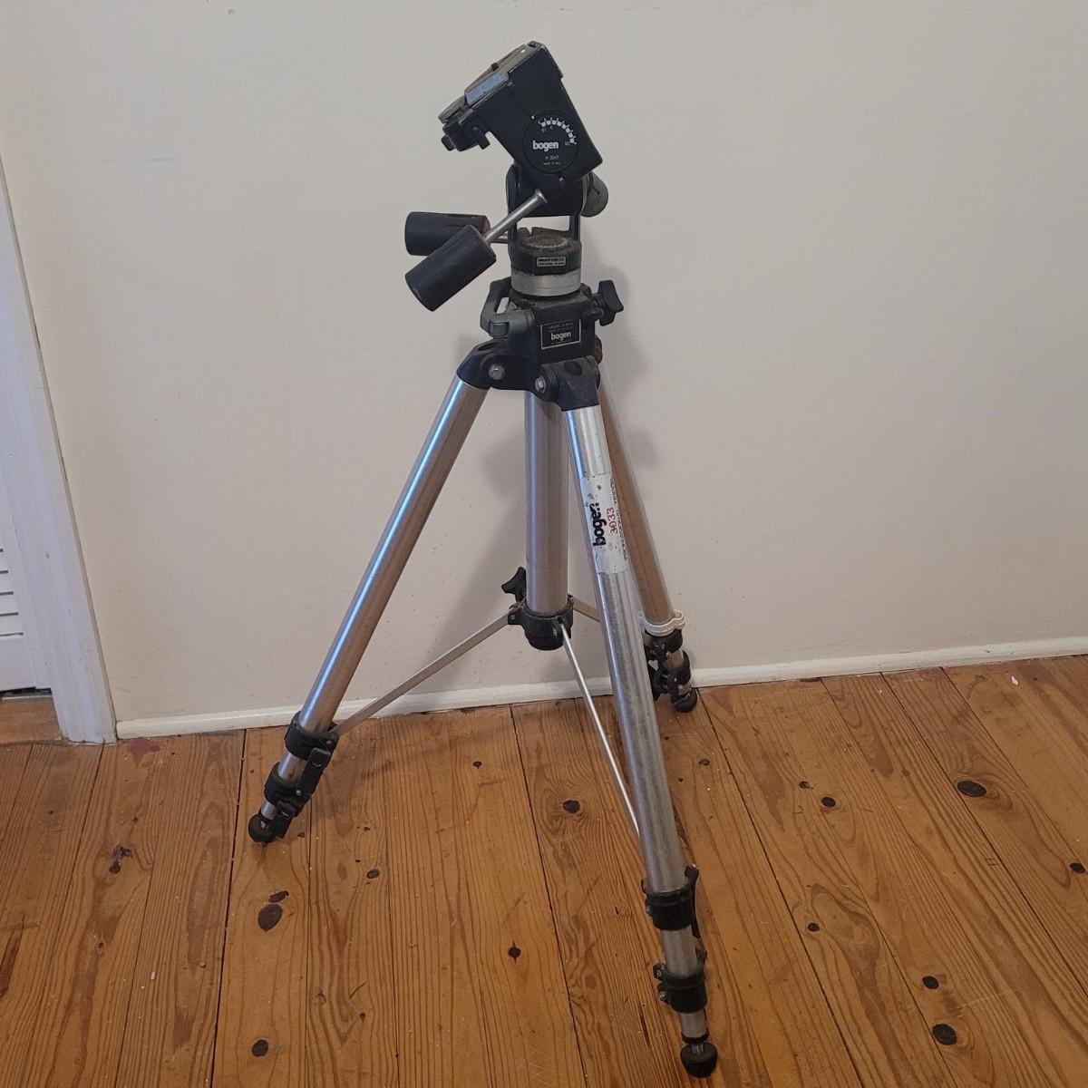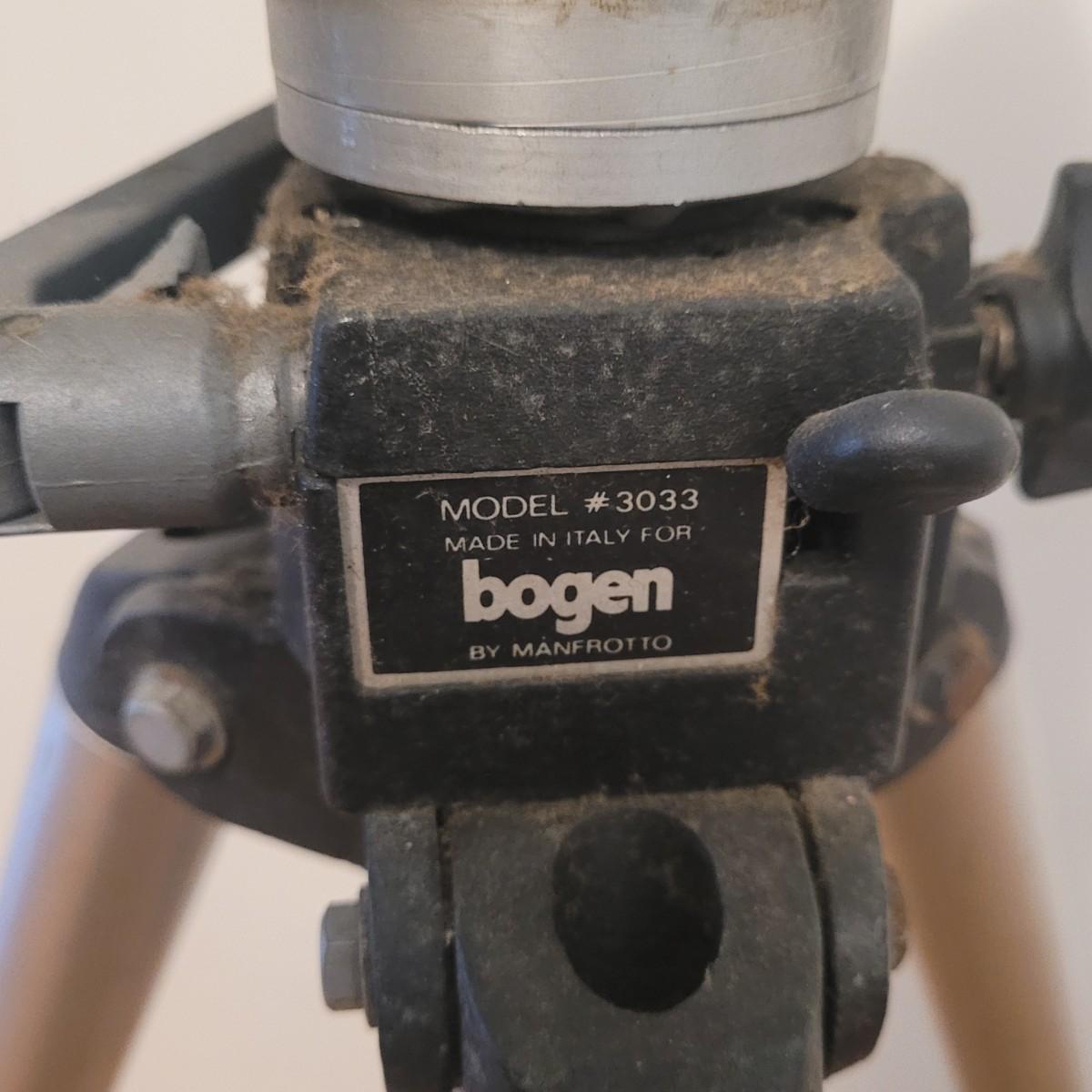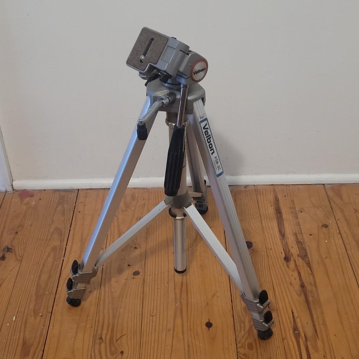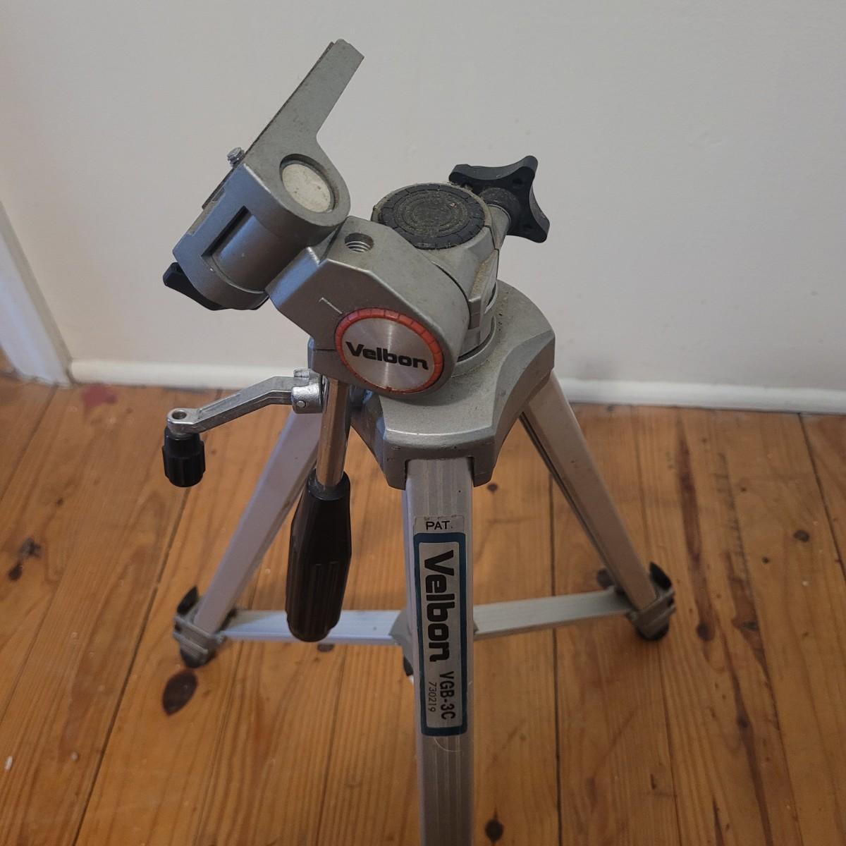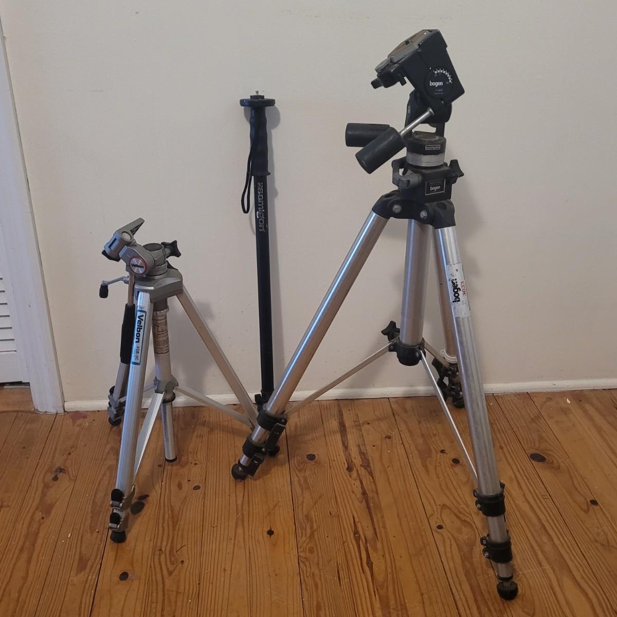 Three different types of camera stands. One Bogen brand professional tripod (model 3033) with a very sturdy metal frame. The Bogen measures 33"H to start and extends to 70"H. One Velbon brand tripod (model VGB-3C) also with a sturdy metal frame. The Velbon starts at 21"H and extends to 50"H.