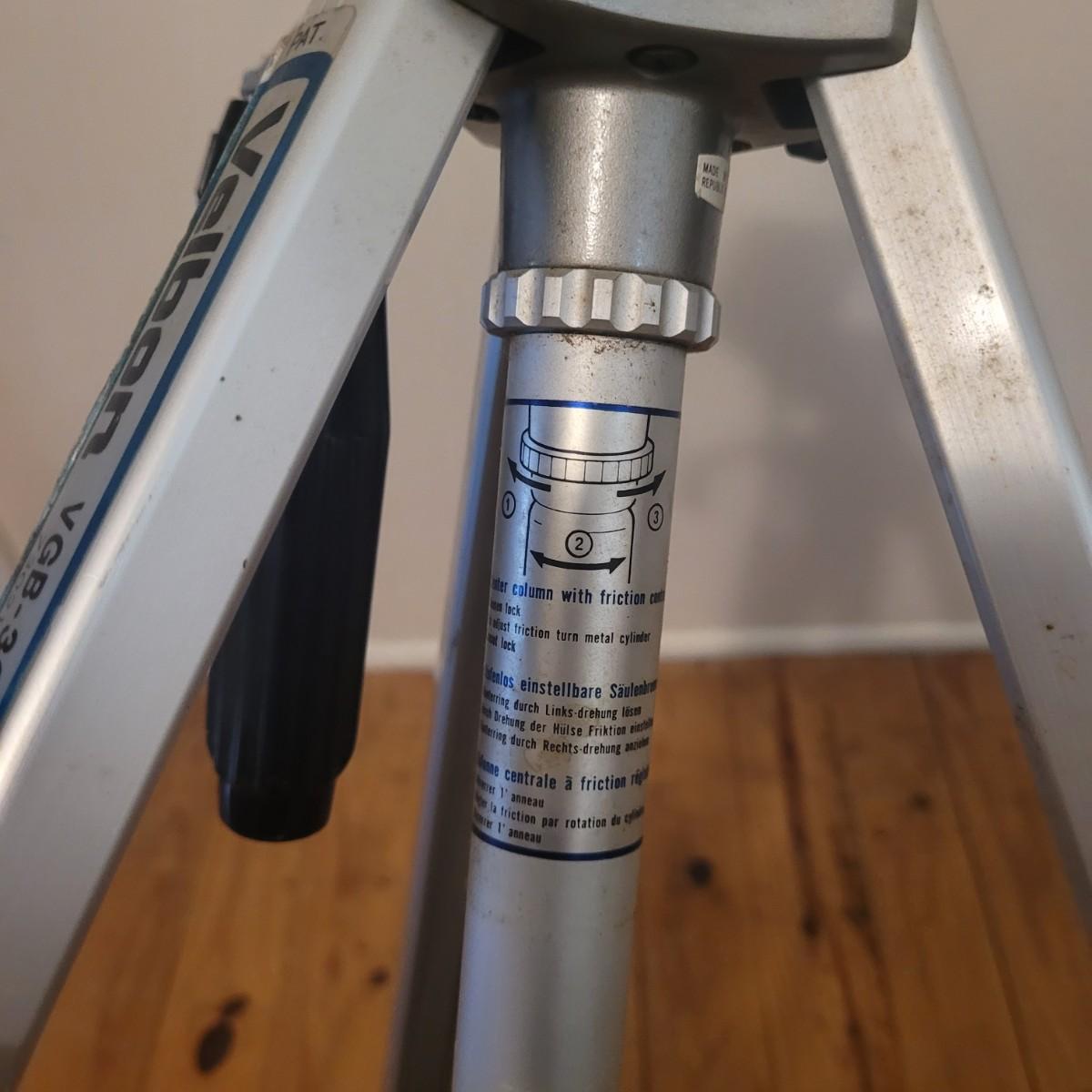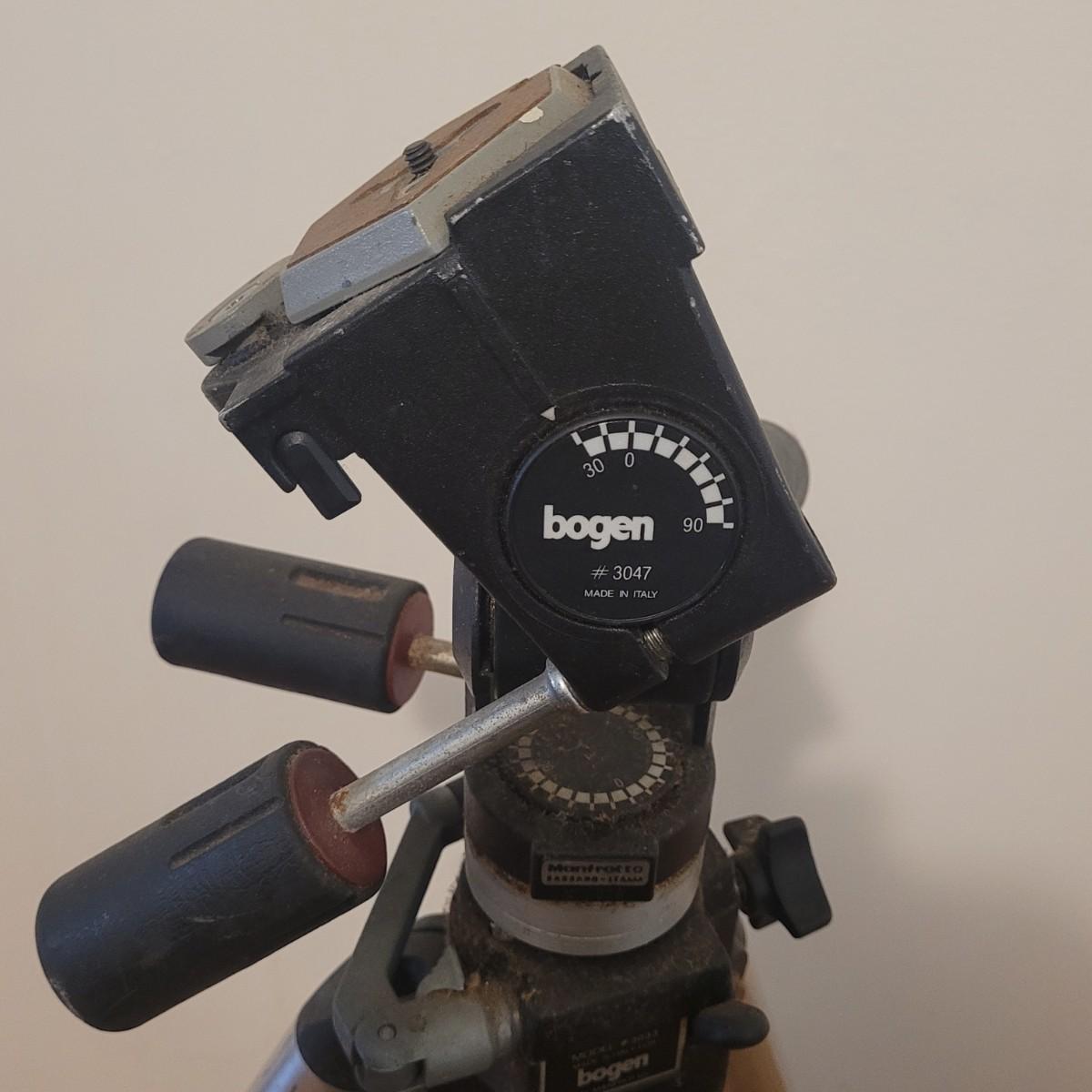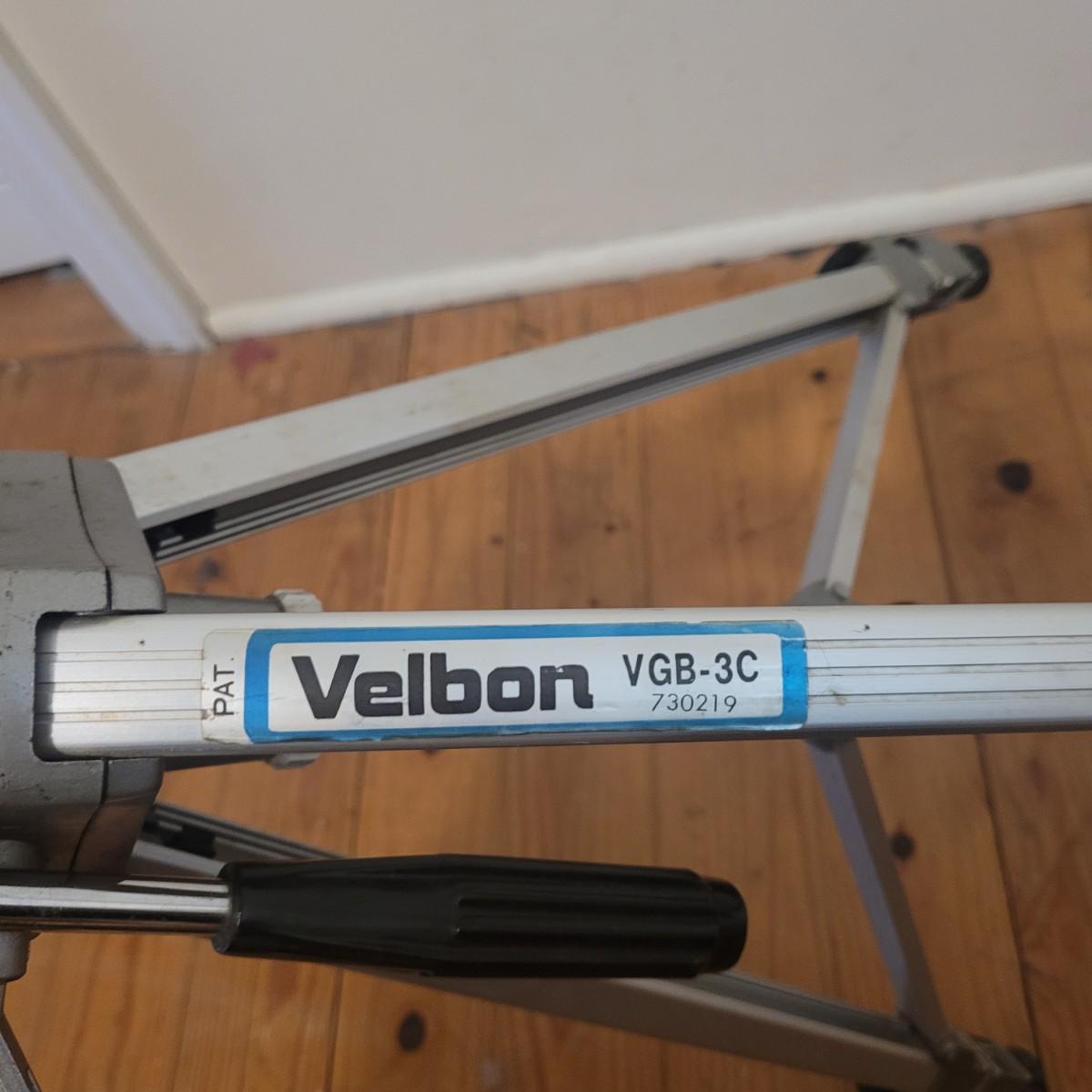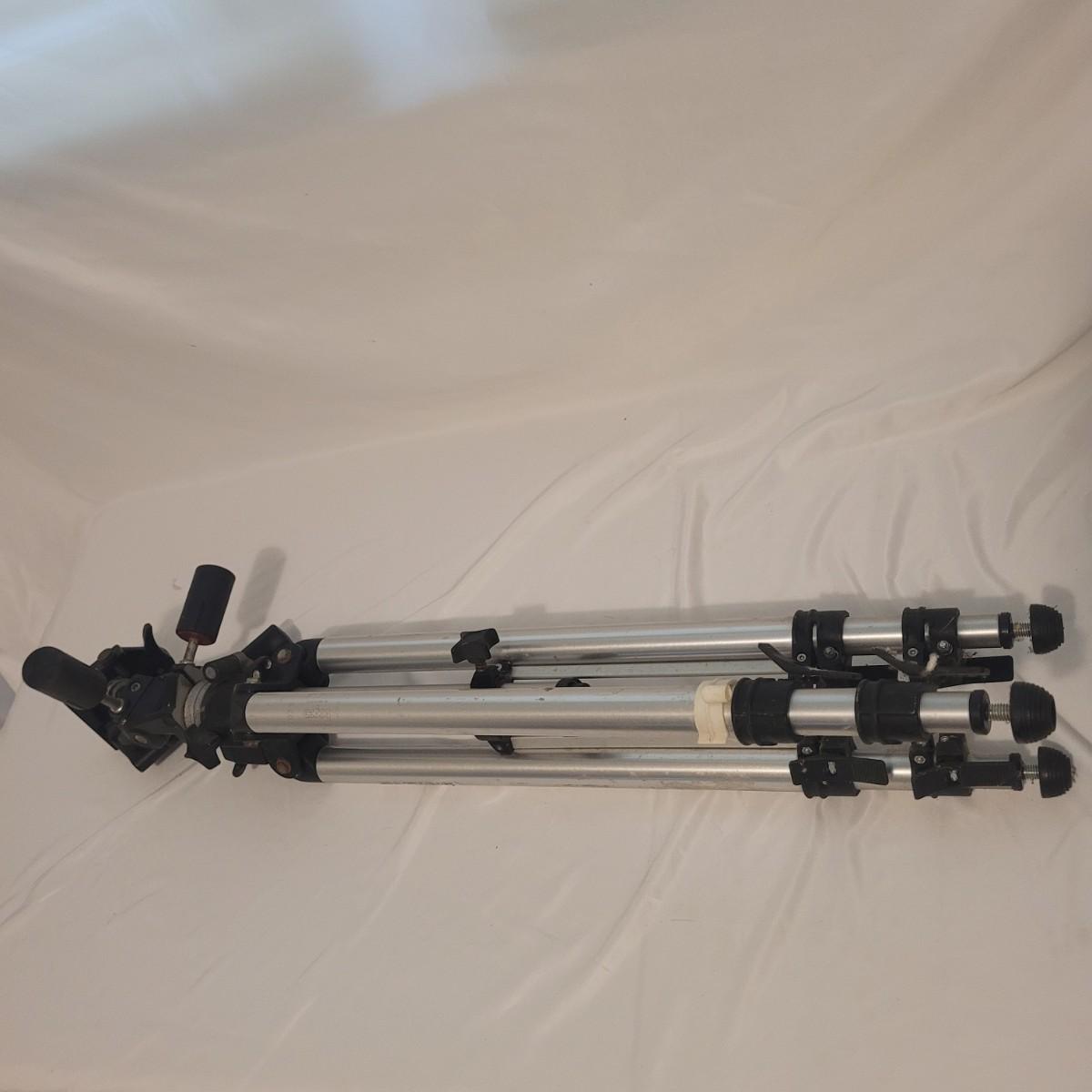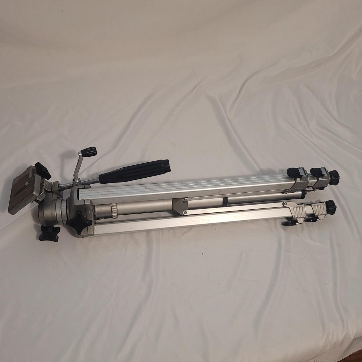 Three different types of camera stands. One Bogen brand professional tripod (model 3033) with a very sturdy metal frame. The Bogen measures 33"H to start and extends to 70"H. One Velbon brand tripod (model VGB-3C) also with a sturdy metal frame. The Velbon starts at 21"H and extends to 50"H.