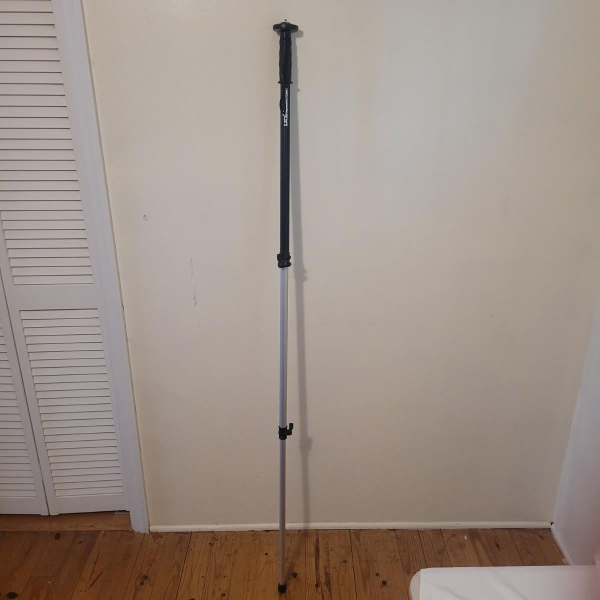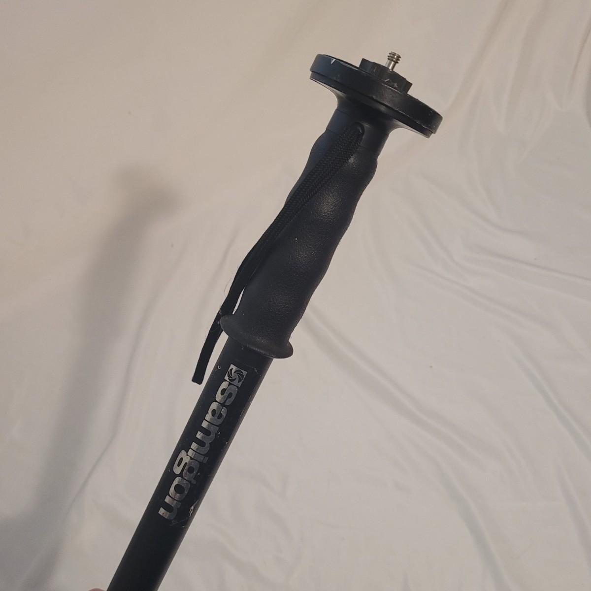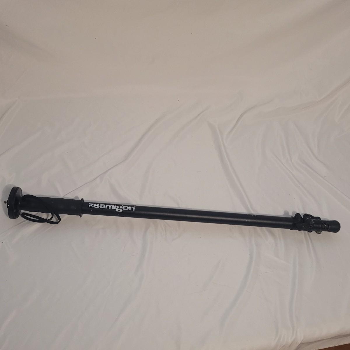 The monopod is Samigon brand, is made from metal, starts at 27"H and extends to 66"H.