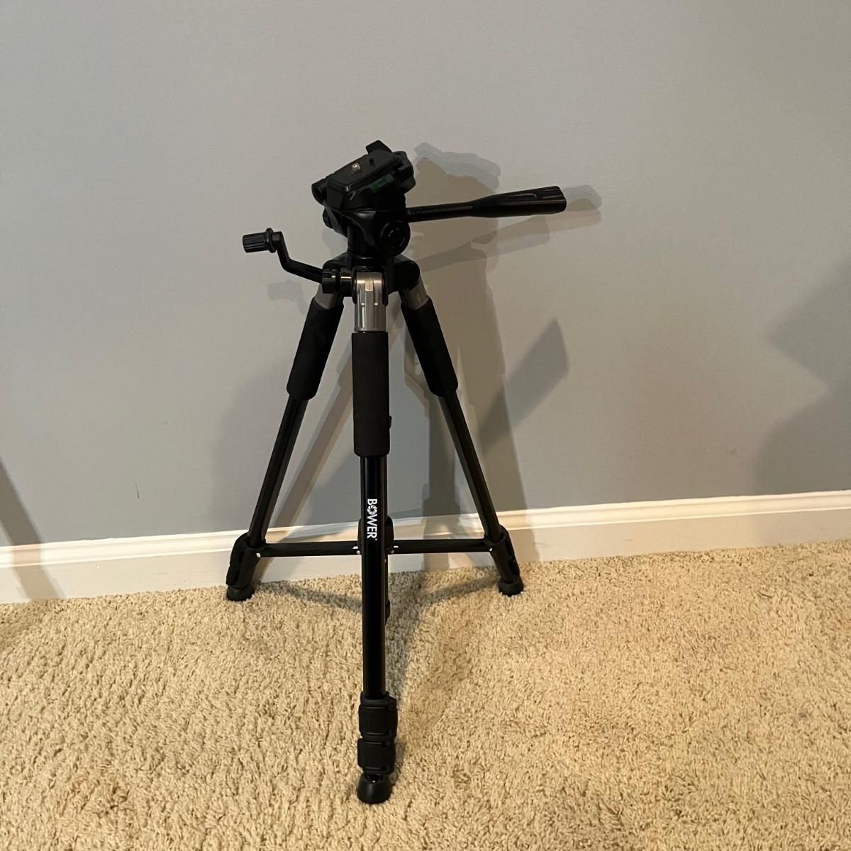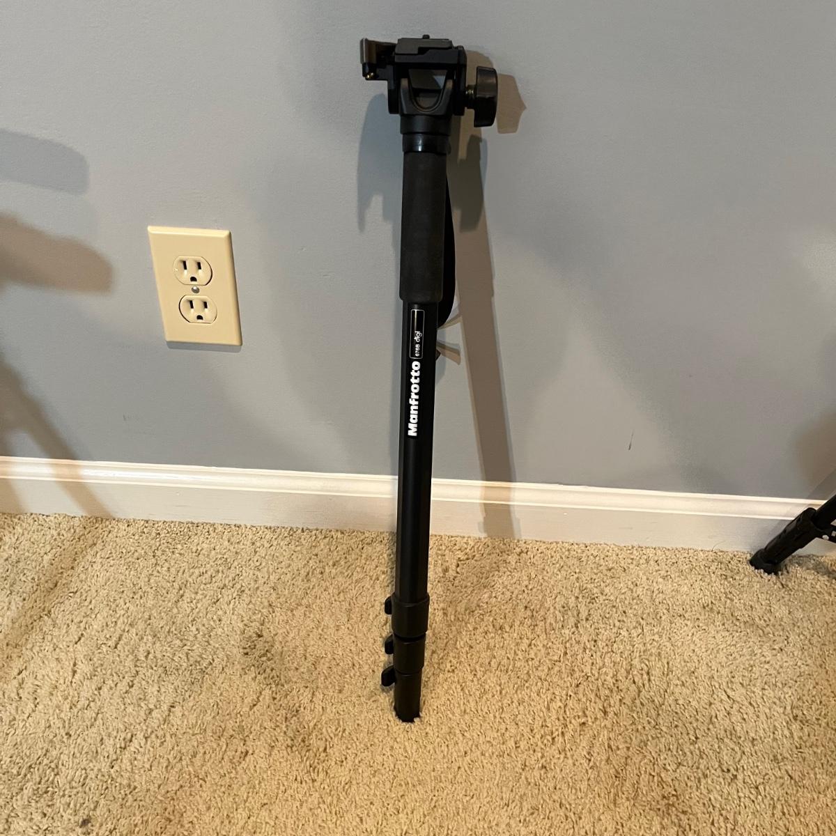 Lot includes a Manfrotto tripod and monopod, Bower Tripod and stabilizer pad. Monopod measures 63” tall when extended.