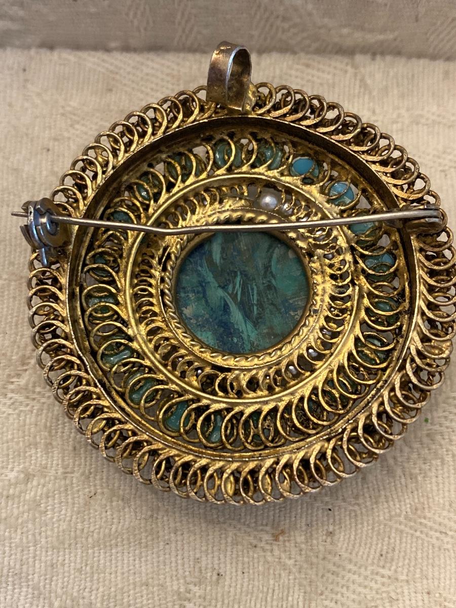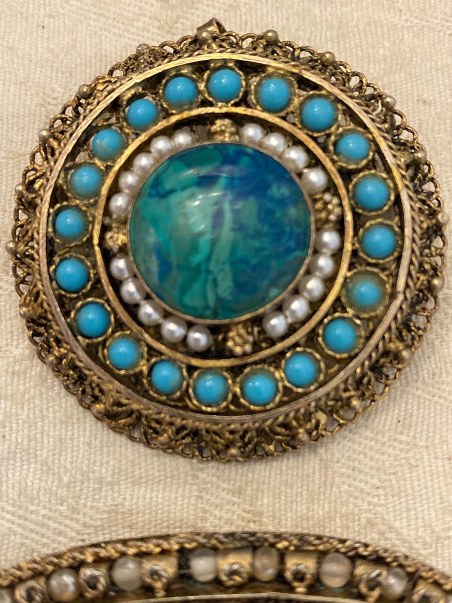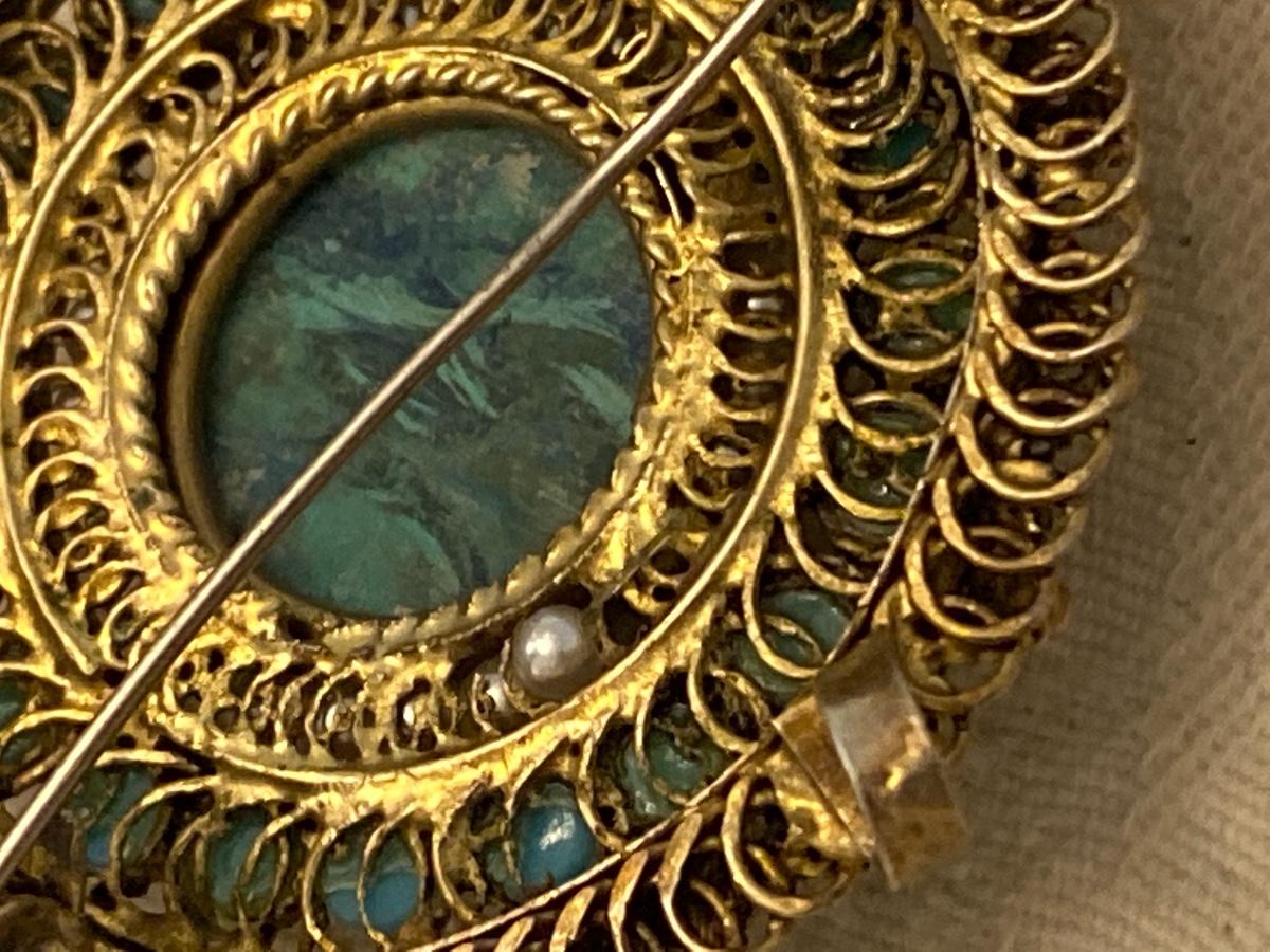 A round brooch with a turquoise colored stone in the center surrounded by seed pearls and set in gold tone metal filigree. Measures 2” diameter. Not stamped