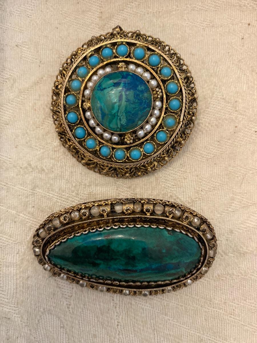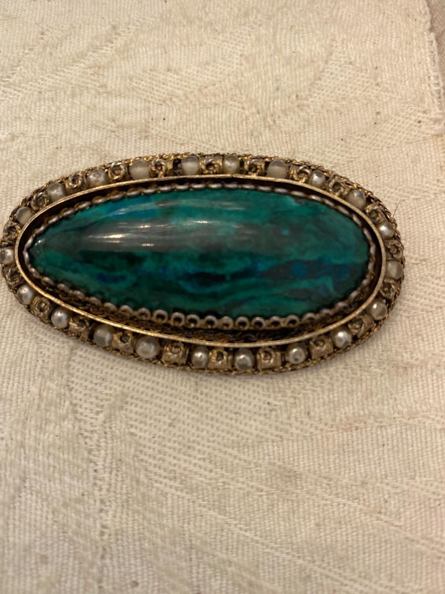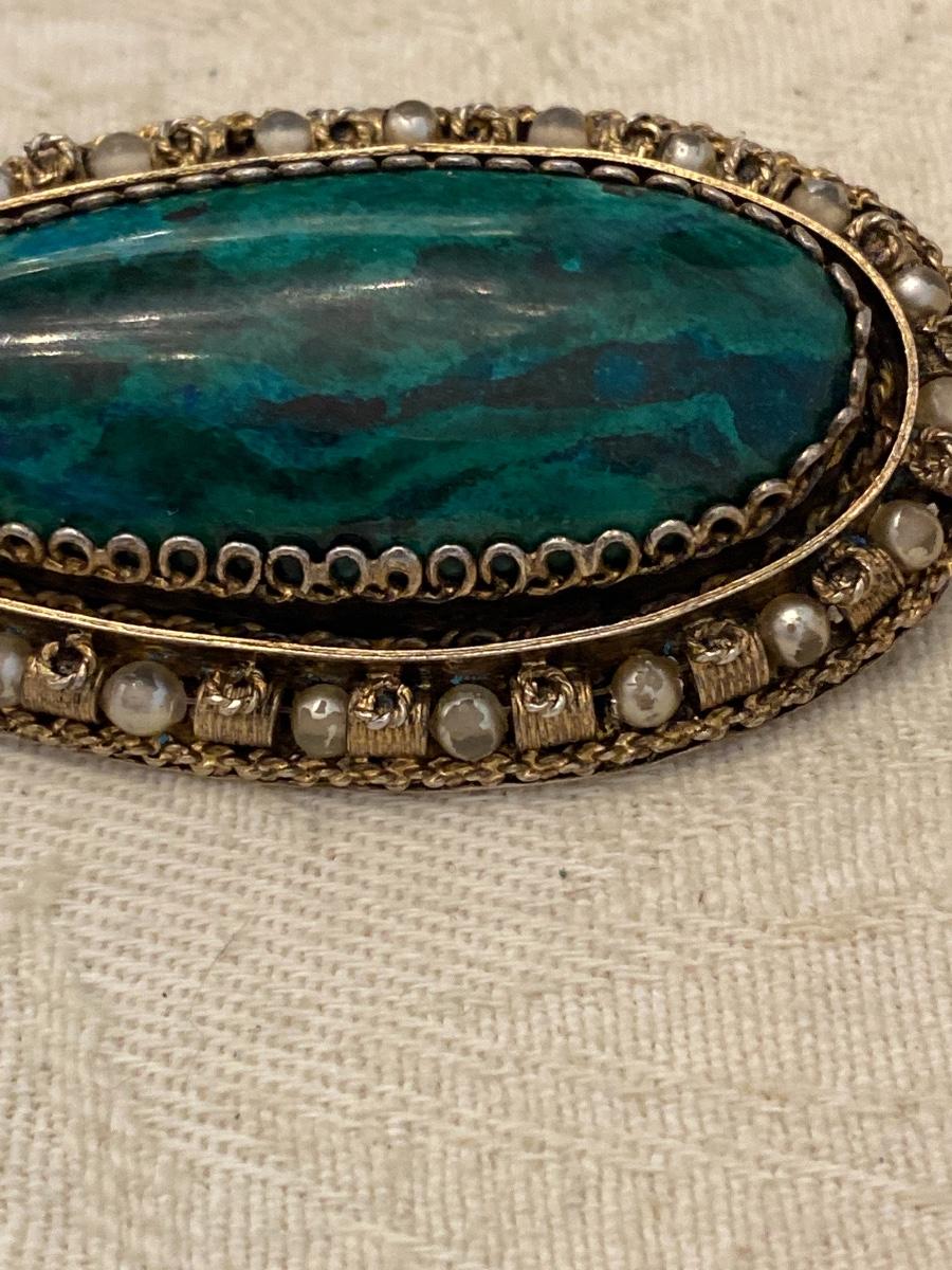 A round brooch with a turquoise colored stone in the center surrounded by seed pearls and set in gold tone metal filigree. Measures 2” diameter. Not stamped