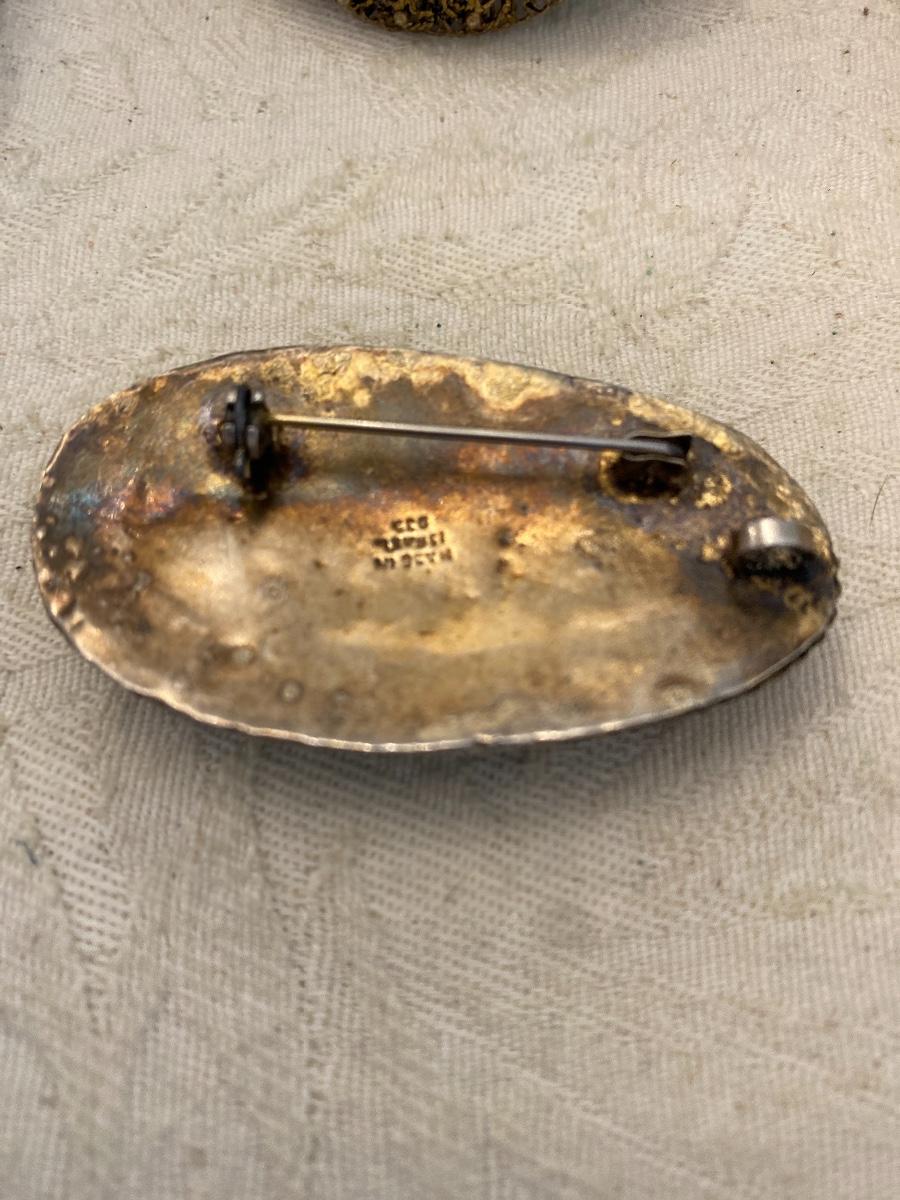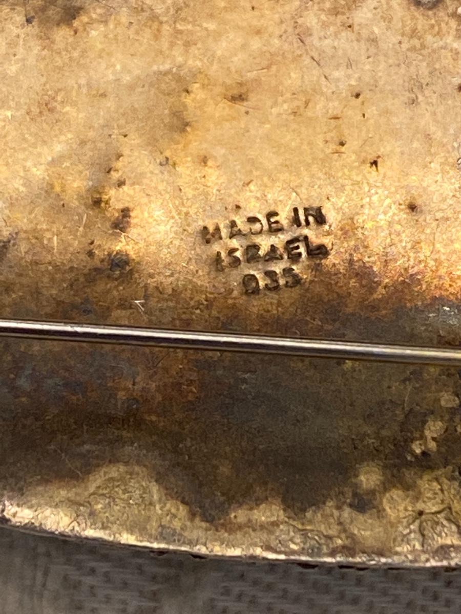 An oval brooch/pendant with a turquoise colored stone in the center. The back is stamped Made In Israel 935. Measures 2”w x 1-1:4”h.