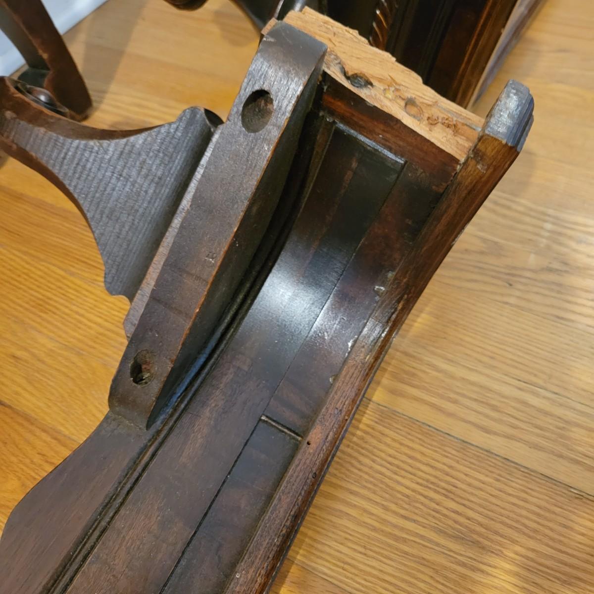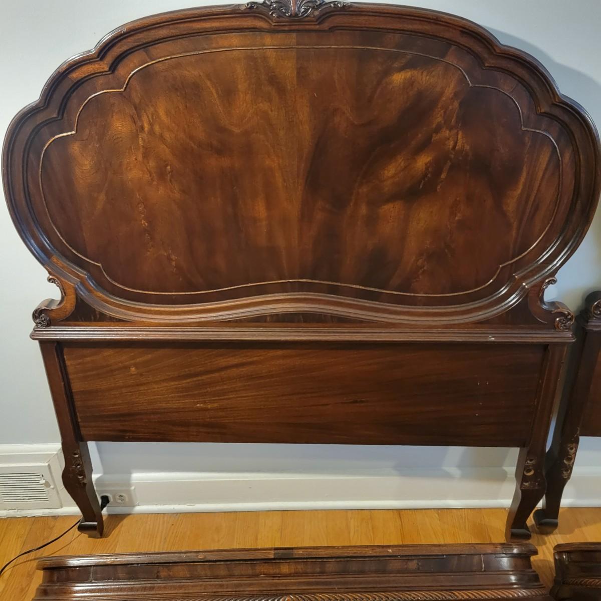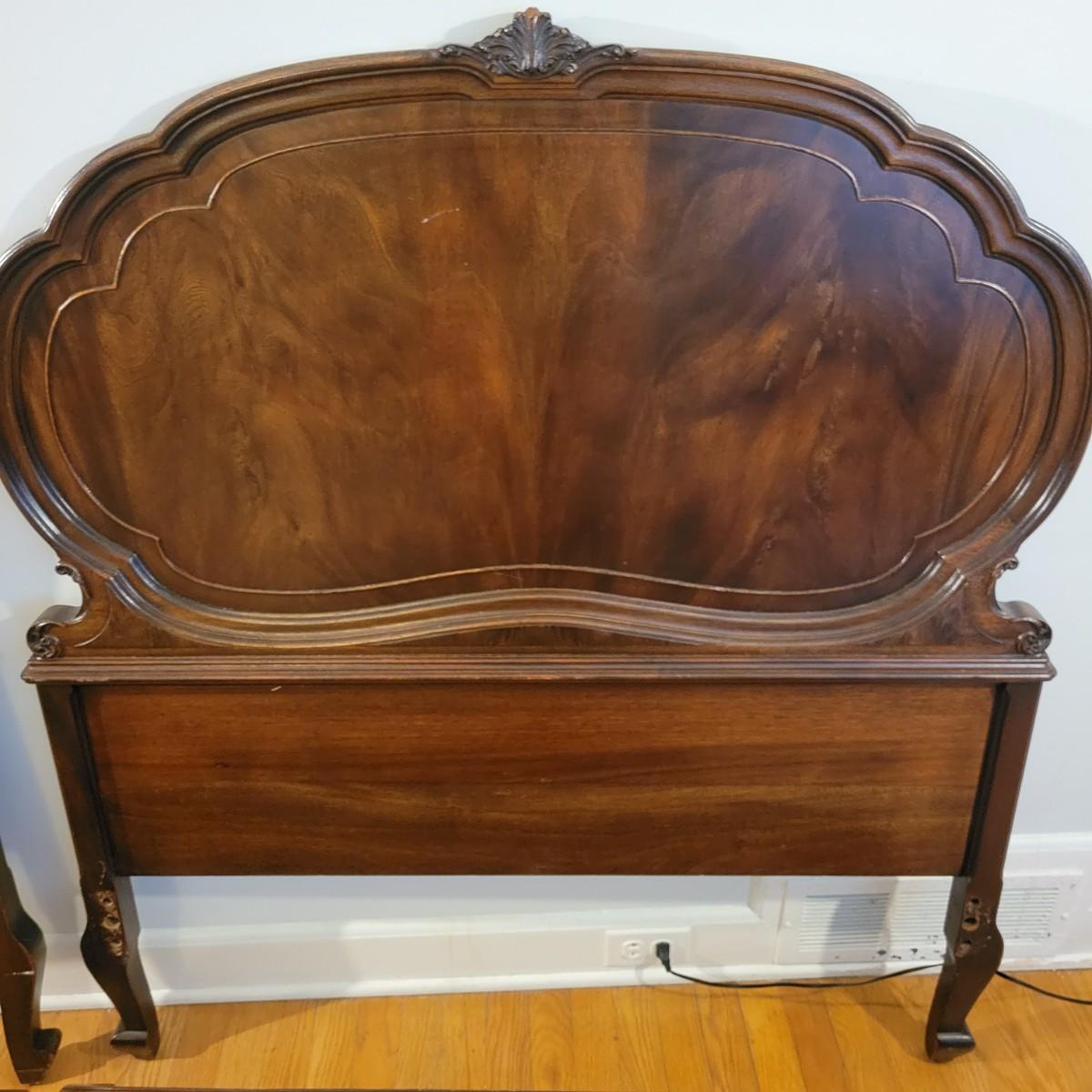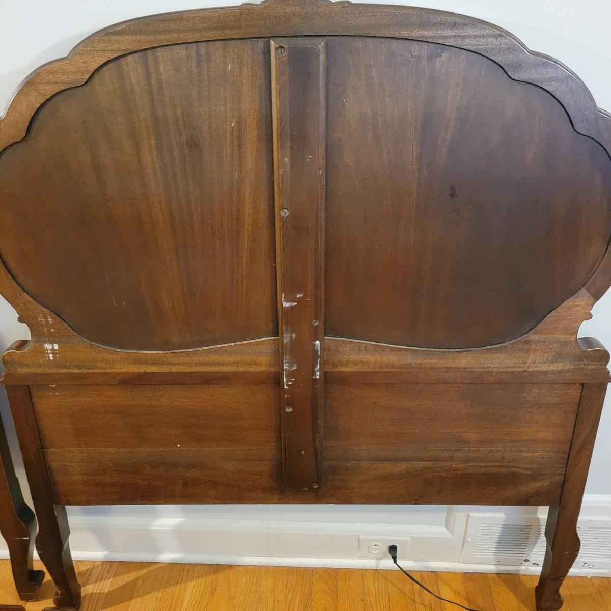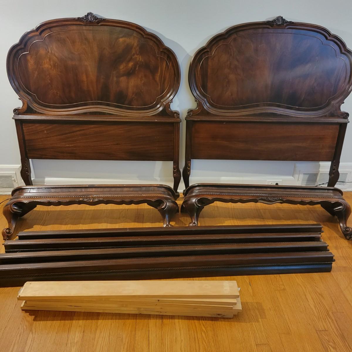 Two solid wood, antique twin bed frames in good condition, but with some damage on the footboards. One footboard is missing a piece of wood where the side rail mounts, but the broken piece is with the lot. The other footboard is missing wood from both sides where side rail mounts. There are wood pieces included in the lot for one side and repair has been attempted on it. See pictures for more detail. Lot also includes 6 wooden slats. Measures approximately 43.5" x 77" x 48.5" Local pickup only