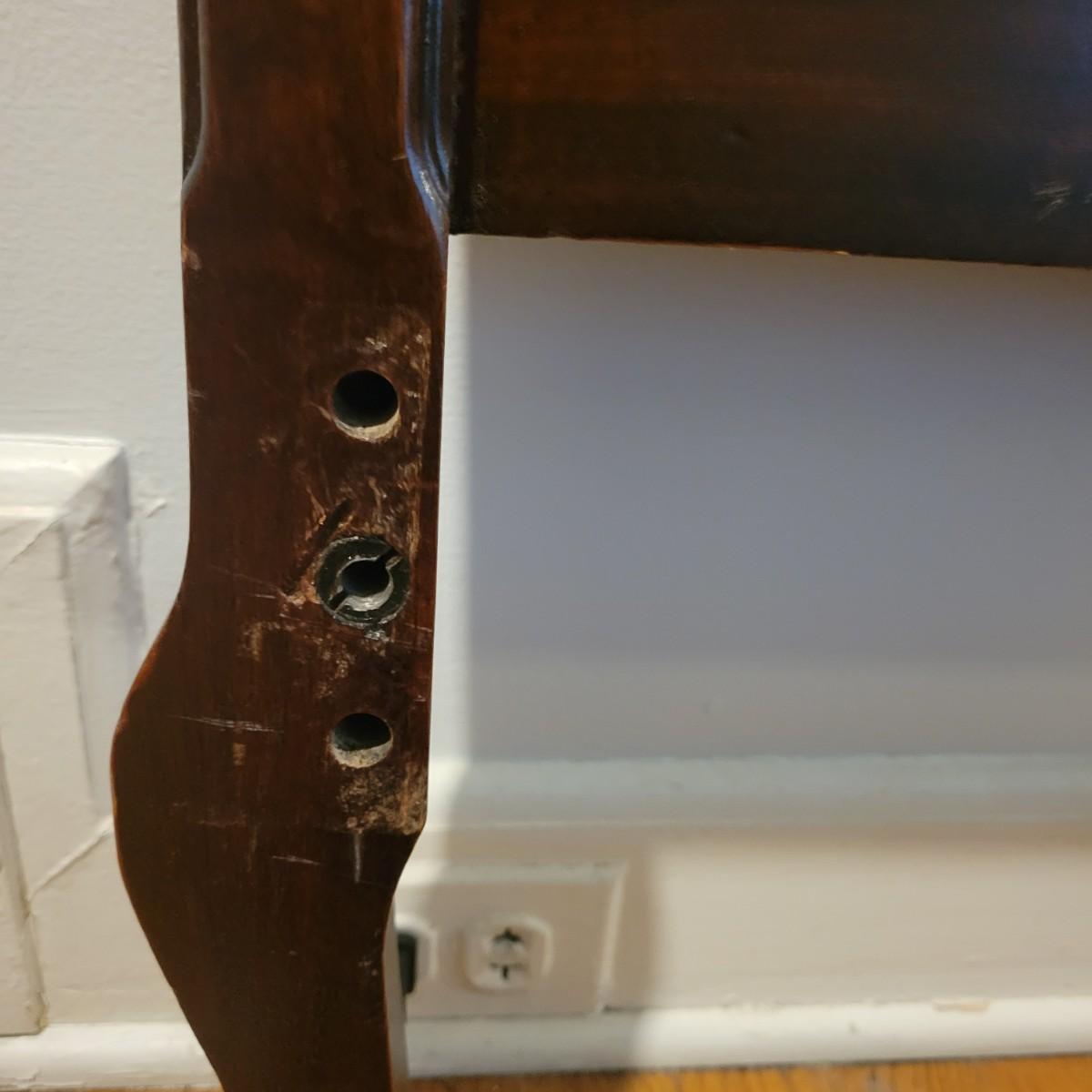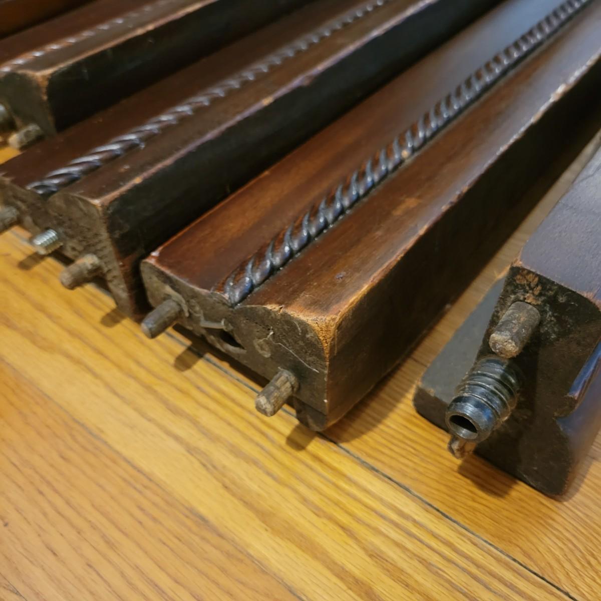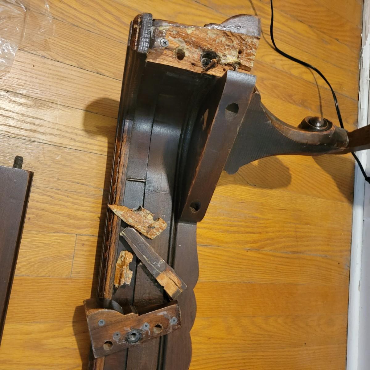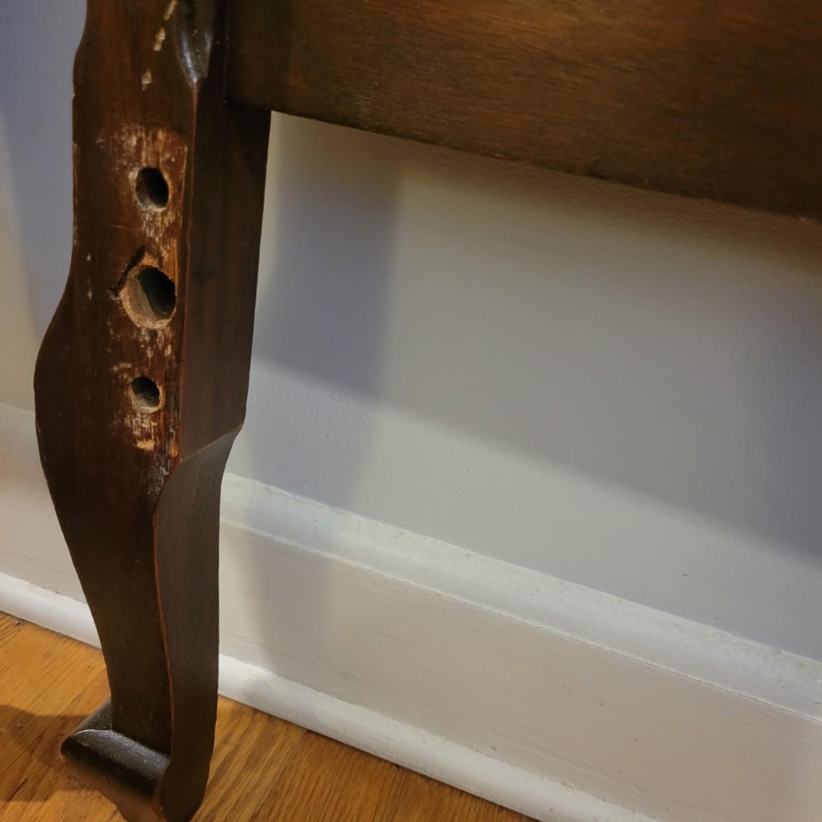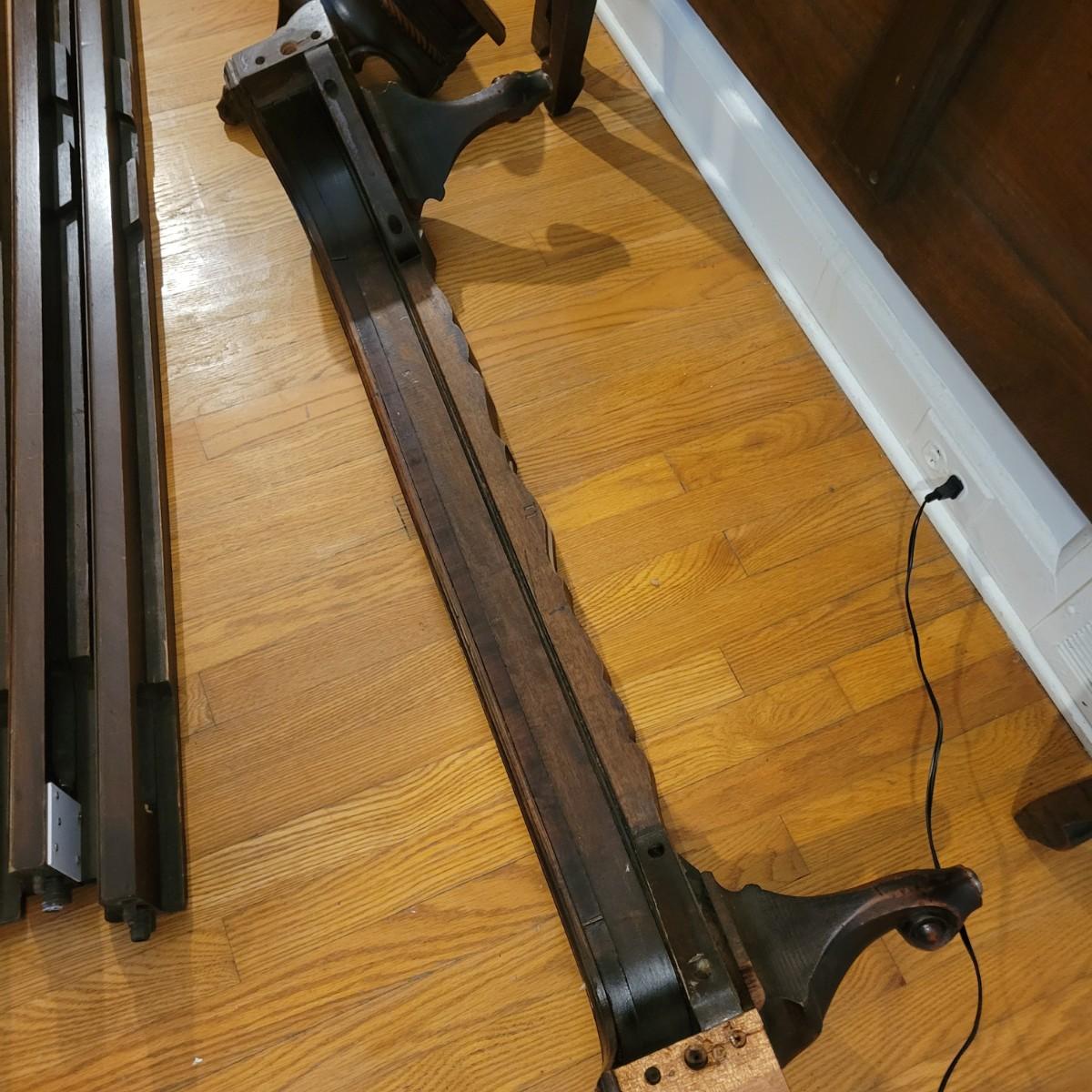 Two solid wood, antique twin bed frames in good condition, but with some damage on the footboards. One footboard is missing a piece of wood where the side rail mounts, but the broken piece is with the lot. The other footboard is missing wood from both sides where side rail mounts. There are wood pieces included in the lot for one side and repair has been attempted on it. See pictures for more detail. Lot also includes 6 wooden slats. Measures approximately 43.5" x 77" x 48.5" Local pickup only