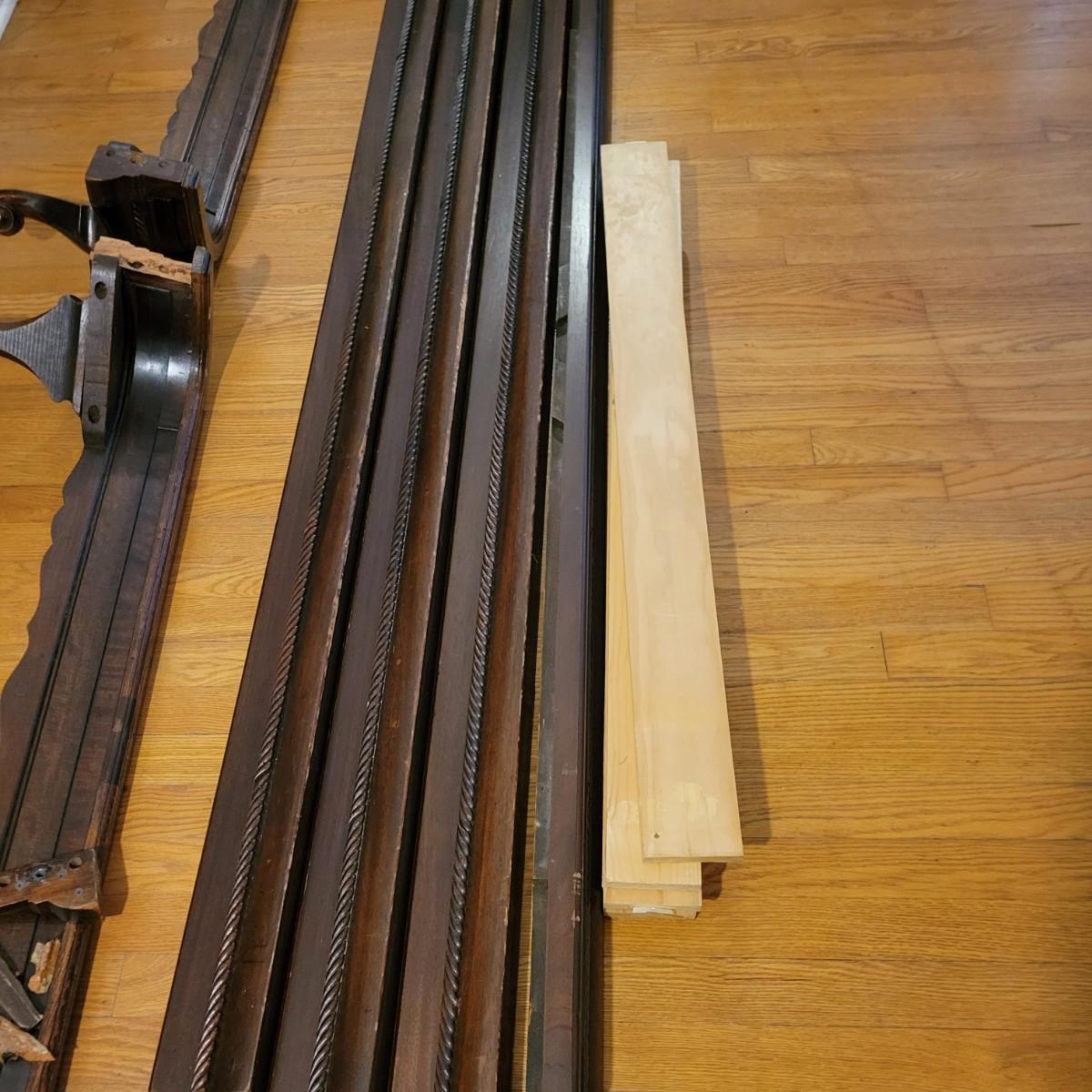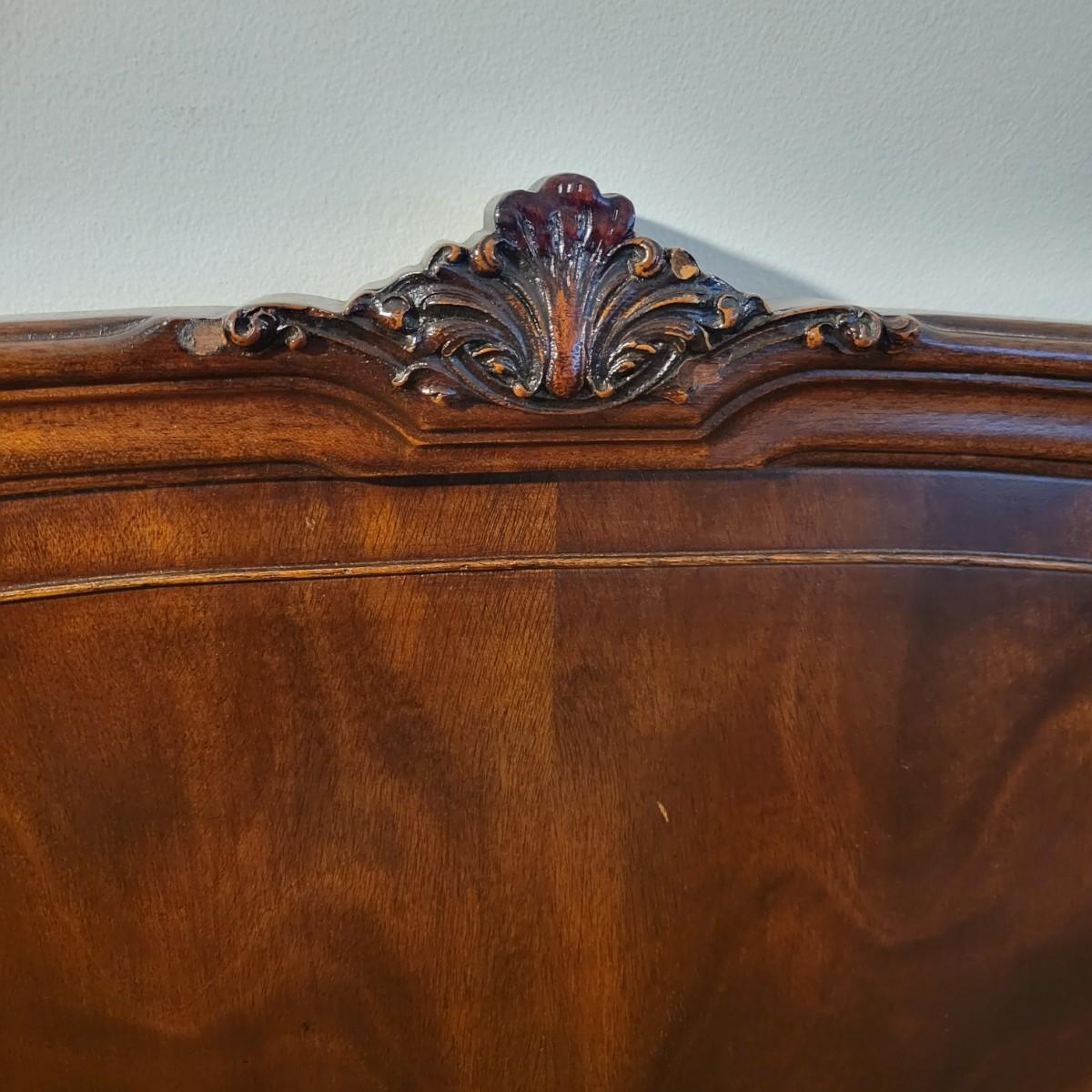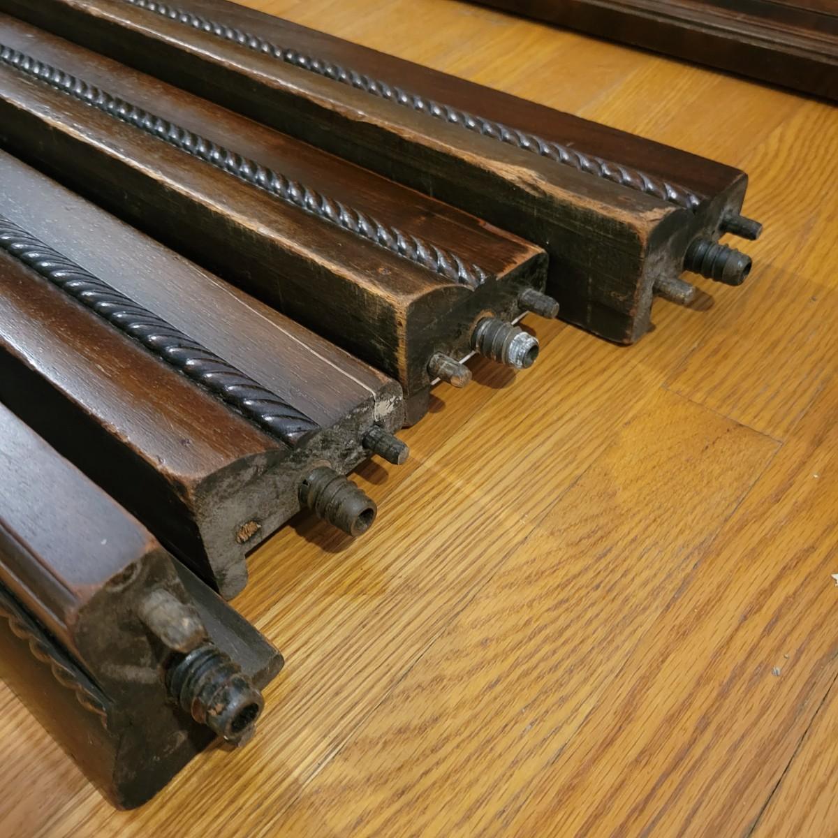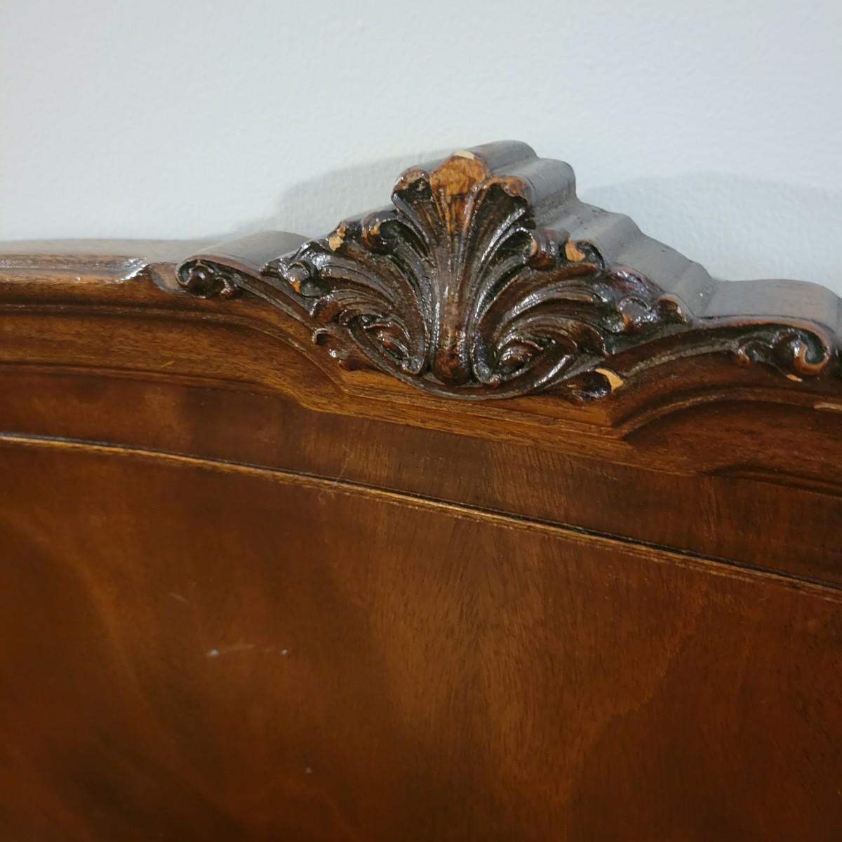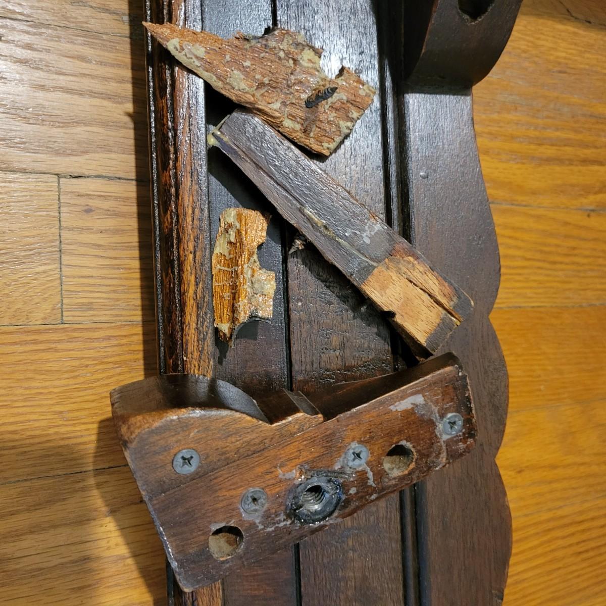 Two solid wood, antique twin bed frames in good condition, but with some damage on the footboards. One footboard is missing a piece of wood where the side rail mounts, but the broken piece is with the lot. The other footboard is missing wood from both sides where side rail mounts. There are wood pieces included in the lot for one side and repair has been attempted on it. See pictures for more detail. Lot also includes 6 wooden slats. Measures approximately 43.5" x 77" x 48.5" Local pickup only