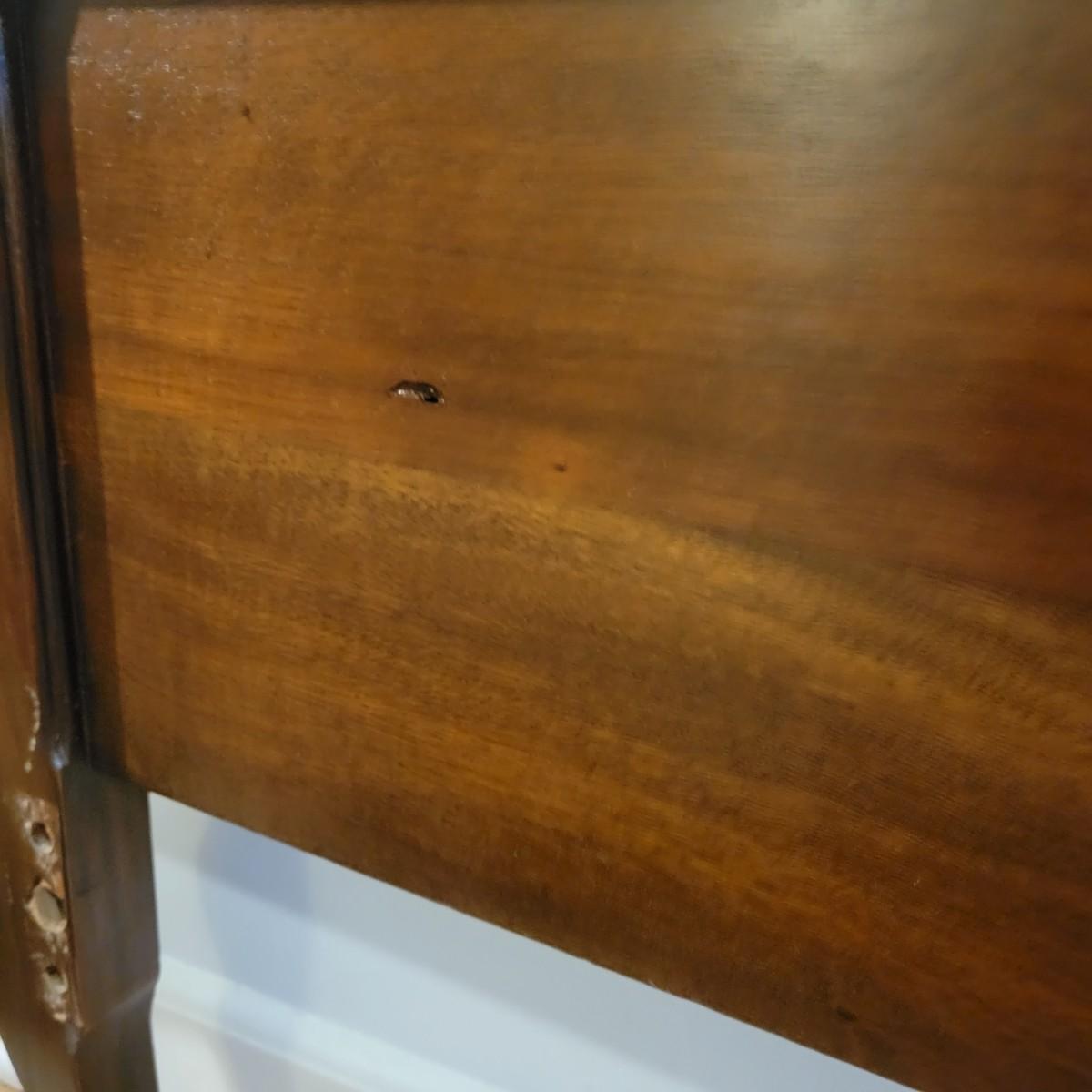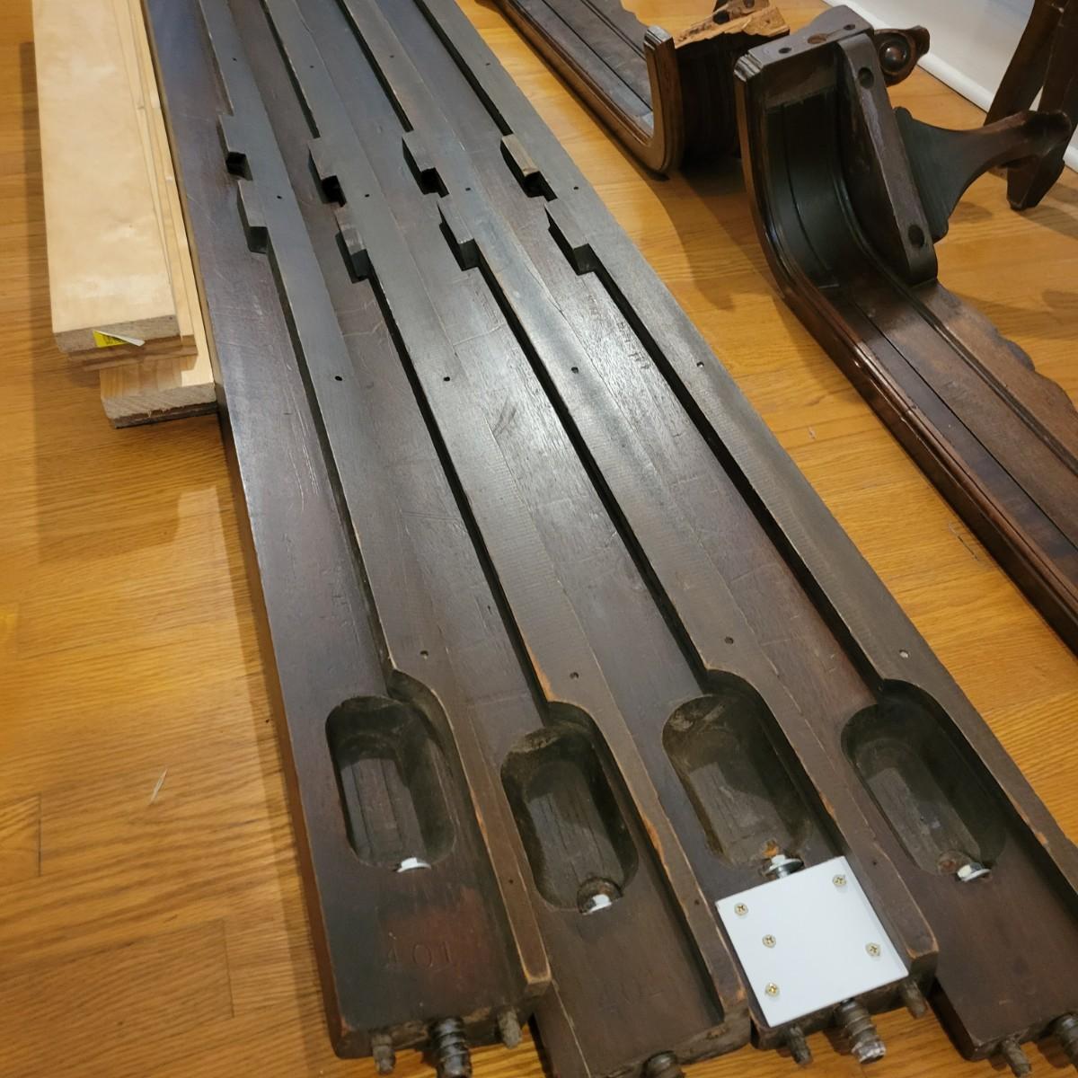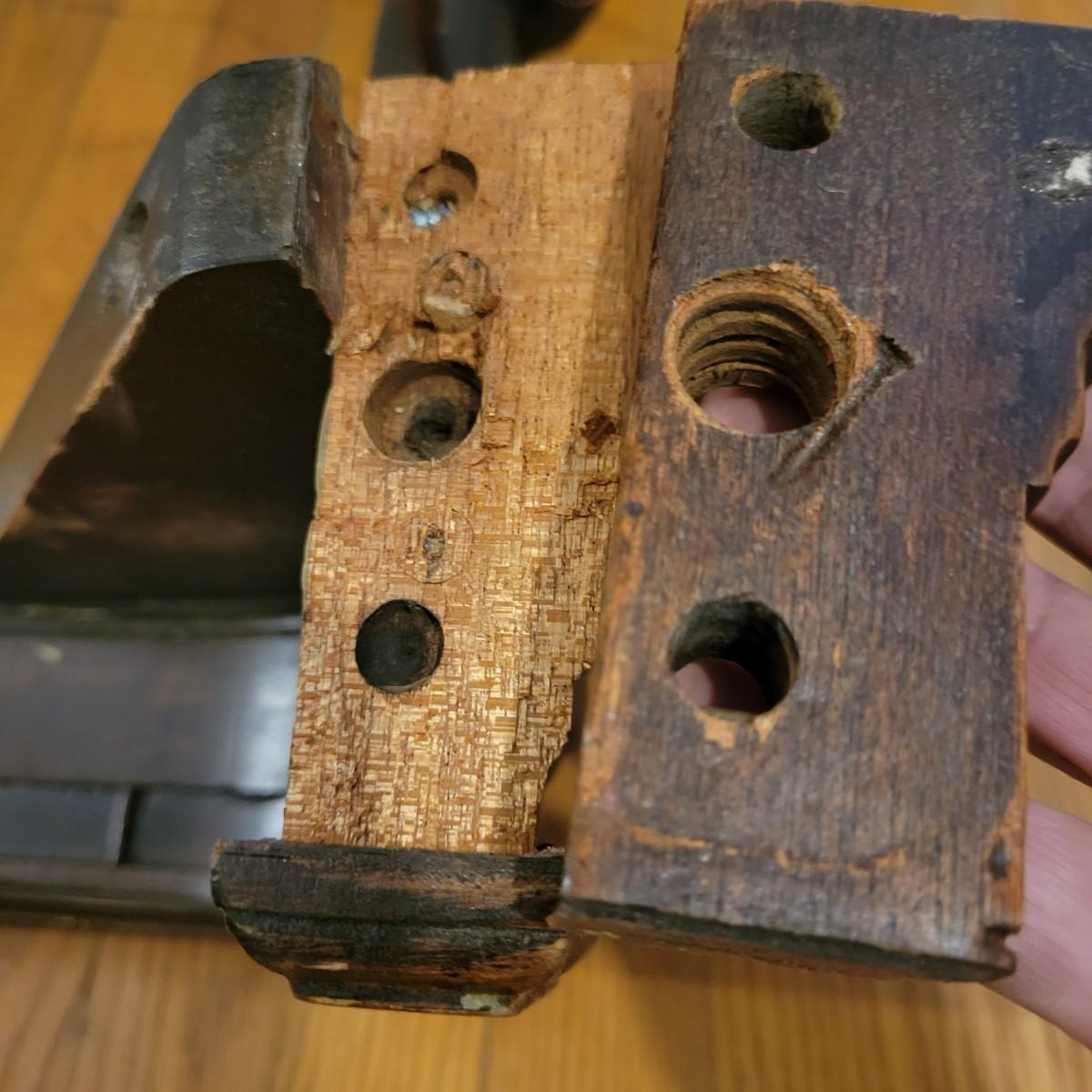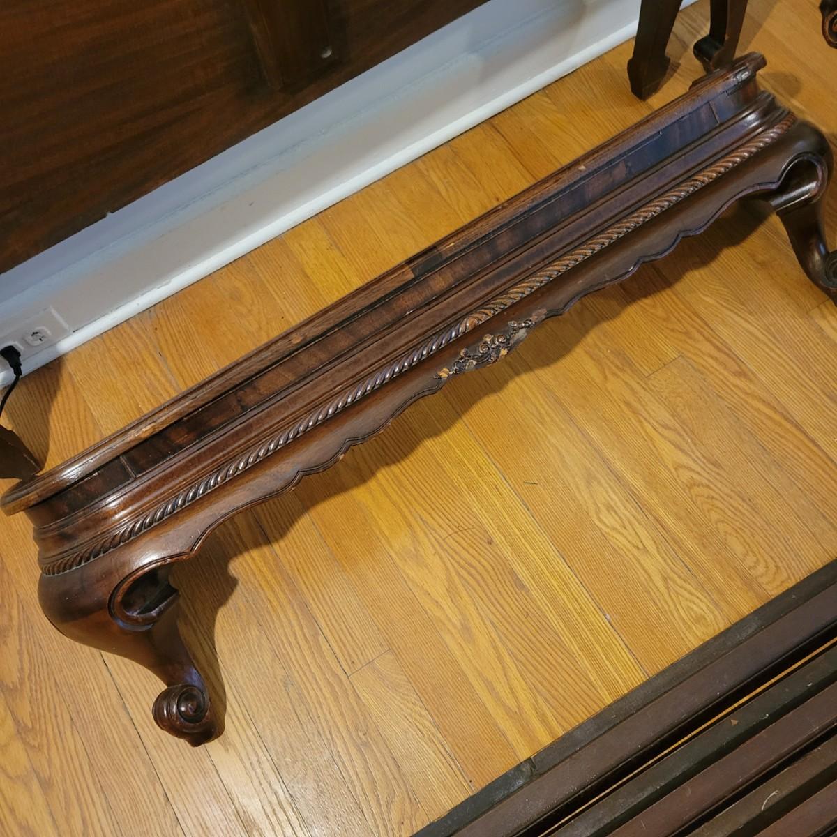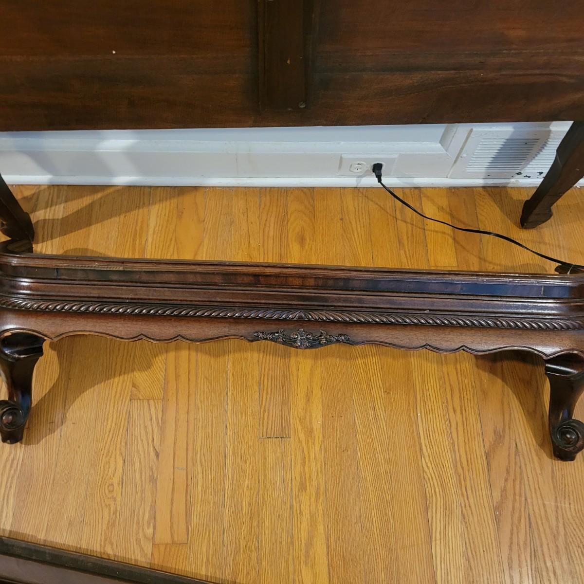 Two solid wood, antique twin bed frames in good condition, but with some damage on the footboards. One footboard is missing a piece of wood where the side rail mounts, but the broken piece is with the lot. The other footboard is missing wood from both sides where side rail mounts. There are wood pieces included in the lot for one side and repair has been attempted on it. See pictures for more detail. Lot also includes 6 wooden slats. Measures approximately 43.5" x 77" x 48.5" Local pickup only