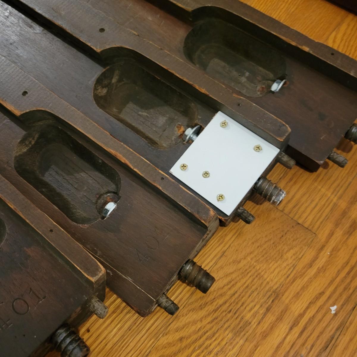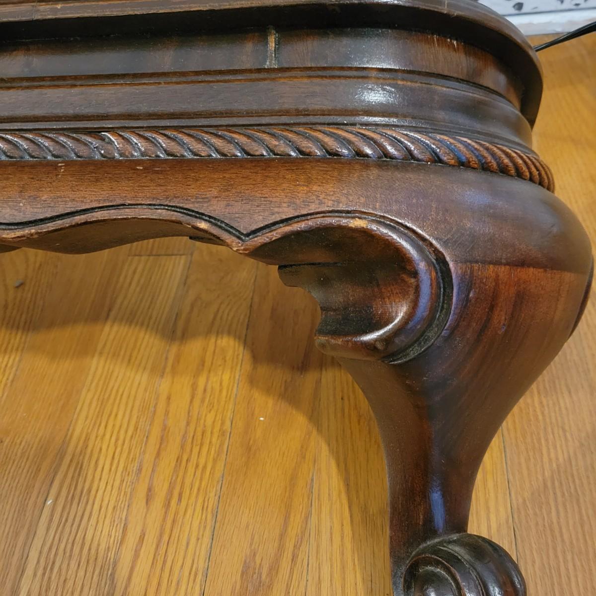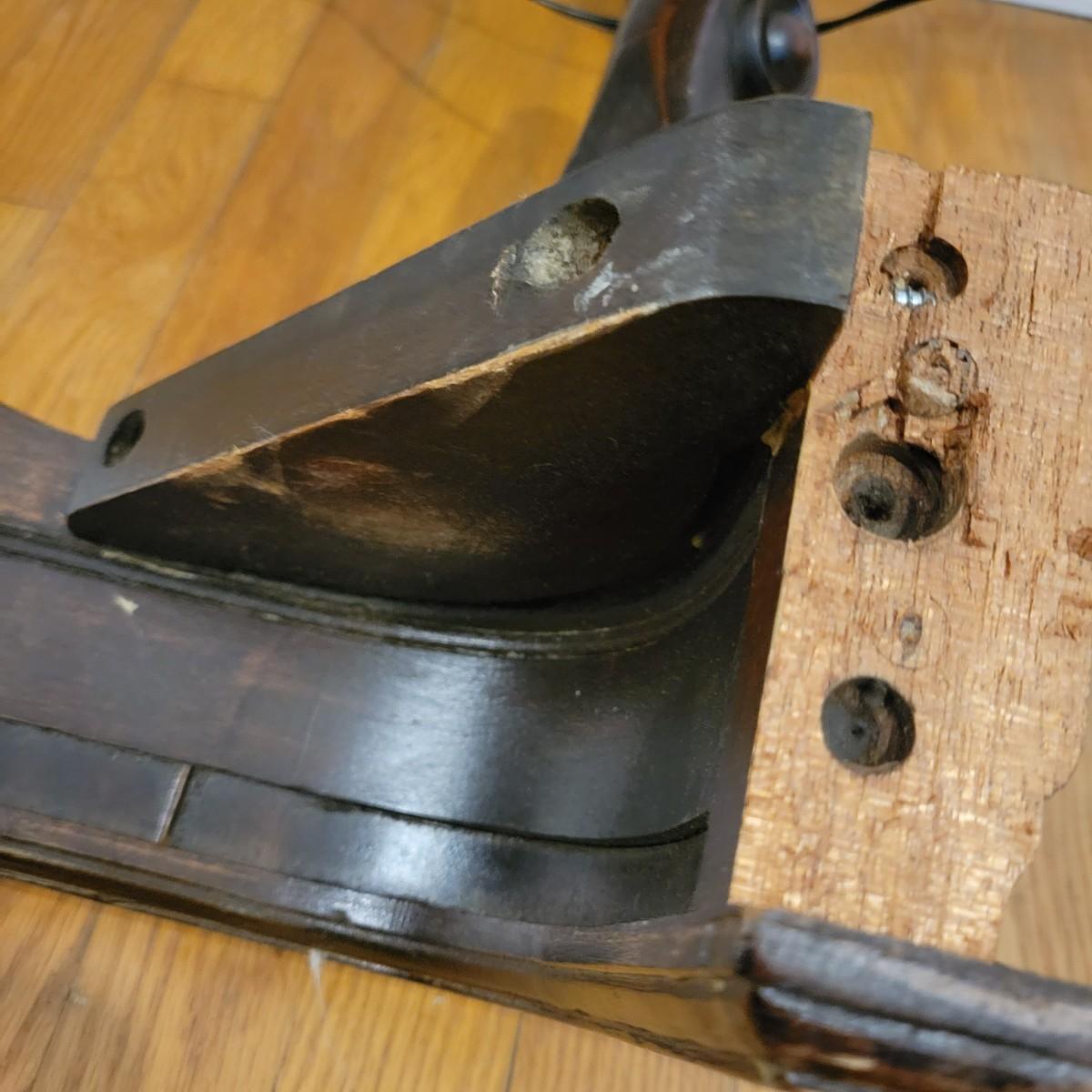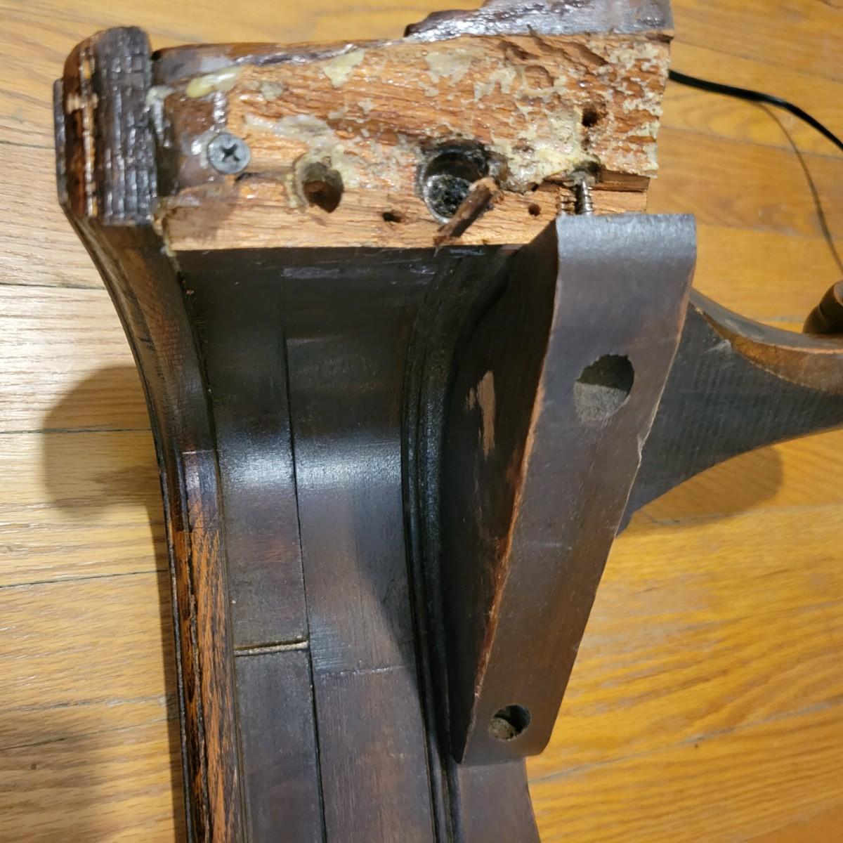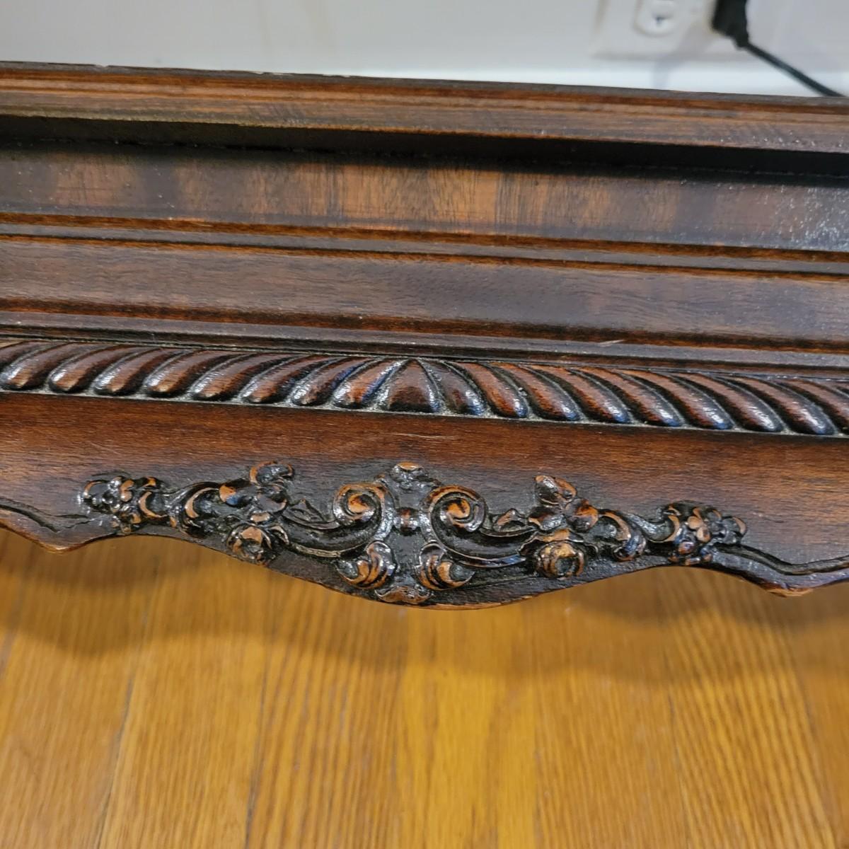 Two solid wood, antique twin bed frames in good condition, but with some damage on the footboards. One footboard is missing a piece of wood where the side rail mounts, but the broken piece is with the lot. The other footboard is missing wood from both sides where side rail mounts. There are wood pieces included in the lot for one side and repair has been attempted on it. See pictures for more detail. Lot also includes 6 wooden slats. Measures approximately 43.5" x 77" x 48.5" Local pickup only