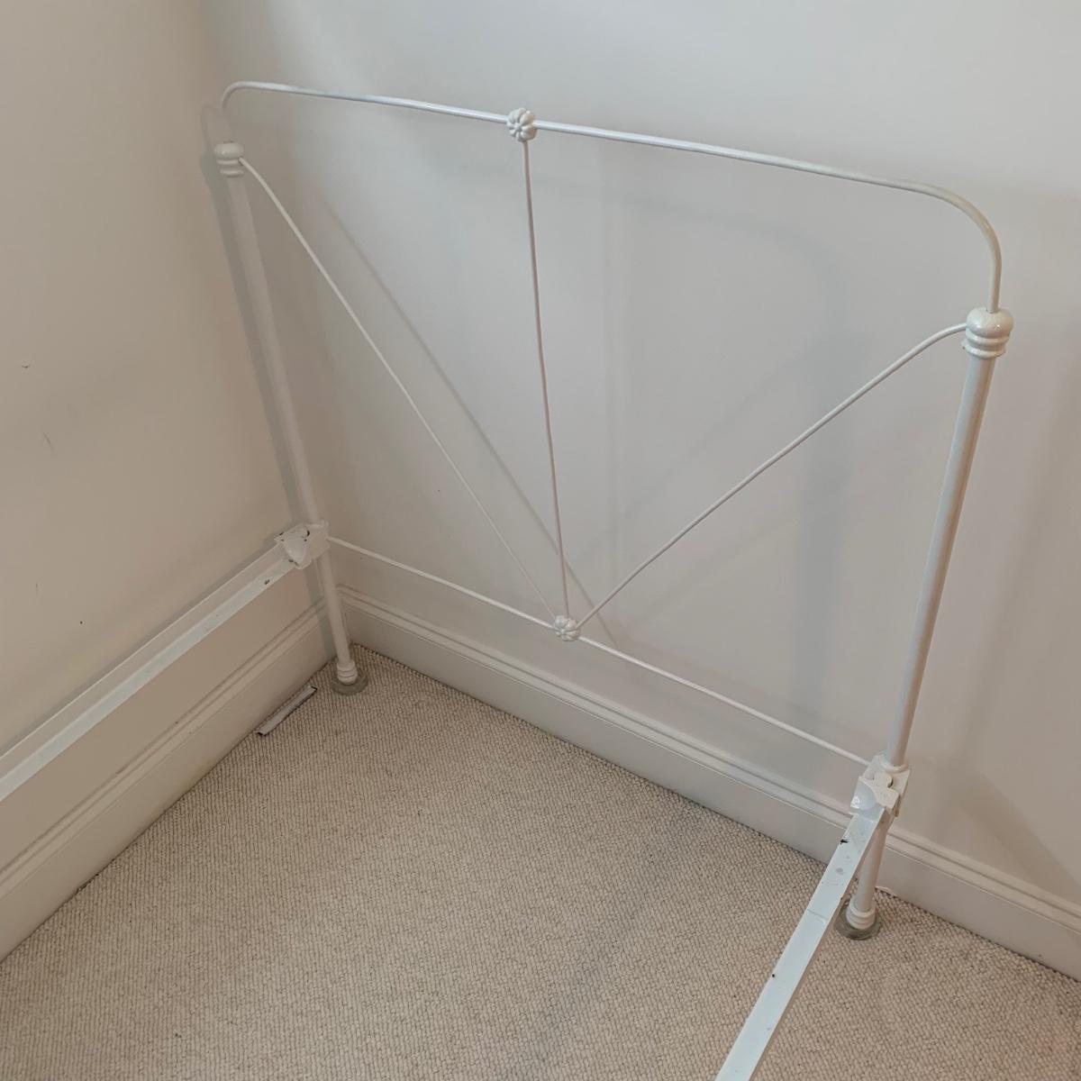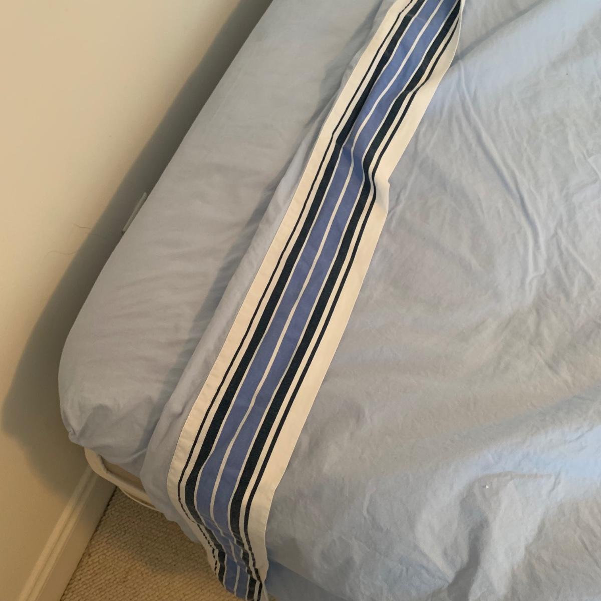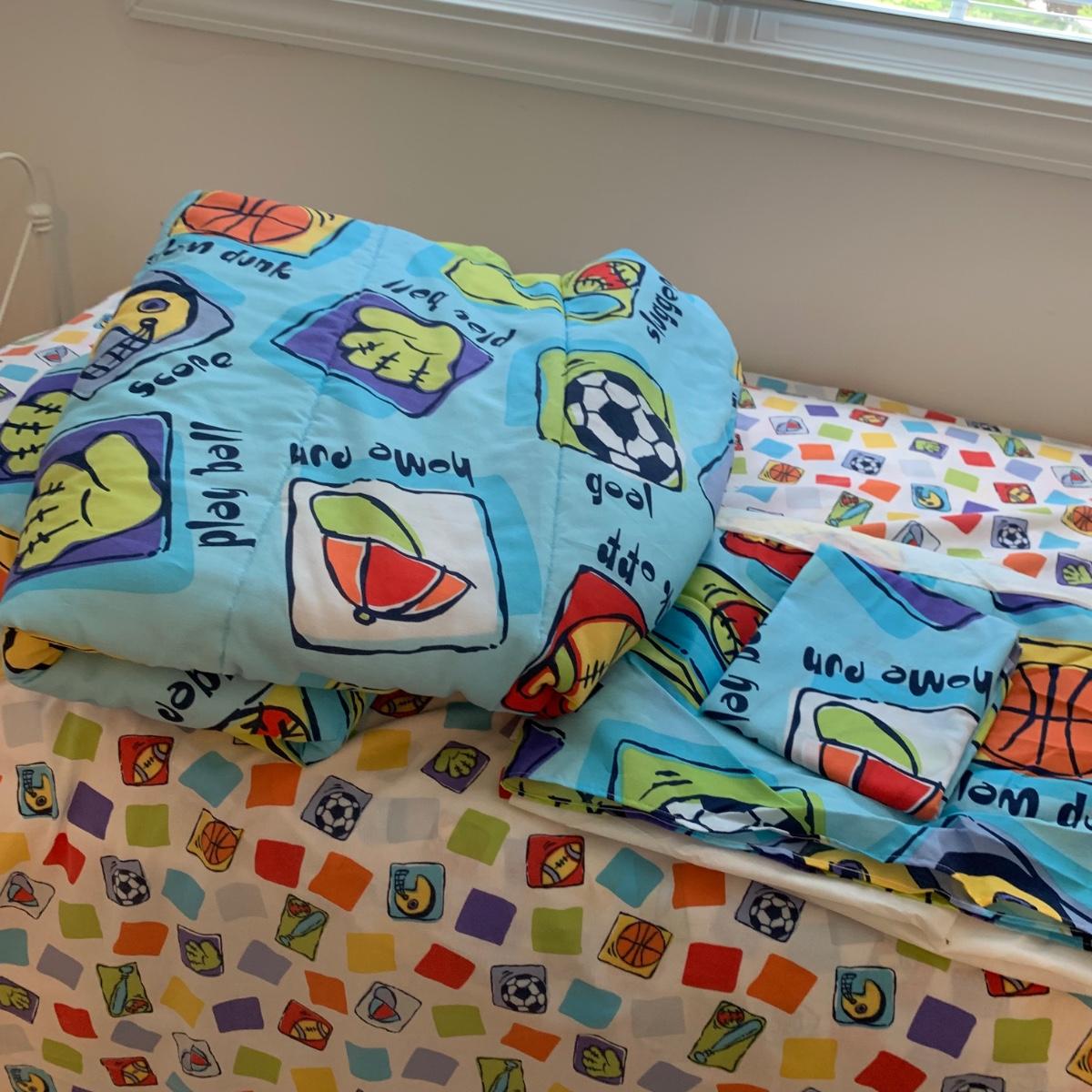 Two twin bed frames. One has a white iron headboard/footboard and frame. The other is a basic metal frame. Some sports themed and striped bedding is included. For the sports set, there is one set with a bed skirt, comforter and pillowcase, and one with a flat and fitted sheet and pillowcase. The striped set has a flat and fitted sheet with a pillowcase. And a separate comforter and pillowcase. One white blanket is included as well.