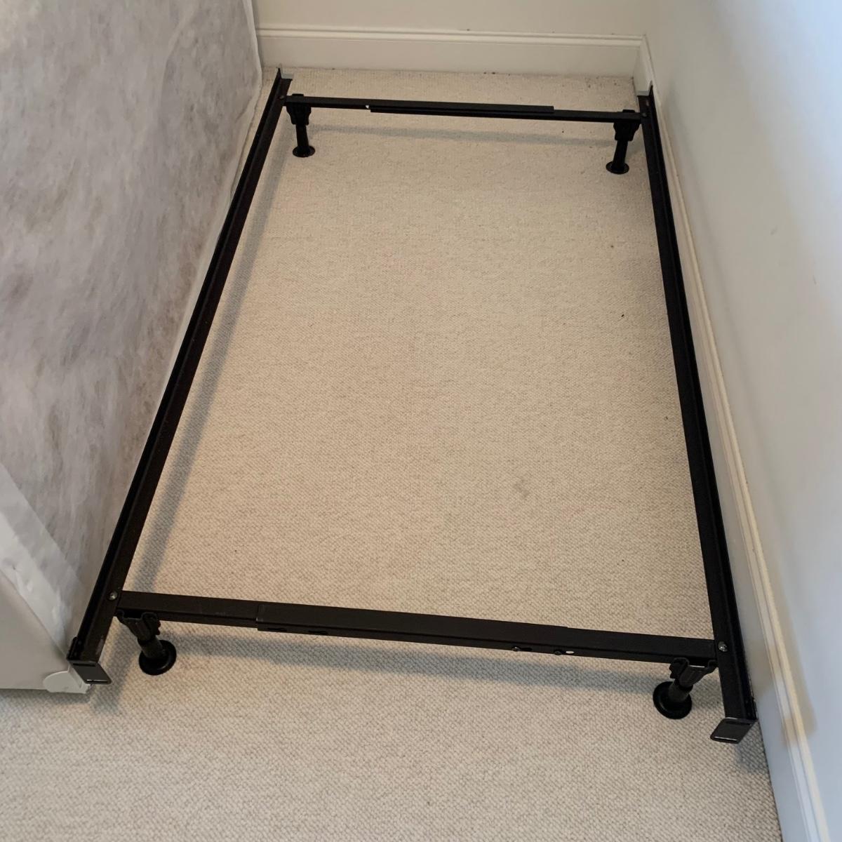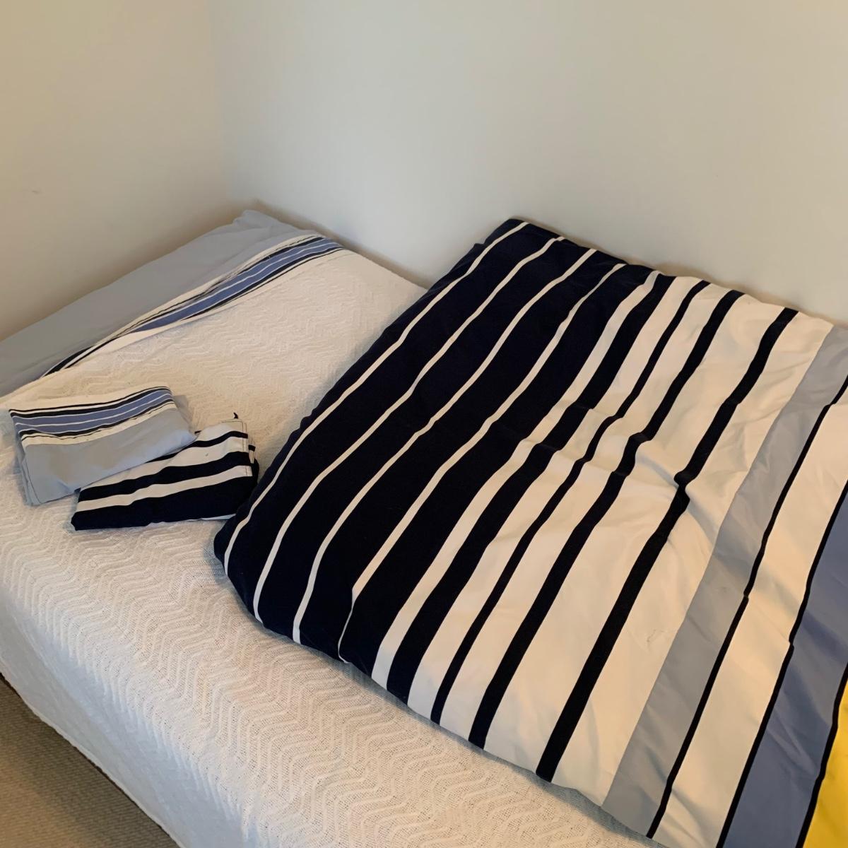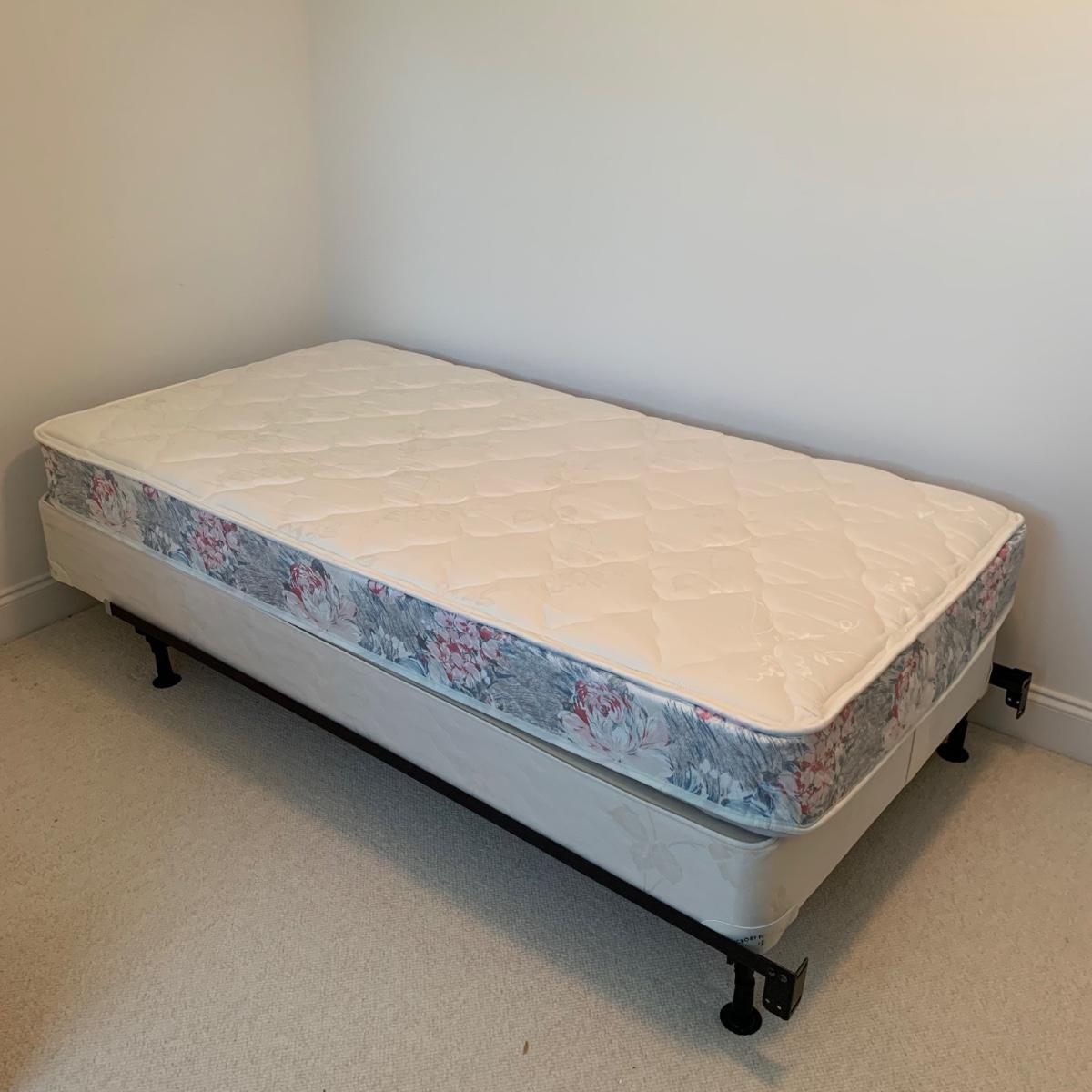 Two twin bed frames. One has a white iron headboard/footboard and frame. The other is a basic metal frame. Some sports themed and striped bedding is included. For the sports set, there is one set with a bed skirt, comforter and pillowcase, and one with a flat and fitted sheet and pillowcase. The striped set has a flat and fitted sheet with a pillowcase. And a separate comforter and pillowcase. One white blanket is included as well.