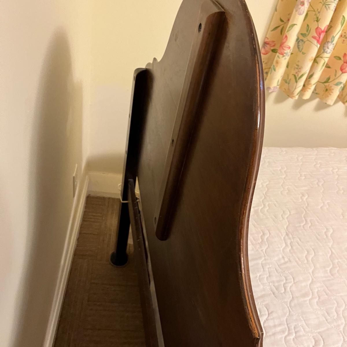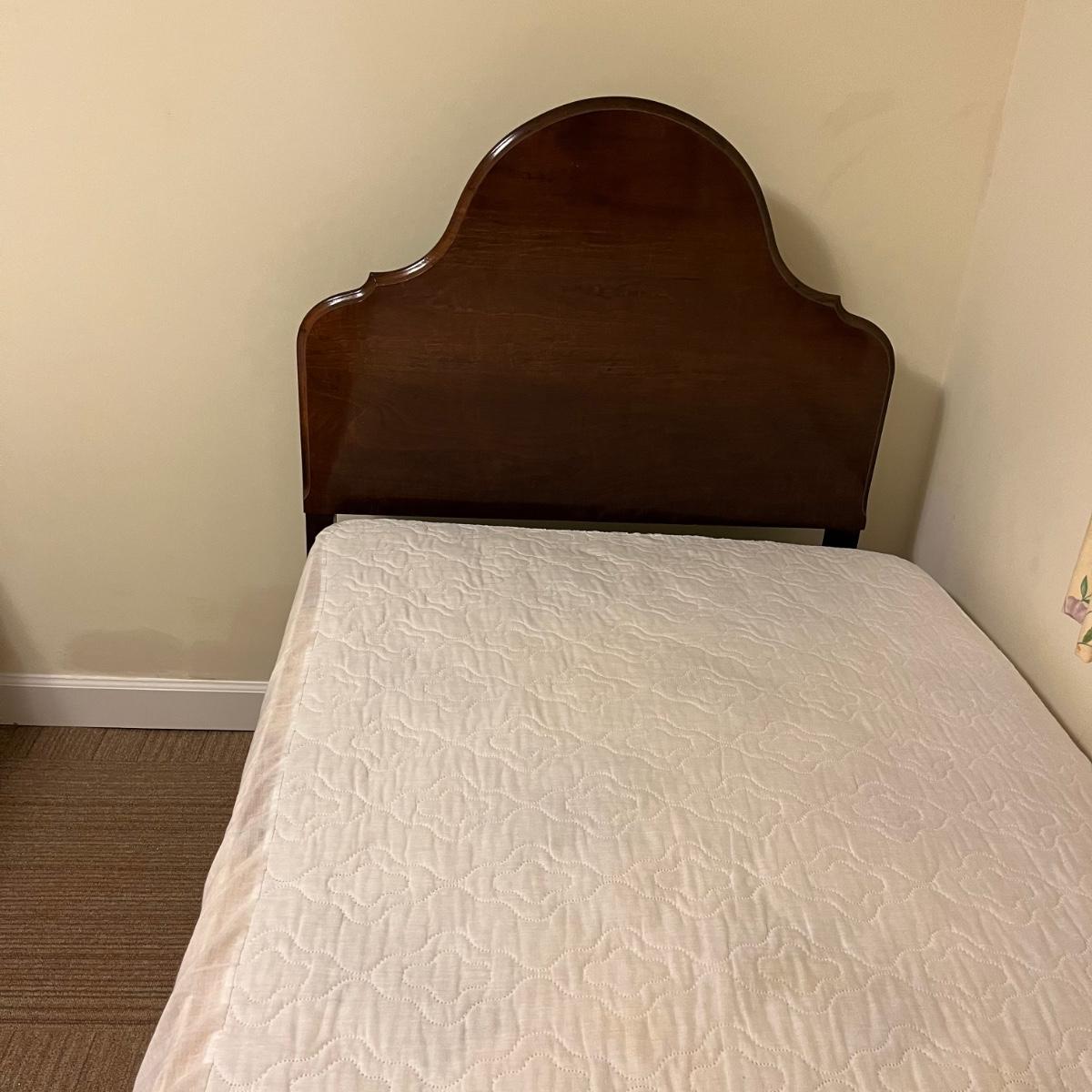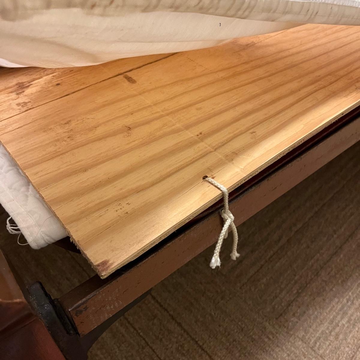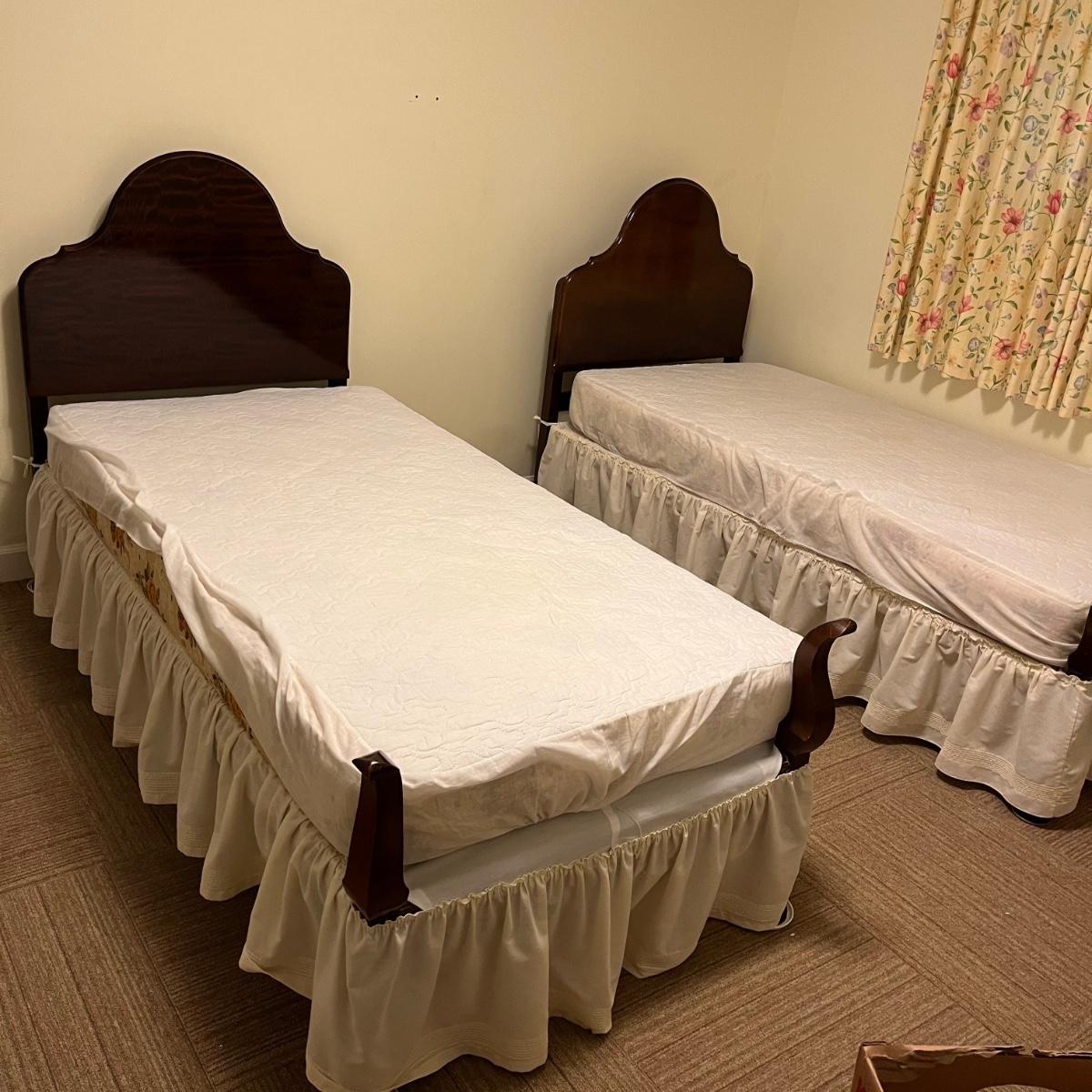 Lot includes two twin bed frames with wooden headboard and footboard. Bed frame has plywood over springs that is removable. Headboard measures 37” x 47”. Mattresses are available to winning bidder, but you are not required to take them.
