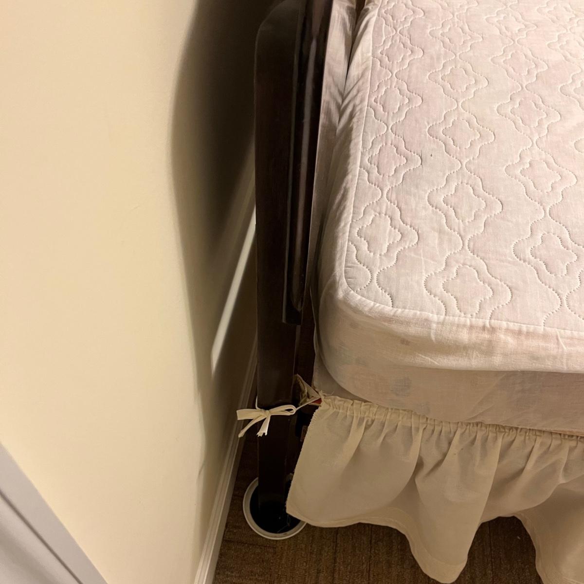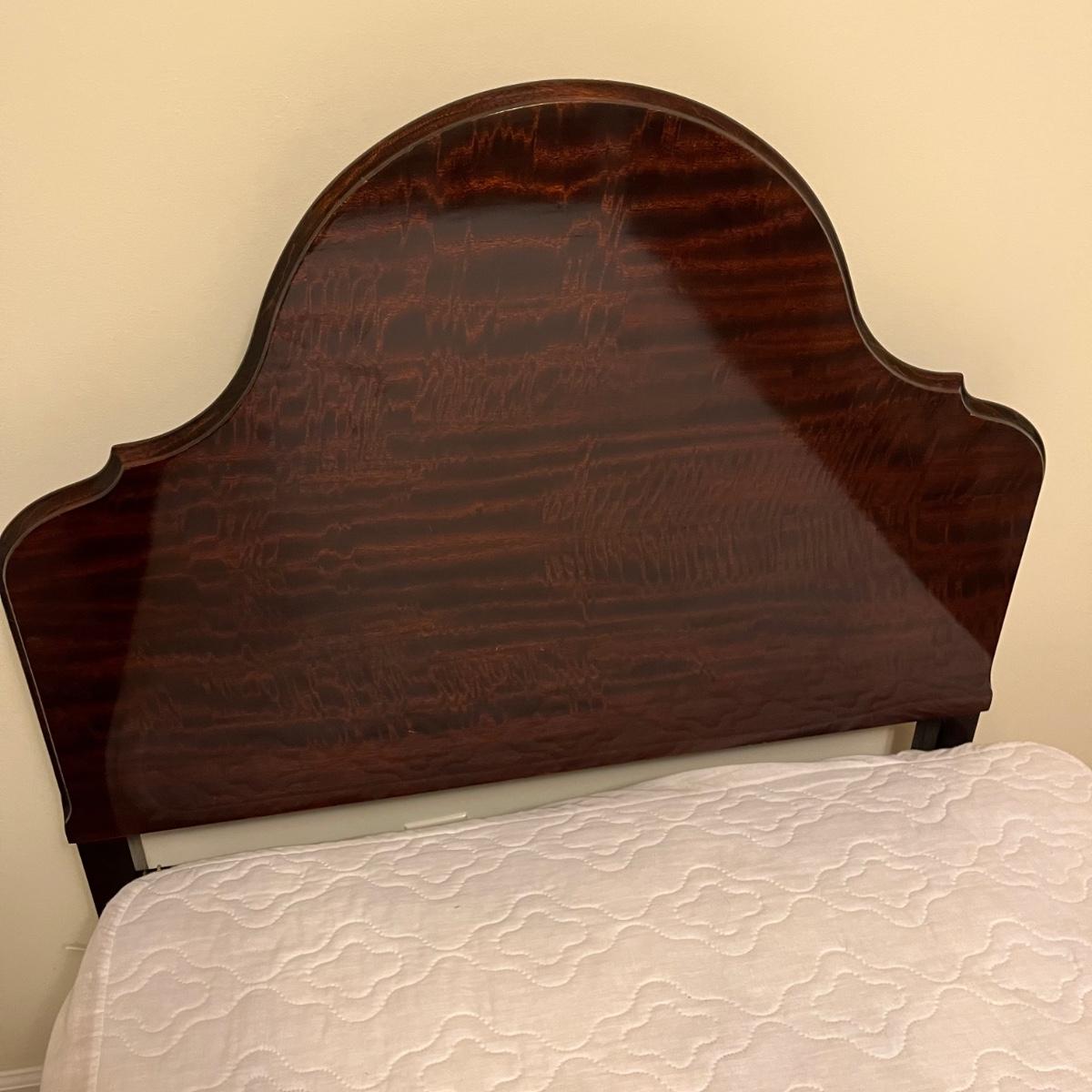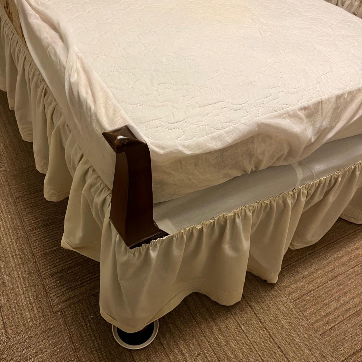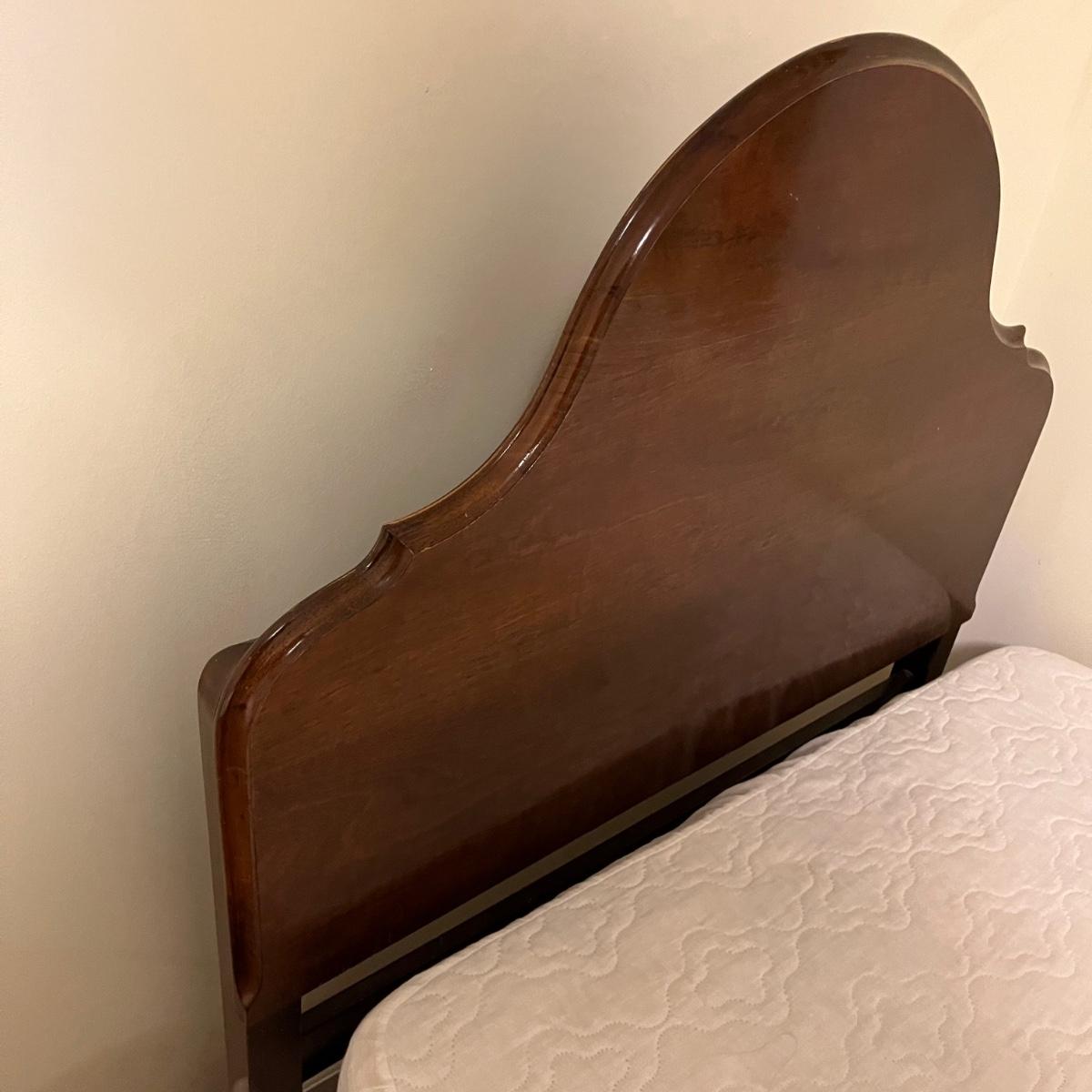 Lot includes two twin bed frames with wooden headboard and footboard. Bed frame has plywood over springs that is removable. Headboard measures 37” x 47”. Mattresses are available to winning bidder, but you are not required to take them.