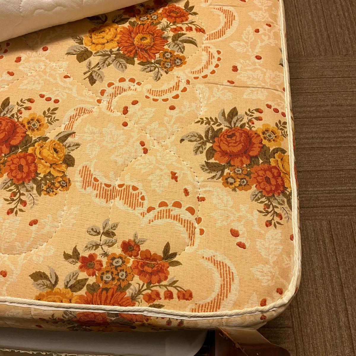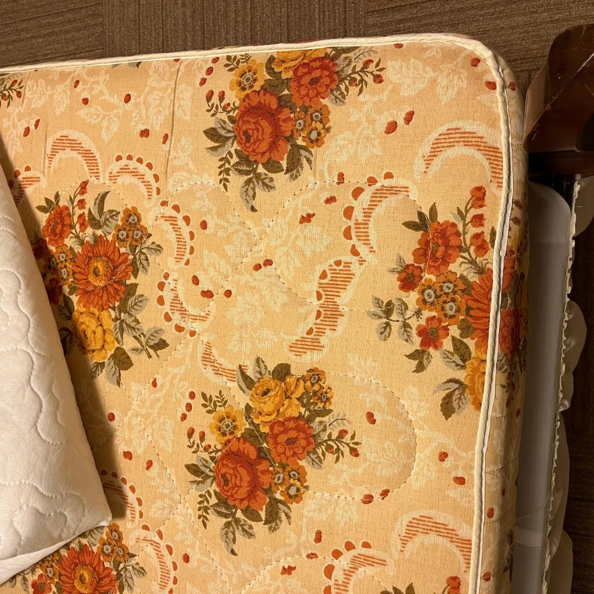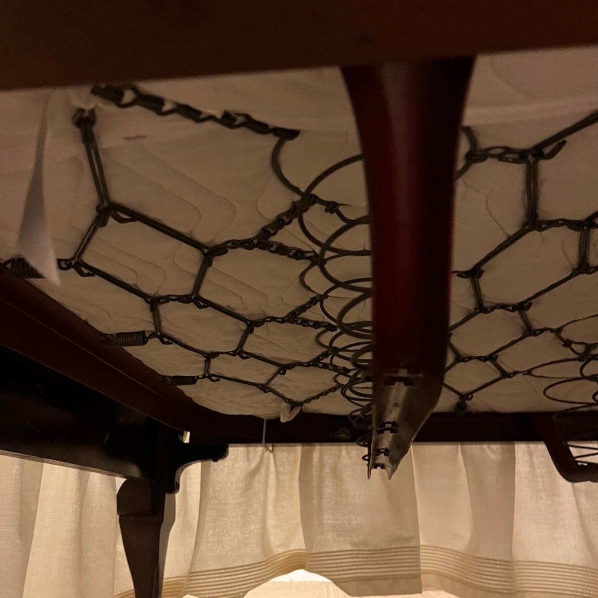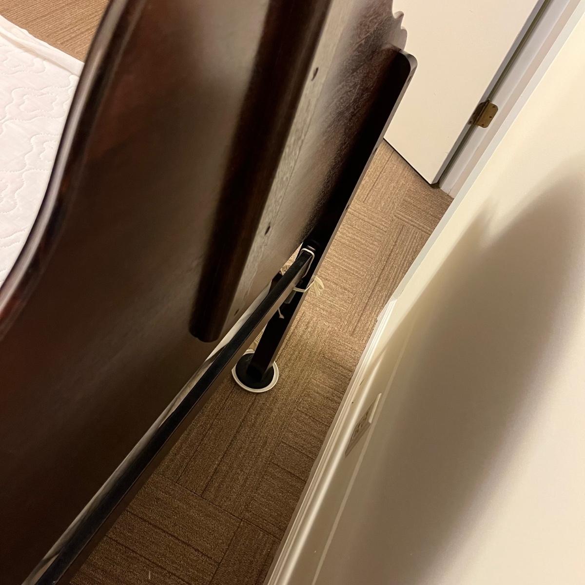 Lot includes two twin bed frames with wooden headboard and footboard. Bed frame has plywood over springs that is removable. Headboard measures 37” x 47”. Mattresses are available to winning bidder, but you are not required to take them.