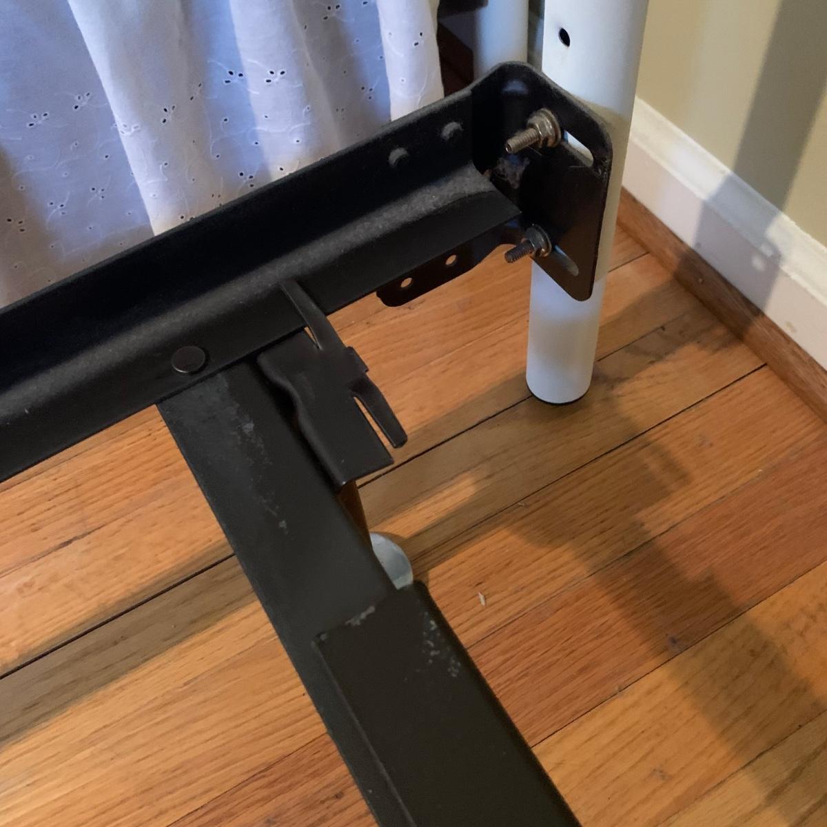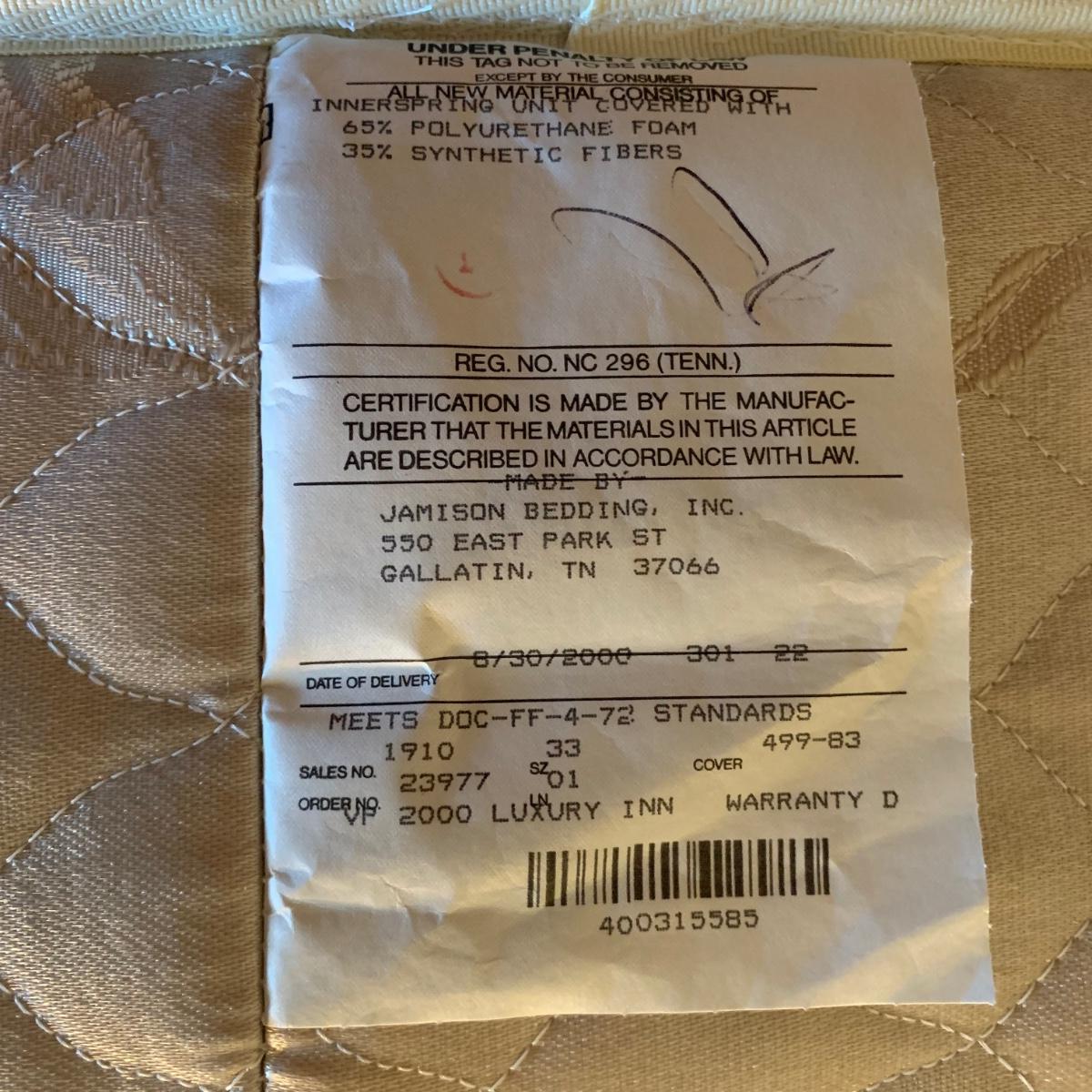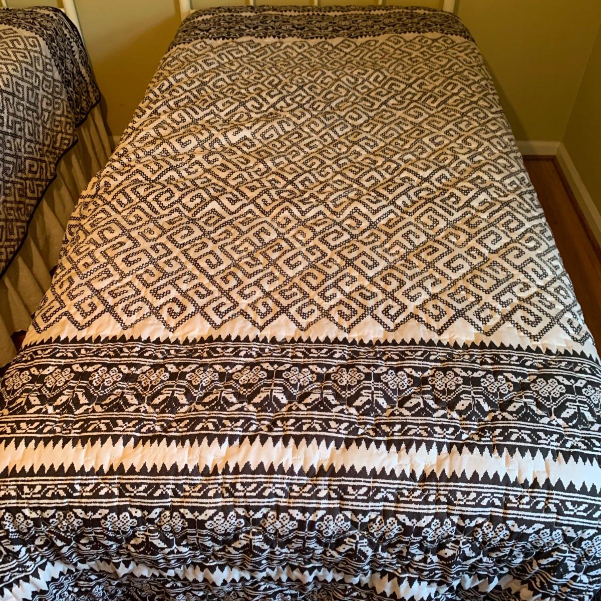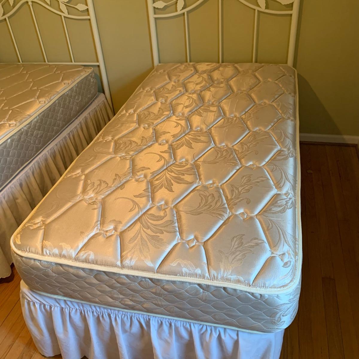 Two white metal twin bed frames. A black and white bedspread and matching sham is included with each bed. The tags have been removed and one sham has a rip where the pillow gets inserted. Pillows are not included. Each bed also has a mattress cover and white bed skirt included. Bed frames measure 38.5” x 72” x 51”H. Buyer is responsible for disassembly; please bring appropriate tools. The Jamison Vita Pedic mattresses and the box springs are available to the winning bidder if desired, but the winning bidder is not required to take them.
