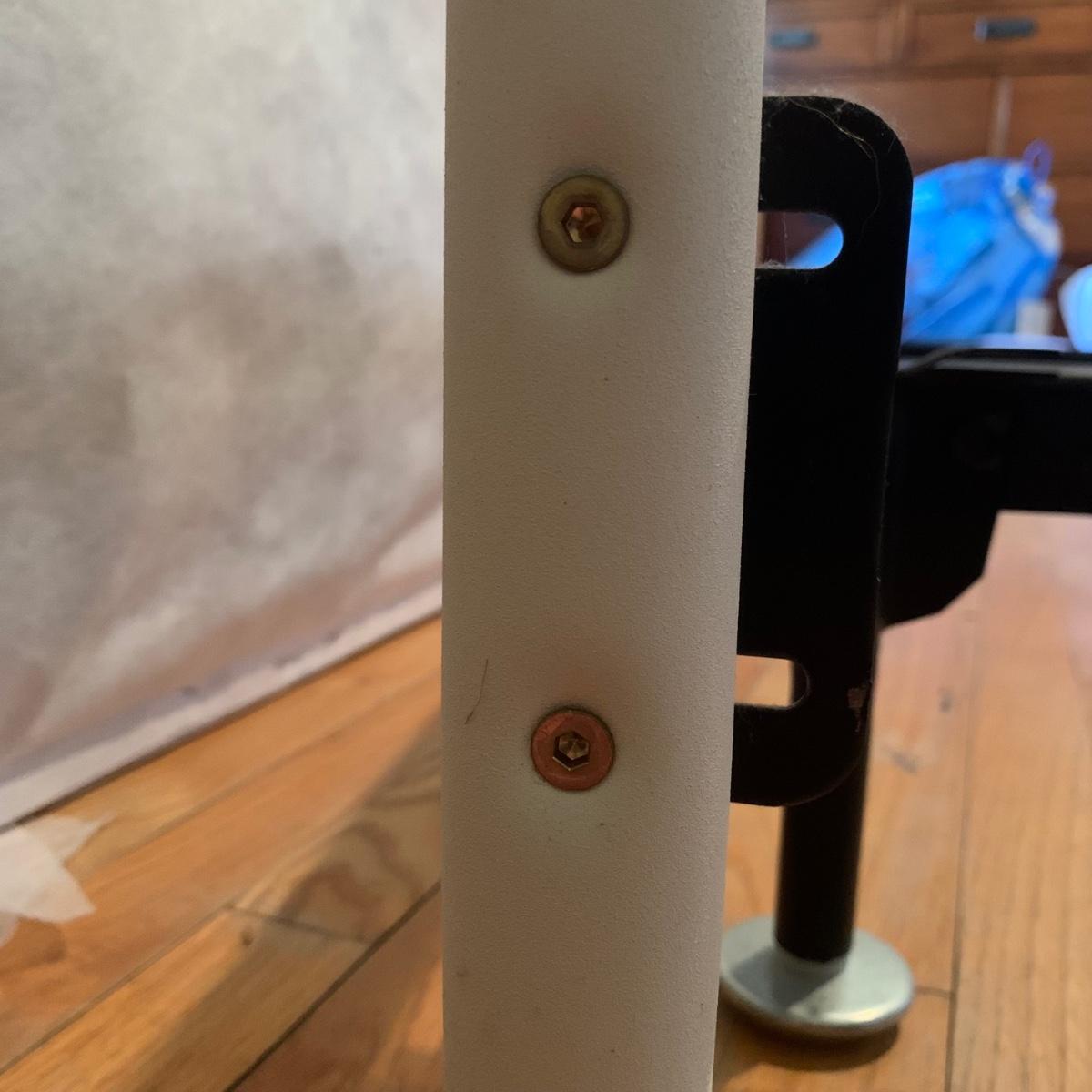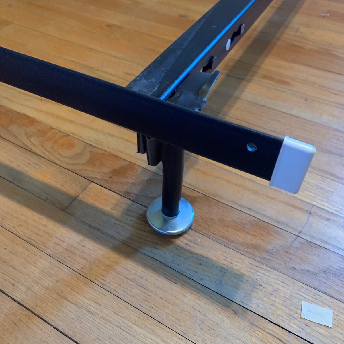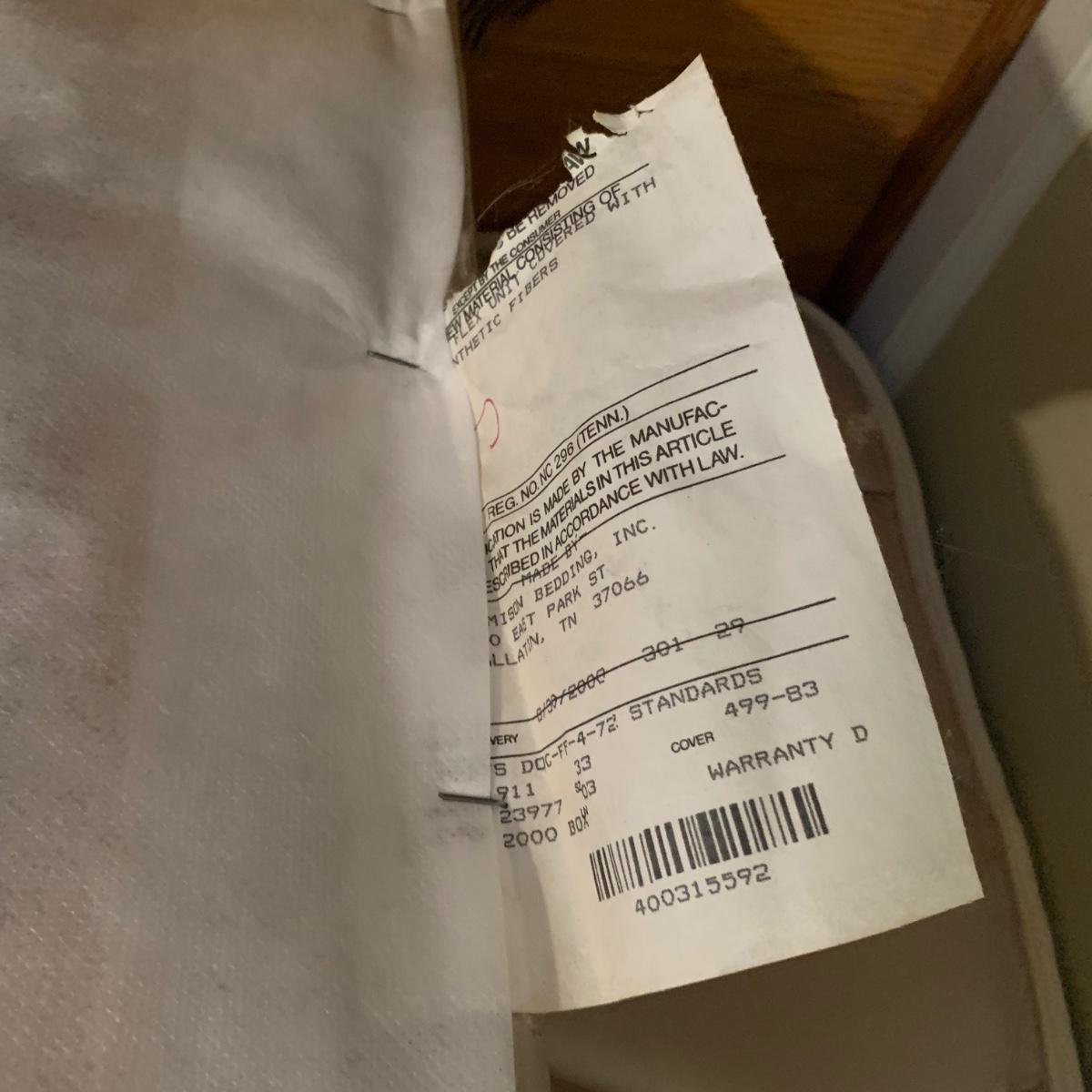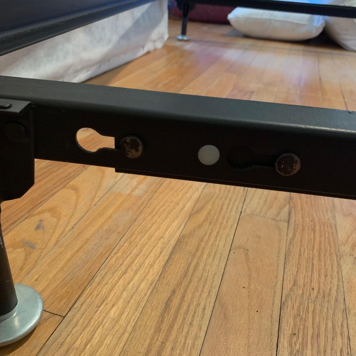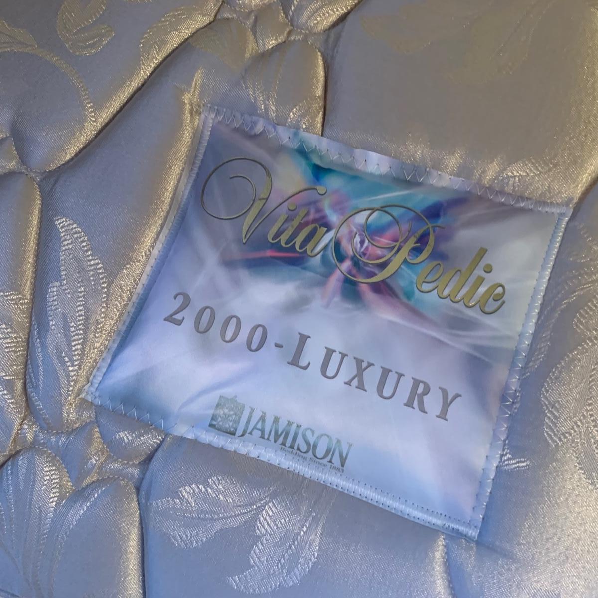 Two white metal twin bed frames. A black and white bedspread and matching sham is included with each bed. The tags have been removed and one sham has a rip where the pillow gets inserted. Pillows are not included. Each bed also has a mattress cover and white bed skirt included. Bed frames measure 38.5” x 72” x 51”H. Buyer is responsible for disassembly; please bring appropriate tools. The Jamison Vita Pedic mattresses and the box springs are available to the winning bidder if desired, but the winning bidder is not required to take them.