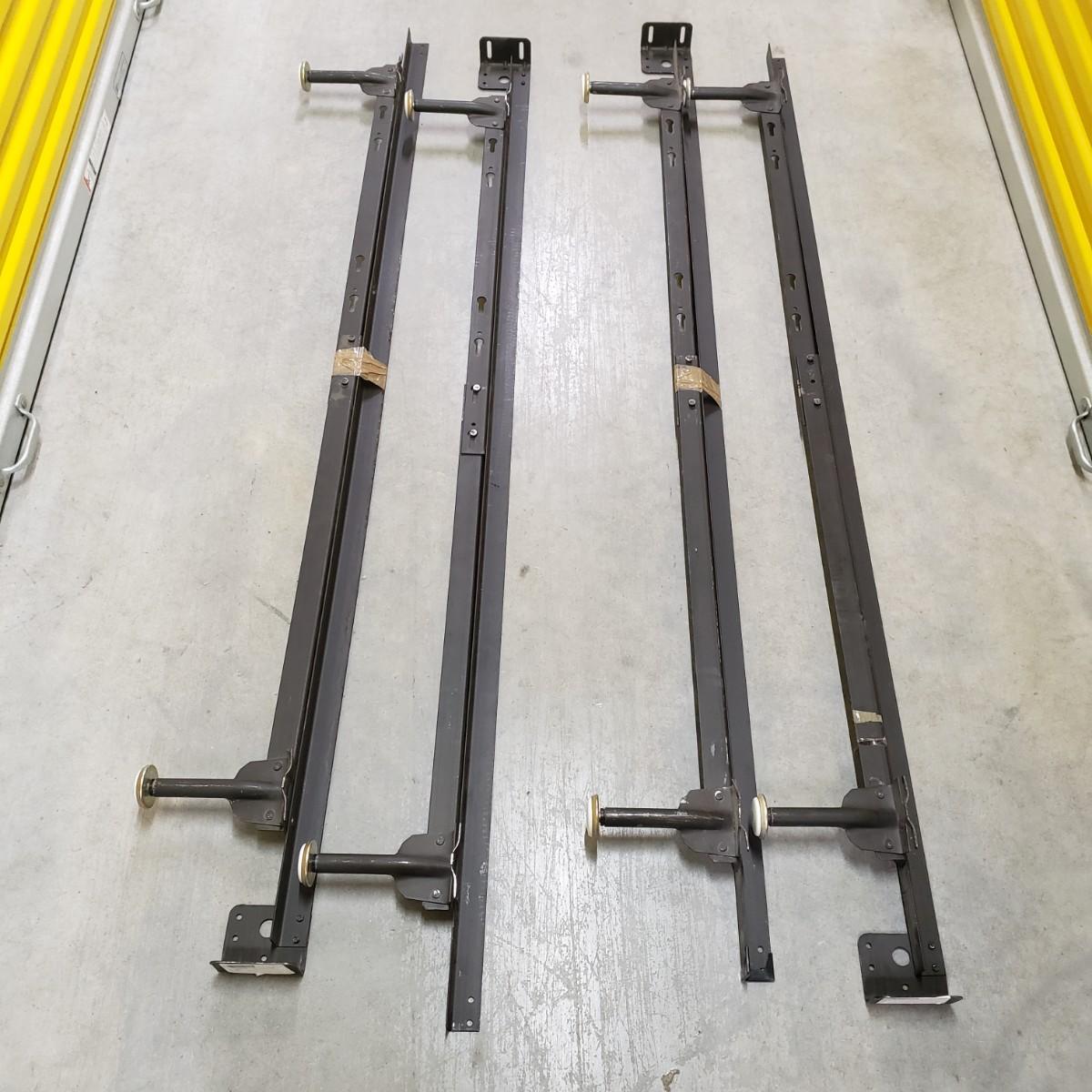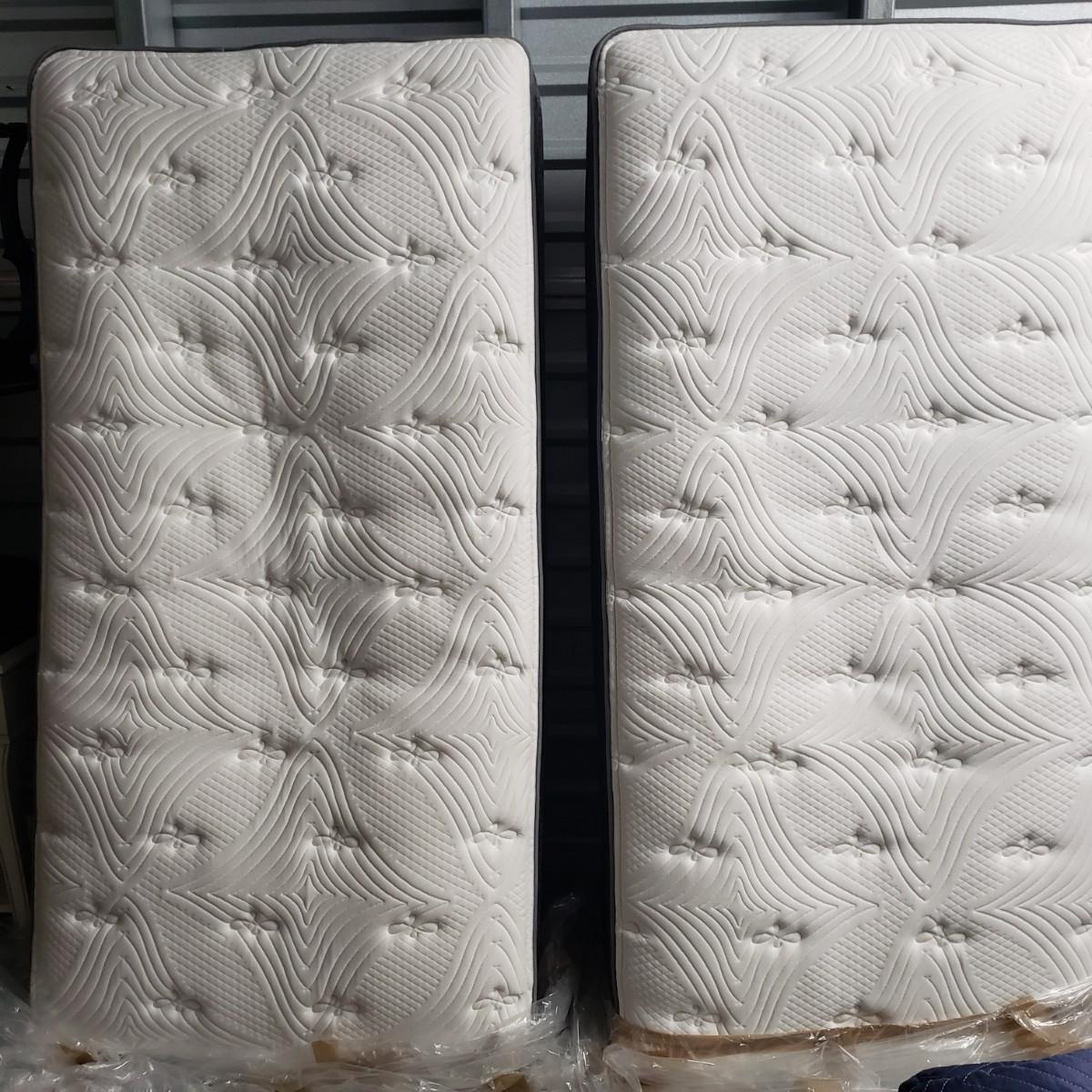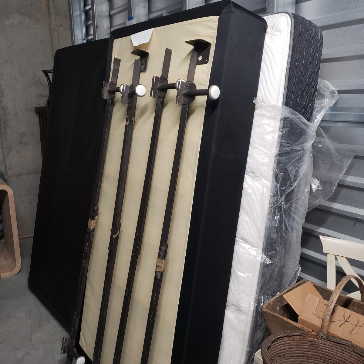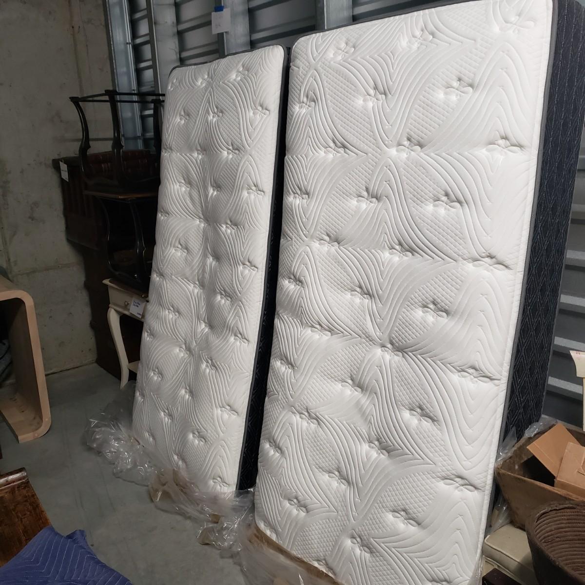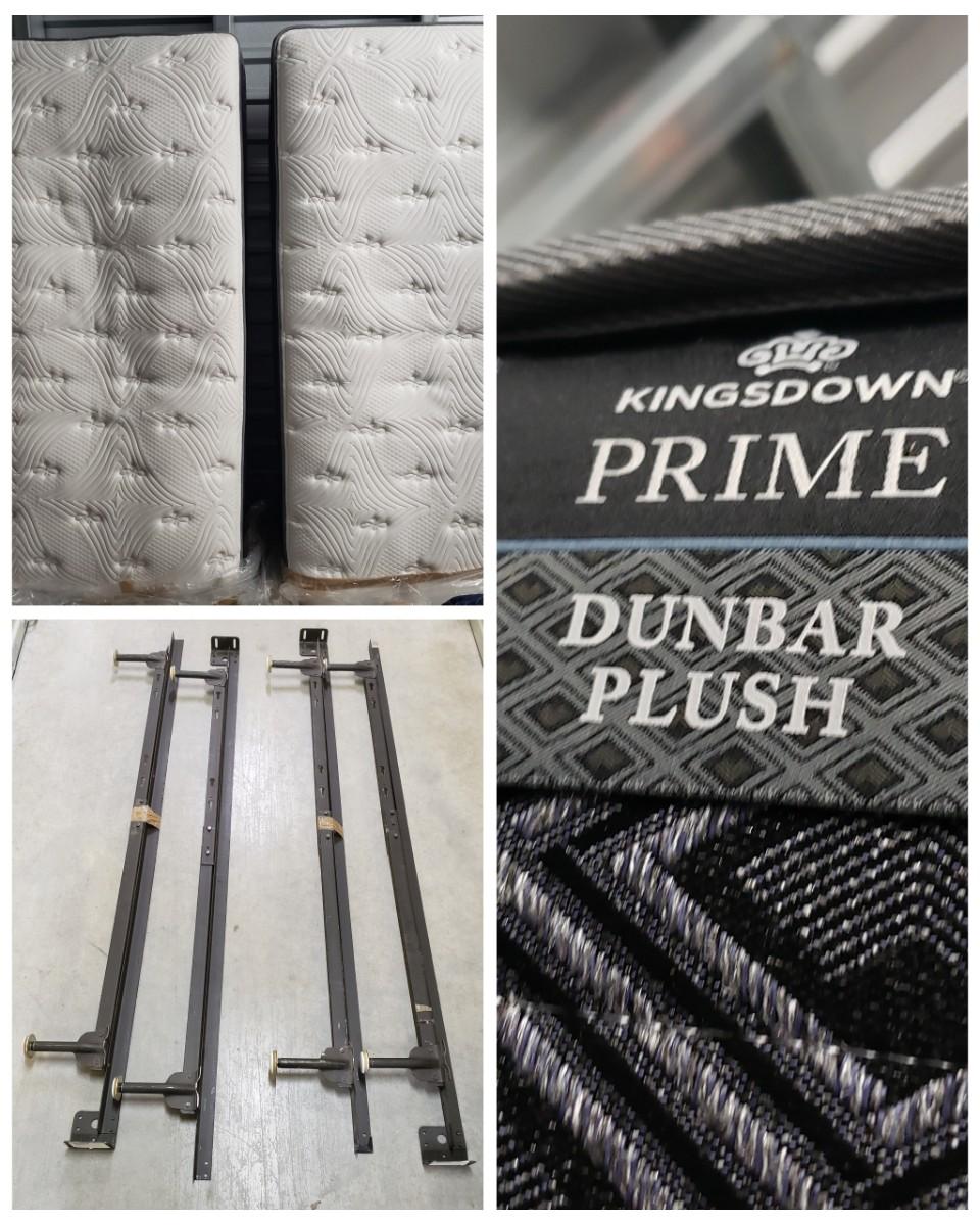 This lot contains two twin metal adjustable bedframes that can extend to a double size. This lot also comes with two Kingsdown mattresses and box springs that appear to be new or rarely used. The mattresses and box springs are available to the winning bidder if desired, but the winning bidder is not required to take it.
