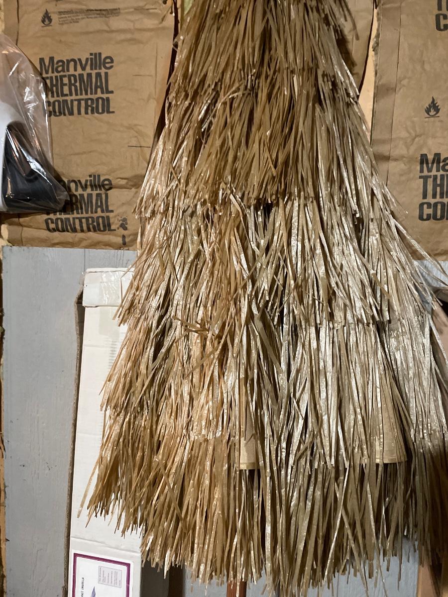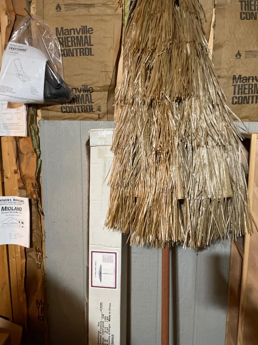 19 foot wooden market umbrella, and a tiki style umbrella with umbrella stand