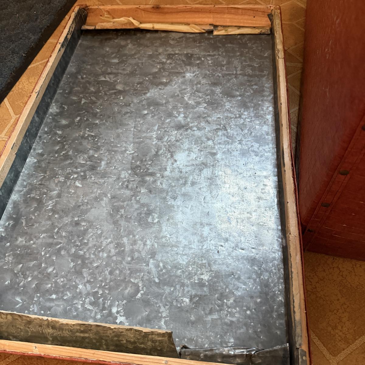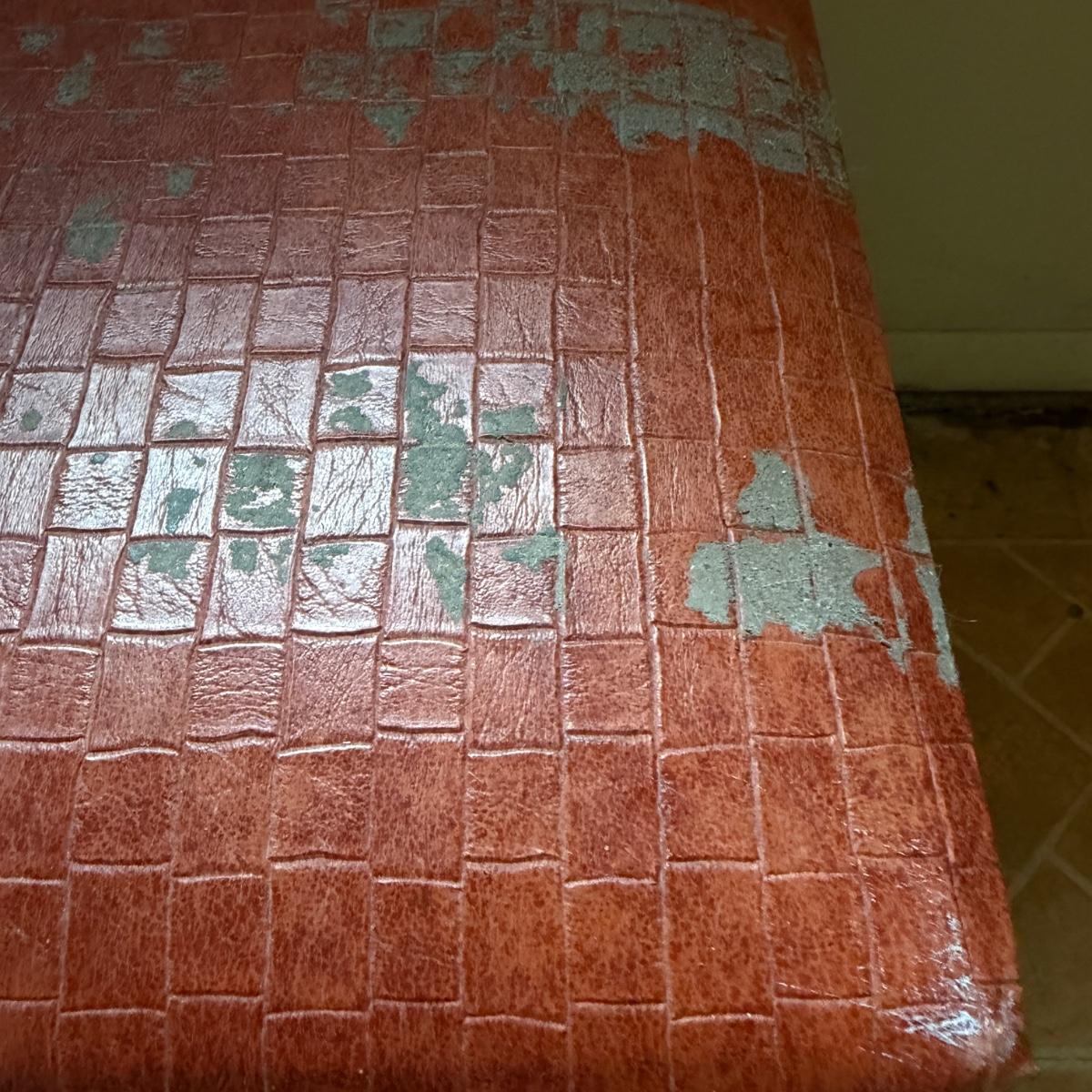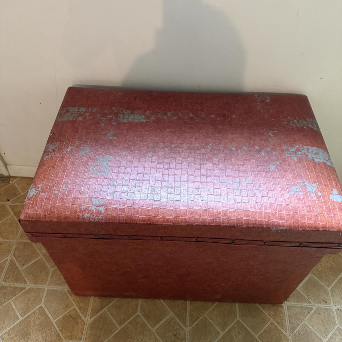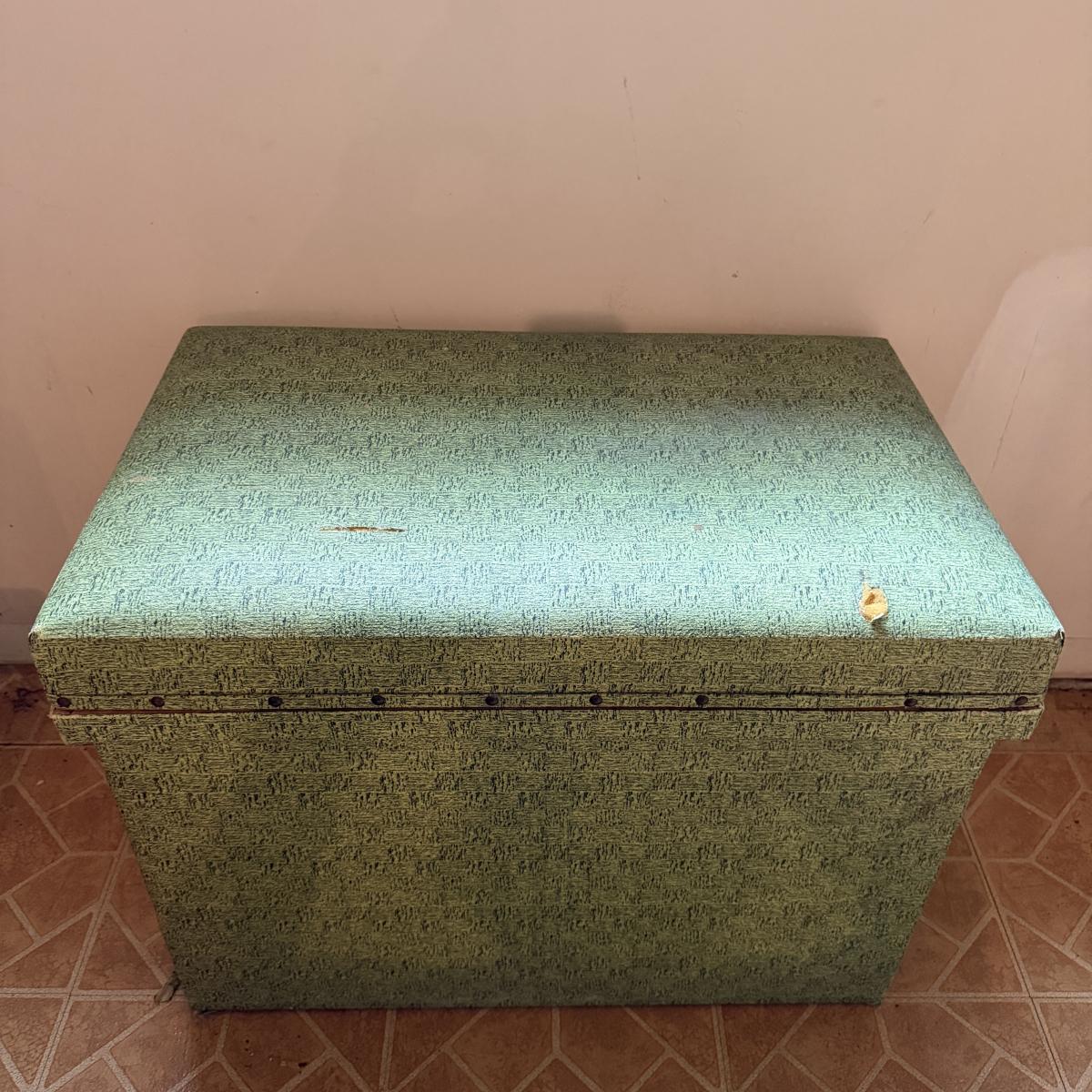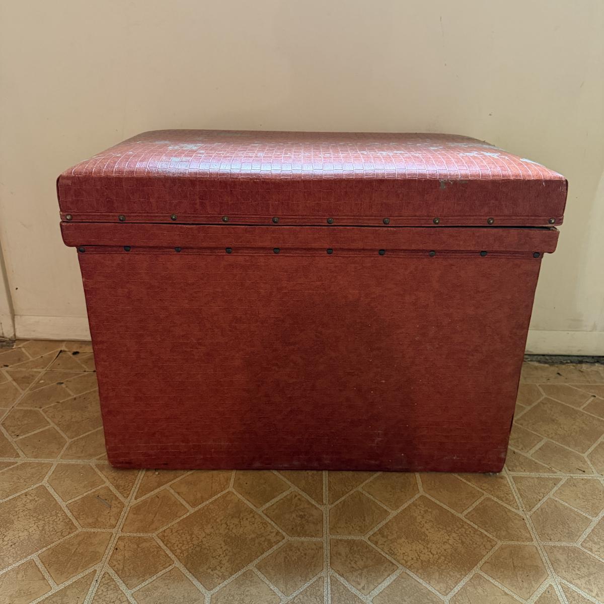 Lot includes two upholstered wooden boxes with padded lids and are metal lined inside. Boxes measure 27” x 17” x 20”H. Rust colored box has tape residue on top and both boxes have some defects inside and out, see pictures.