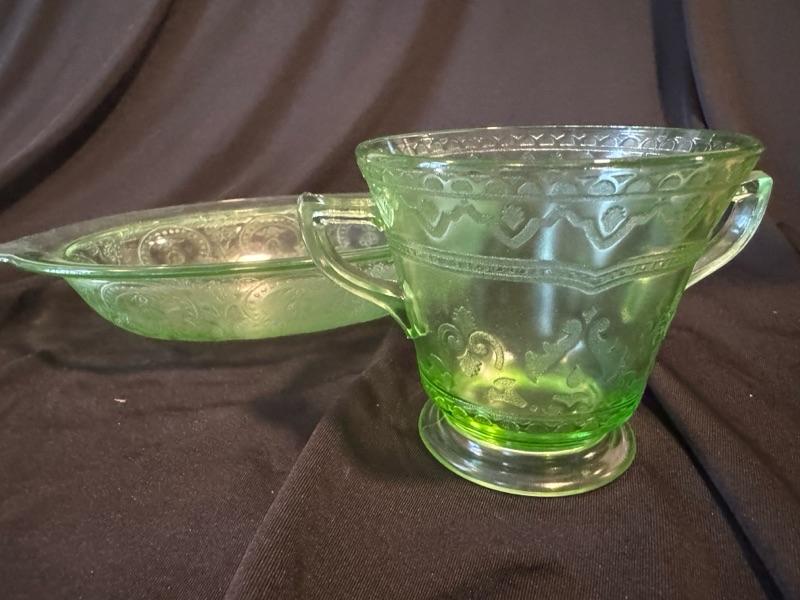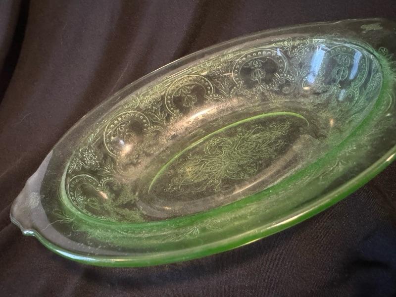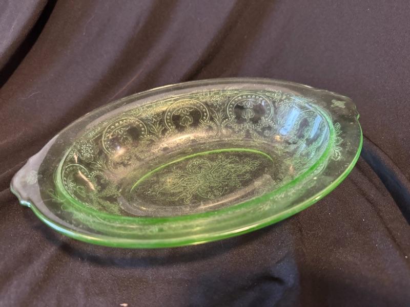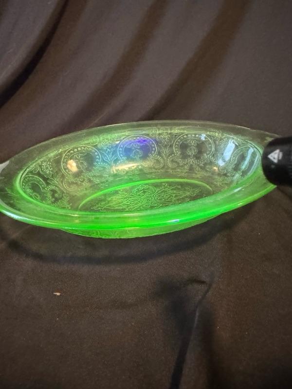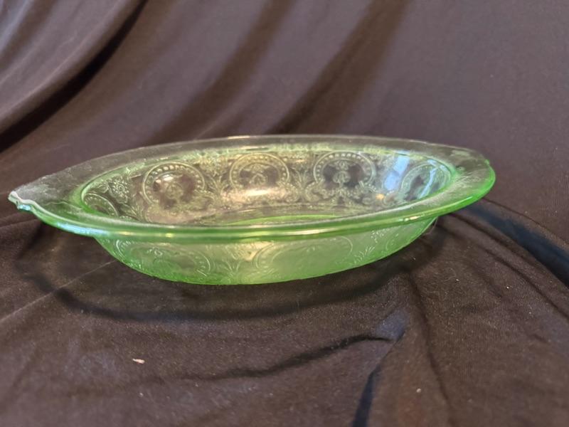 Uranium glass - see glow in photos. Patrician Spoke Green Depression Glass Sugar Bowl combined with a serving bowl, no lid on