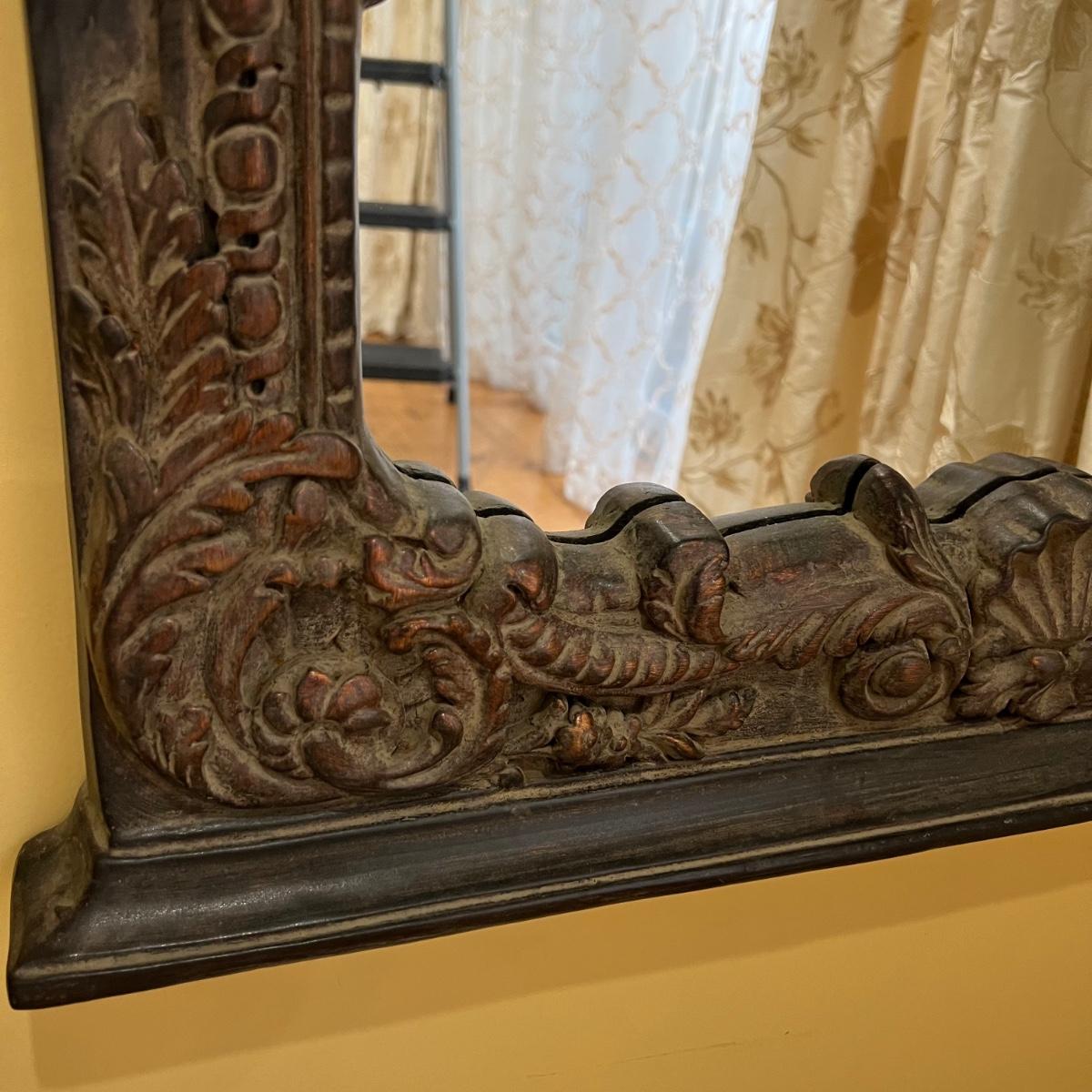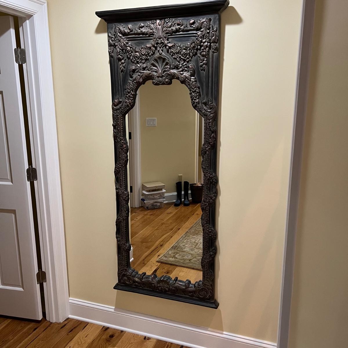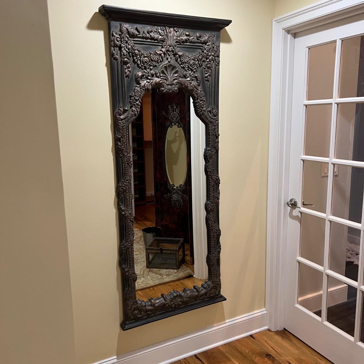 Two large wall mirrors each measuring 26” x 3” x 68”H. They are to be mounted with screws into the wall, rather than wire, due to their weight. Each appears to be wood and is carved in detailed floral patterns with shell accents.