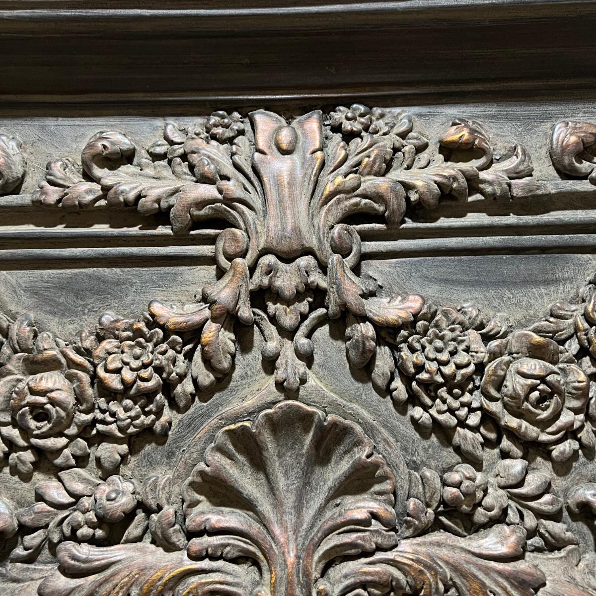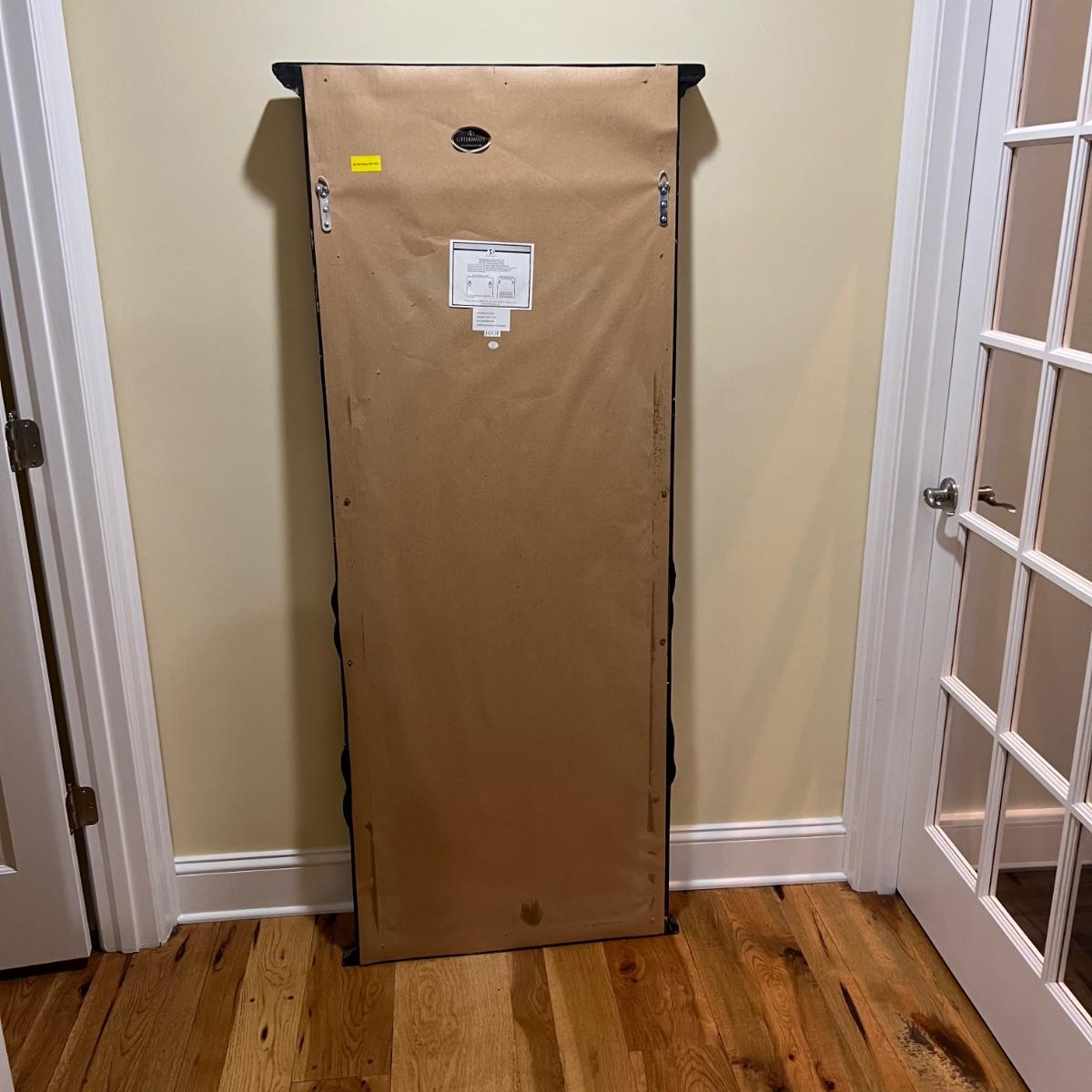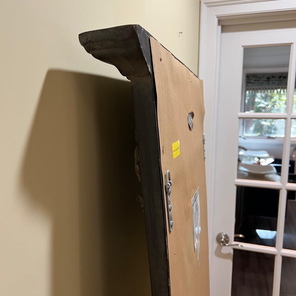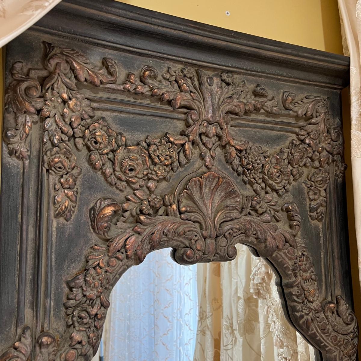 Two large wall mirrors each measuring 26” x 3” x 68”H. They are to be mounted with screws into the wall, rather than wire, due to their weight. Each appears to be wood and is carved in detailed floral patterns with shell accents.