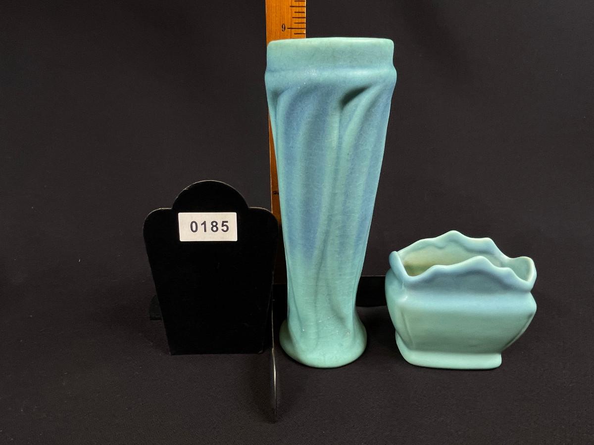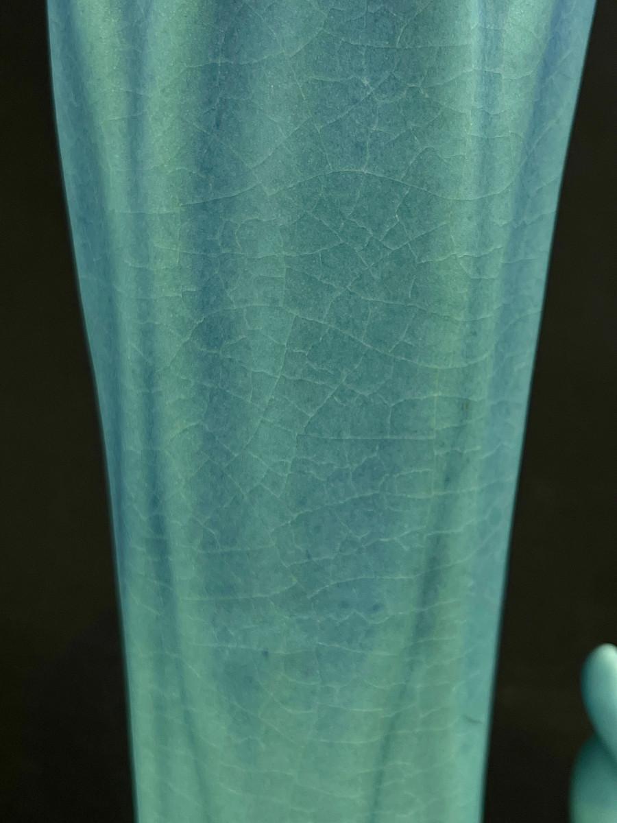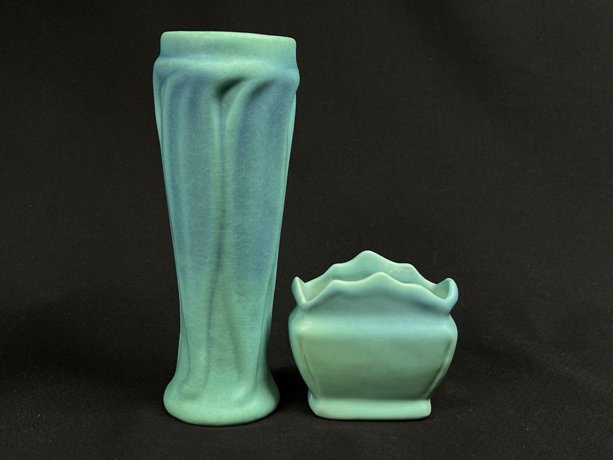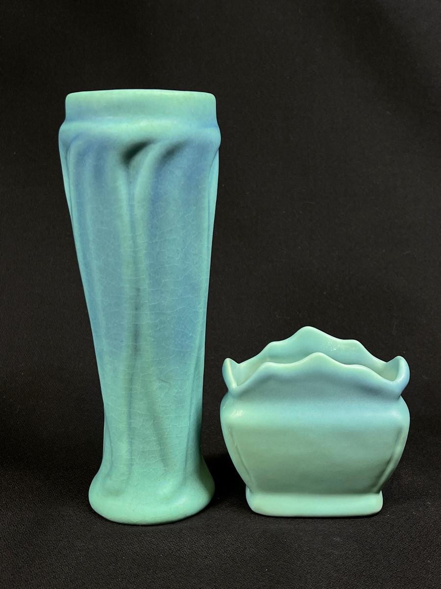 The subject items are two Van Briggle vases, one tall-ish (late teens early 1920s), the other smaller - an Asian-inspired low vase or match / cigarette holder. Both pieces are hallmarked and in good condition. Significant crazing due to age. See photos