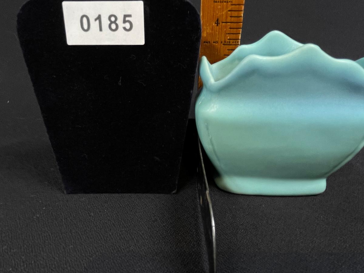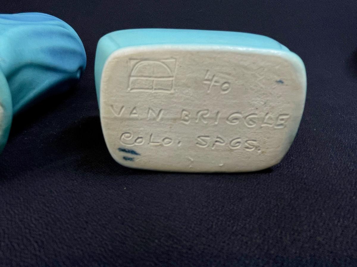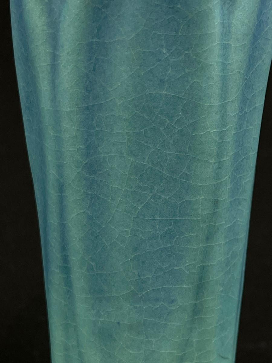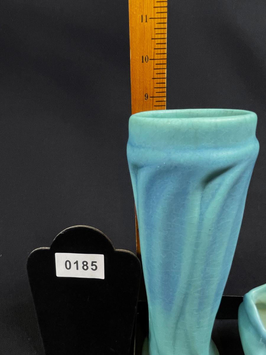 The subject items are two Van Briggle vases, one tall-ish (late teens early 1920s), the other smaller - an Asian-inspired low vase or match / cigarette holder. Both pieces are hallmarked and in good condition. Significant crazing due to age. See photos