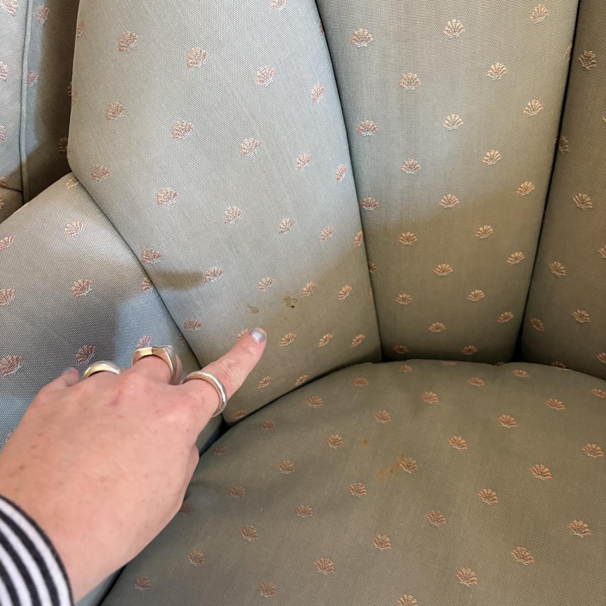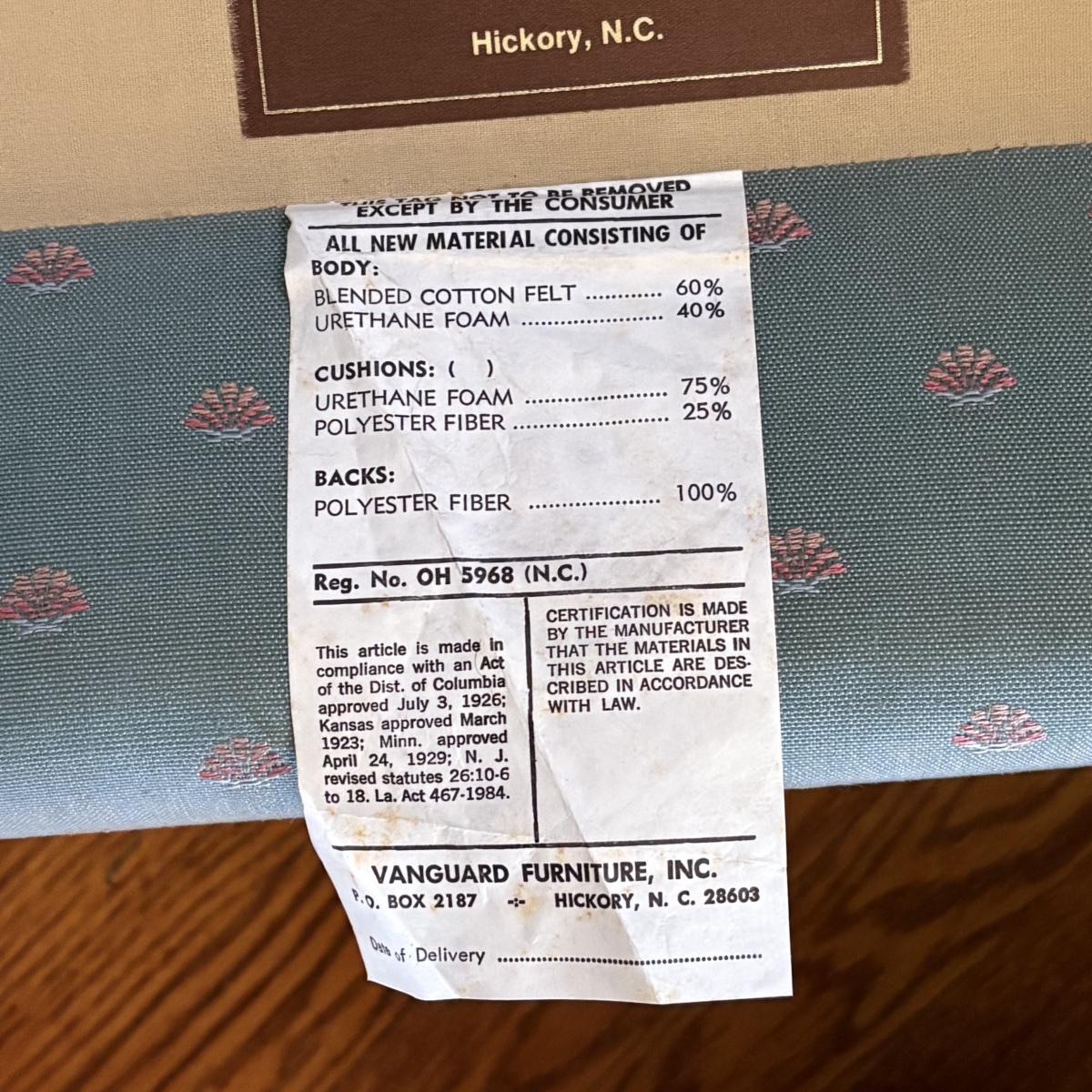 Lot includes two Vanguard Furniture upholstered swivel chairs. The fabric is a pale blue and both chairs have arm covers. Chairs measure 33” x 34” x 33”H with a 17” seat height . Stains and signs of wear on fabric and under cushions, see pictures for reference.