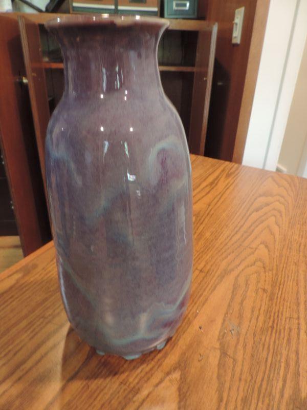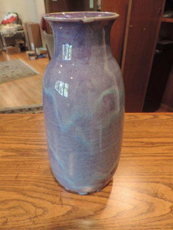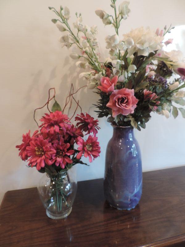 ONE GLASS, ONE CLAY WITH PURPLE AND BLUE SWIREL DESIGN MEASURES 14" TALL, FLOWERS INCLUDED