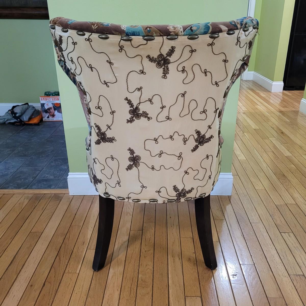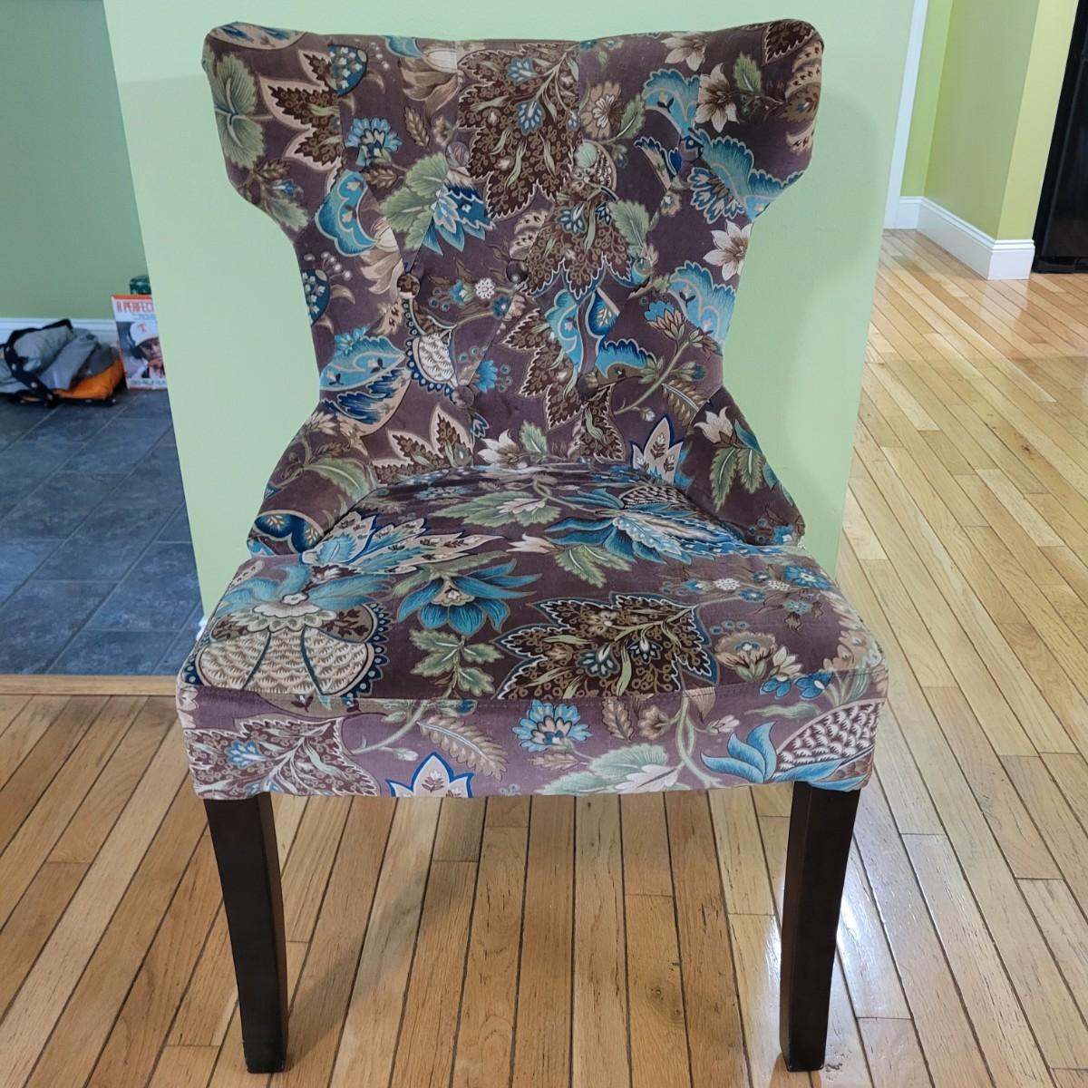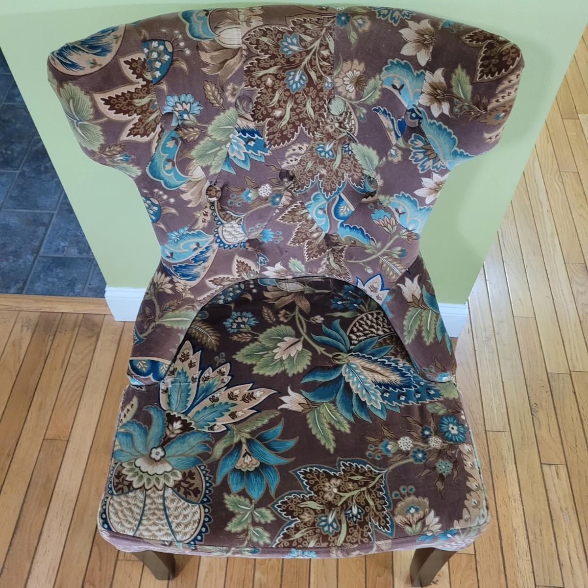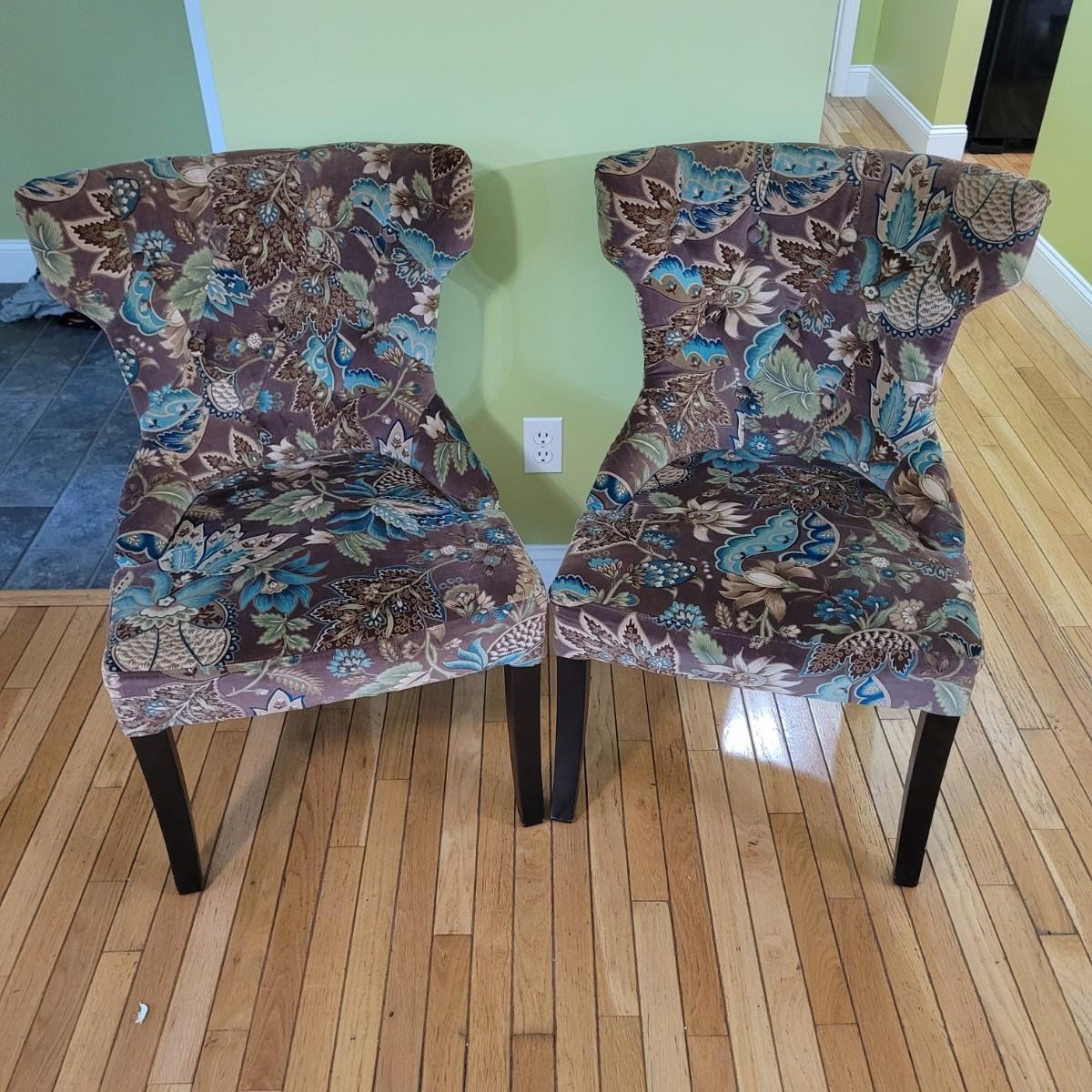 This lot includes two matching velvet accent chairs in a wingback style. Both chairs feature a floral print on velvet style upholstery with a solid wood body and metal accents. The backside features a contrasting fabric. Individually, the chairs measure 22" x 25" x 36"H with a 19"H seat height. Both chairs appear to be gently used with little to no signs of wear.