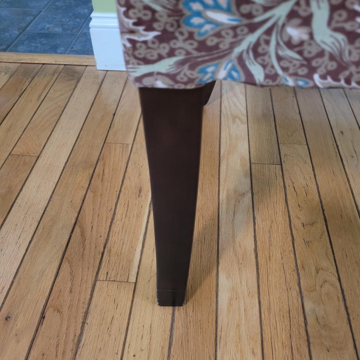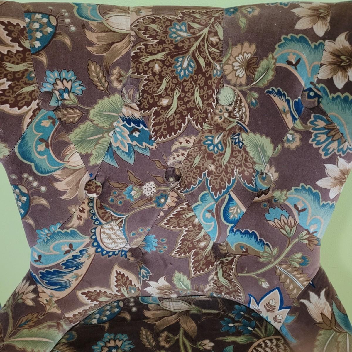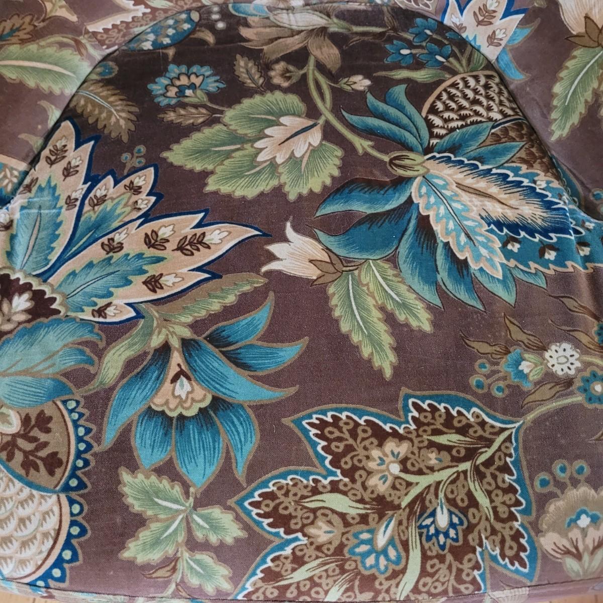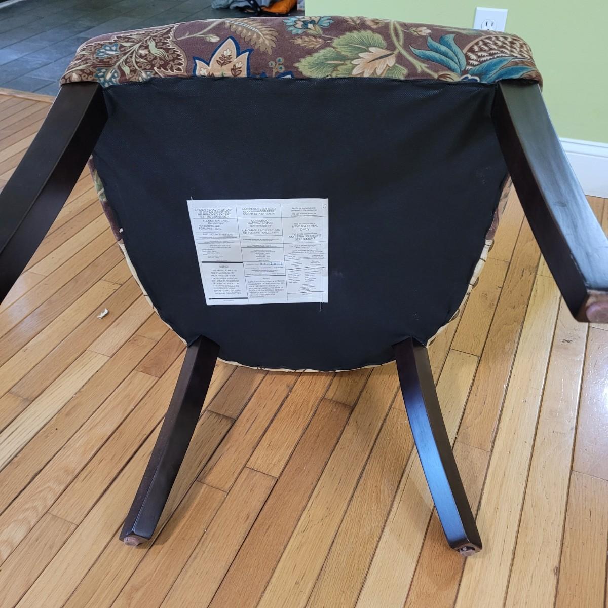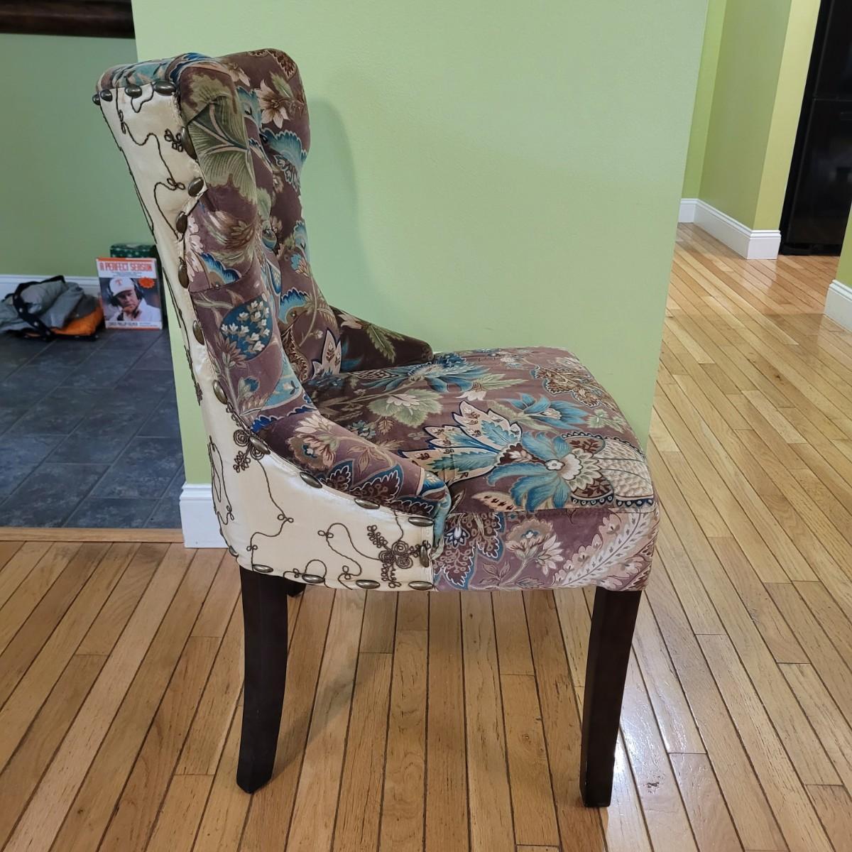 This lot includes two matching velvet accent chairs in a wingback style. Both chairs feature a floral print on velvet style upholstery with a solid wood body and metal accents. The backside features a contrasting fabric. Individually, the chairs measure 22" x 25" x 36"H with a 19"H seat height. Both chairs appear to be gently used with little to no signs of wear.