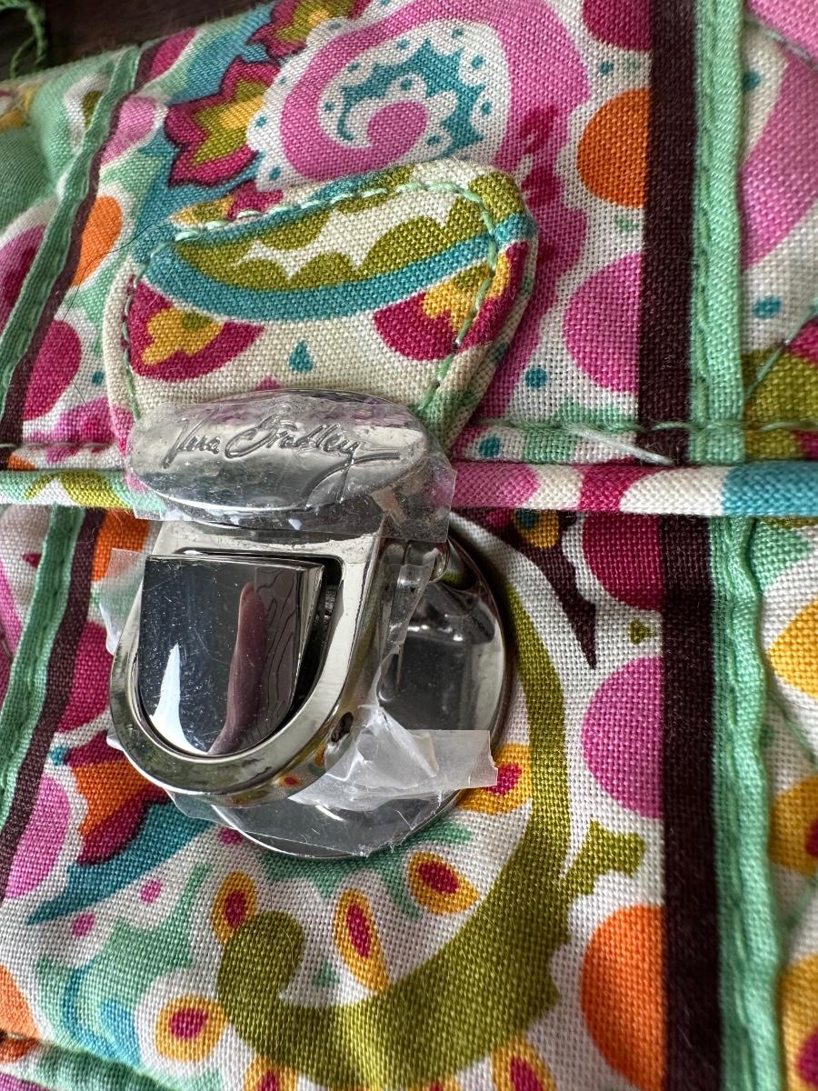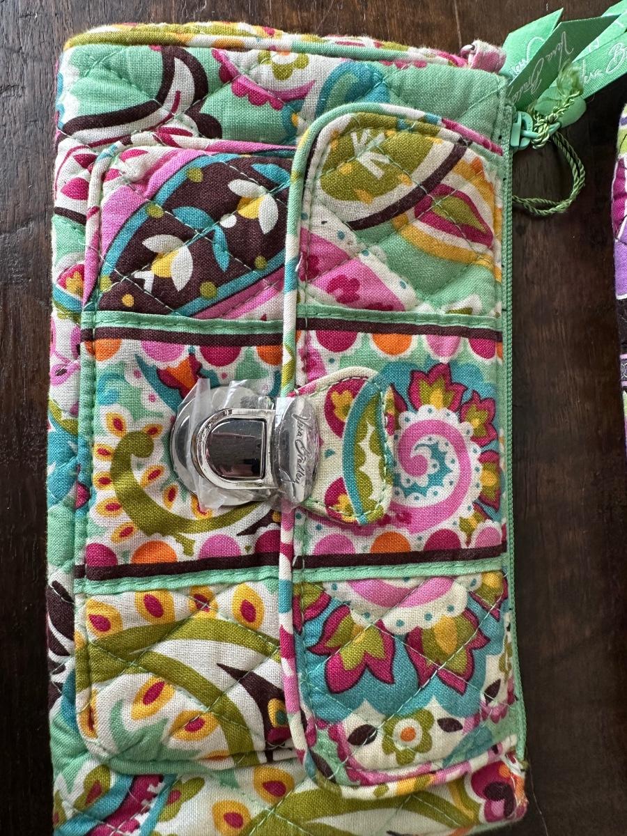 Wallet/Wristlet — Multicolor paisley print with silver-tone clasp engraved “Vera Bradley,” interior compartments for cards and cash, zippered closure.