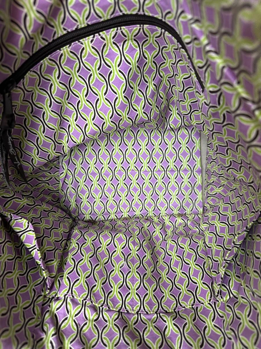 Large Handbag — Black background with pink, purple, and green floral design. Dual handles, open interior with side pockets.