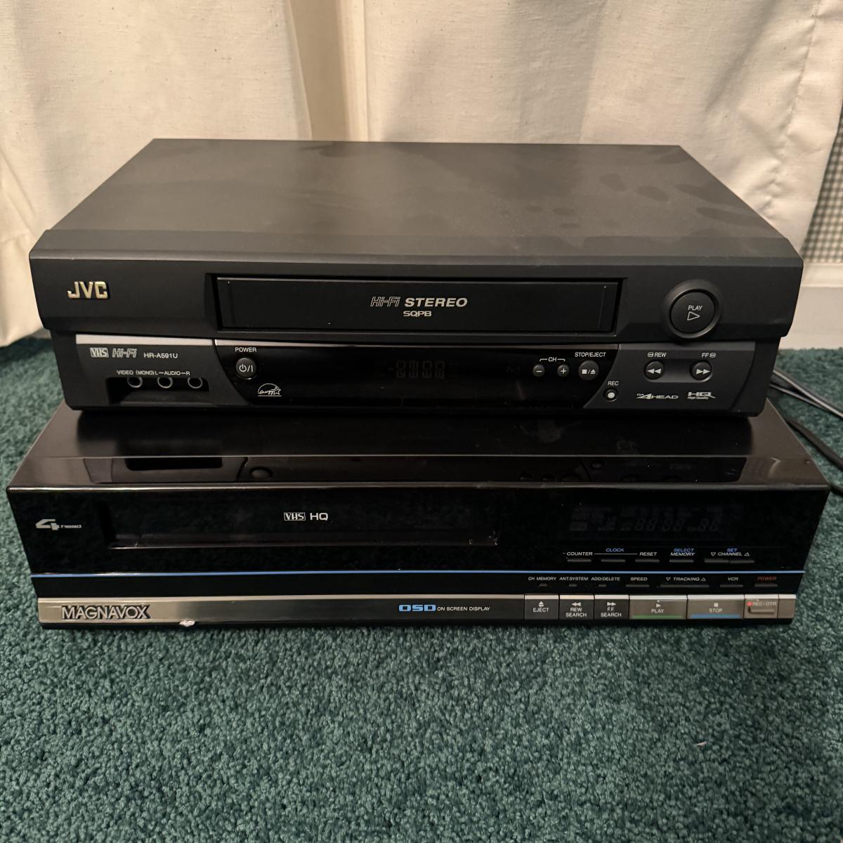 One older Magnavox VHS player and one newer JVC VHS player. The JVC player has a remote control. Both turned on when plugged in. Shipping available.