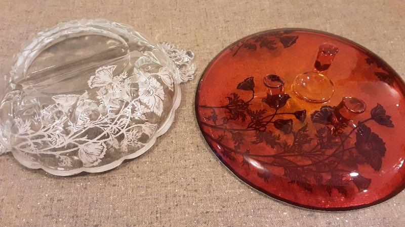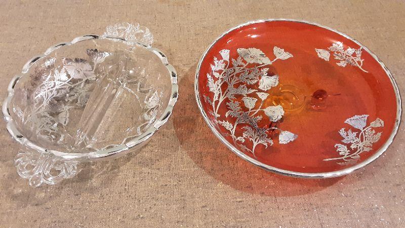 Viking three footed Flanders silver poppy overlay ruby glass dish and Viking Flanders silver poppy overlay divided dish