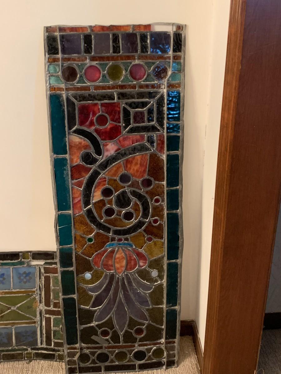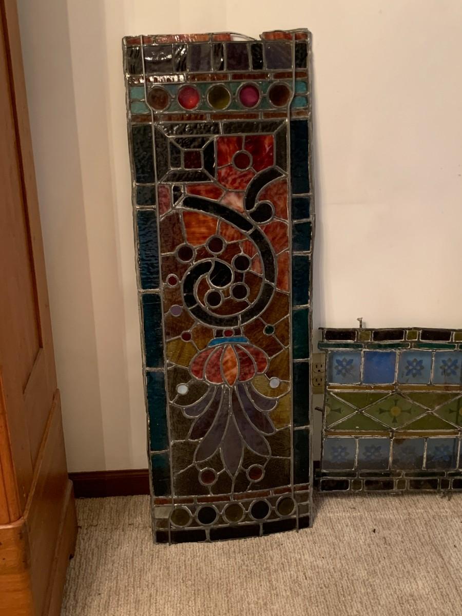 Listed are 2 vintage / antique stain glass window out of frames. They came out of an old church. They both have the same pattern. Pictures show one from the back and one from the front. The are about 36" in height and 18" across