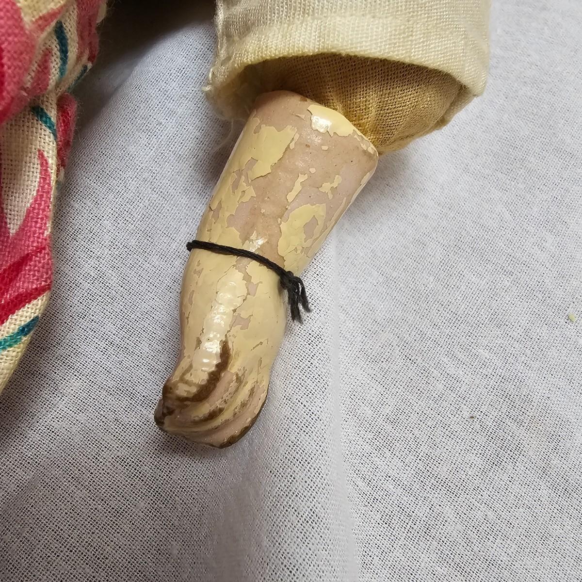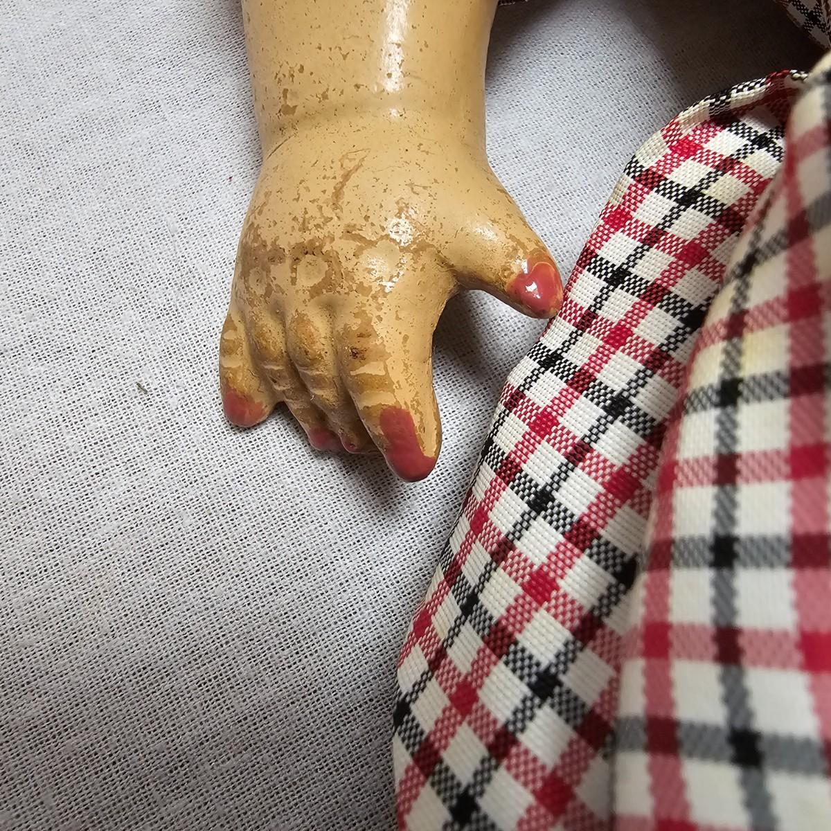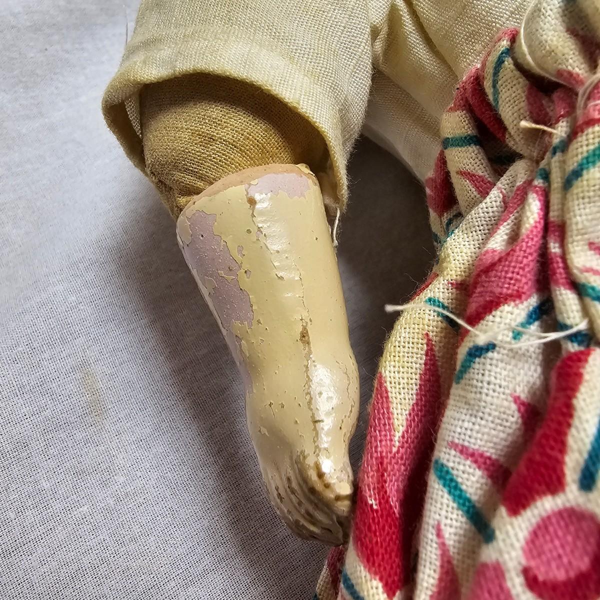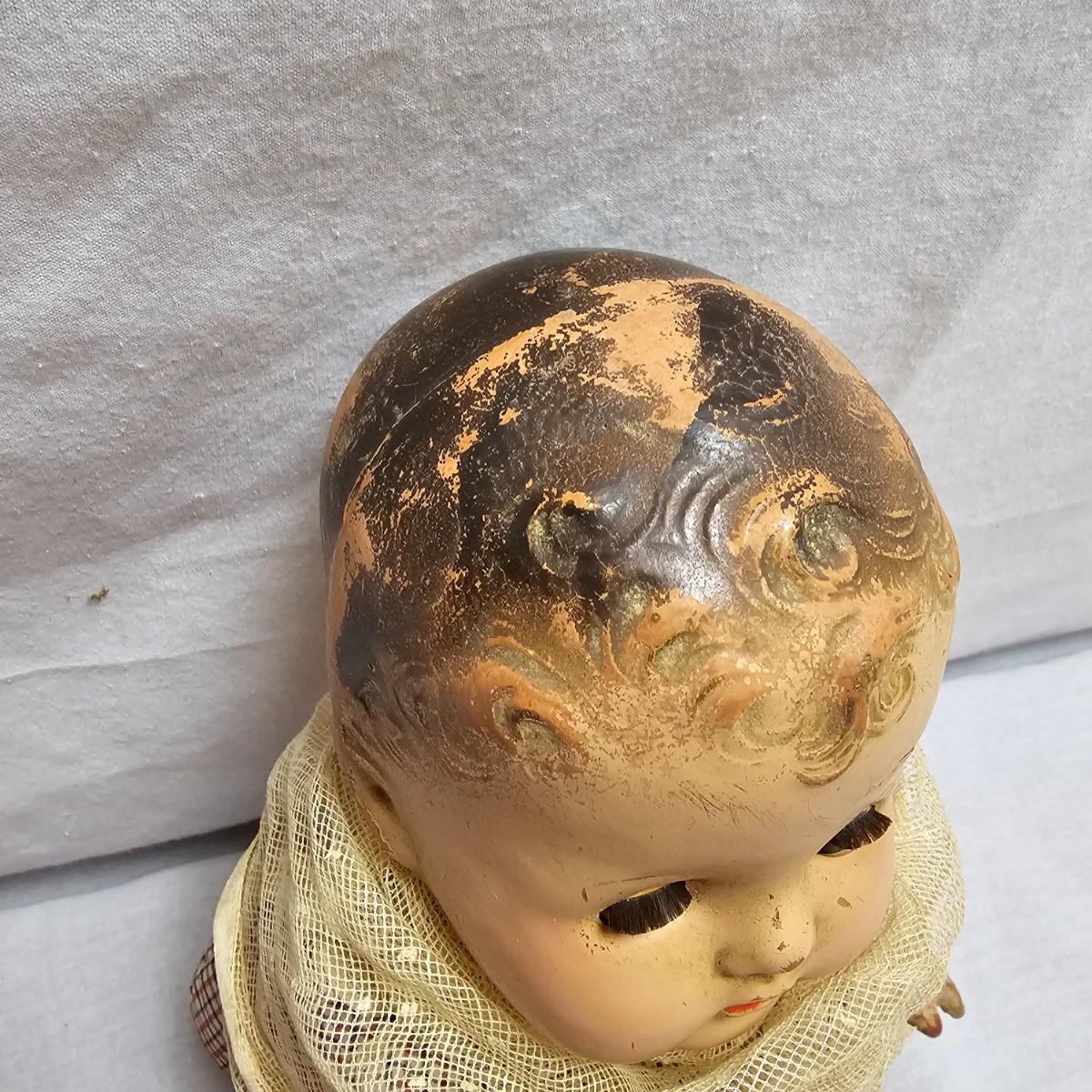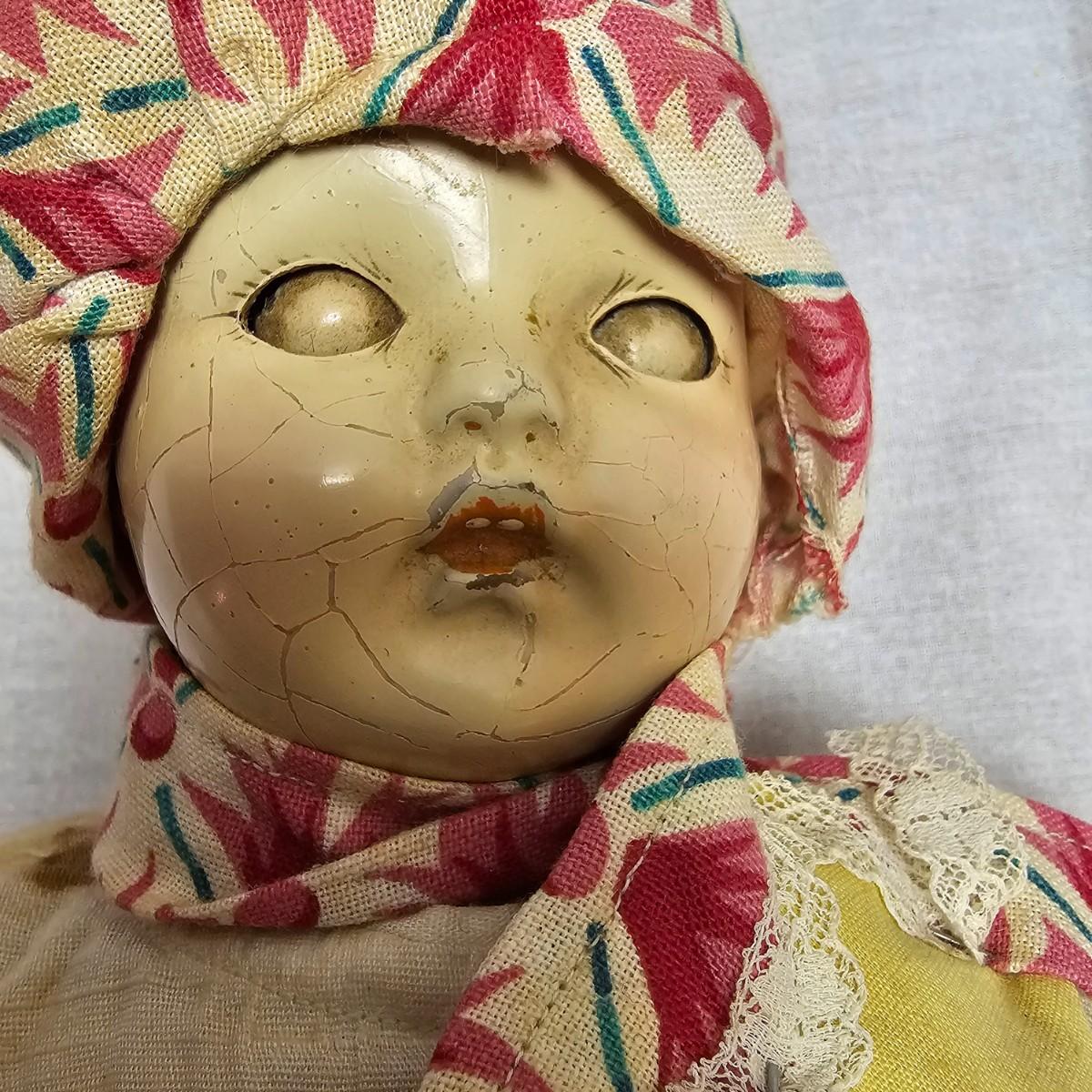 A pair of very well loved vintage baby dolls. Doll with red floral skirt and headpiece has porcelain head and hands. She measures 8" x 3" x 15"H. Eyes open and close. Legs, upper arms and body appear to be stuffed linen fabric. Face and hands have numerous chips and cracks. Manufacturer mark on back of neck but unrecognizable. The other doll is 9" x 4.5" x 18"H, has molded plastic heads, arms and lower legs. Eyes open and close, and she makes a cry when picked up. Clothing and scarf have some stains, and paint on head and hands is scratched. See photos for details. Shipping available.