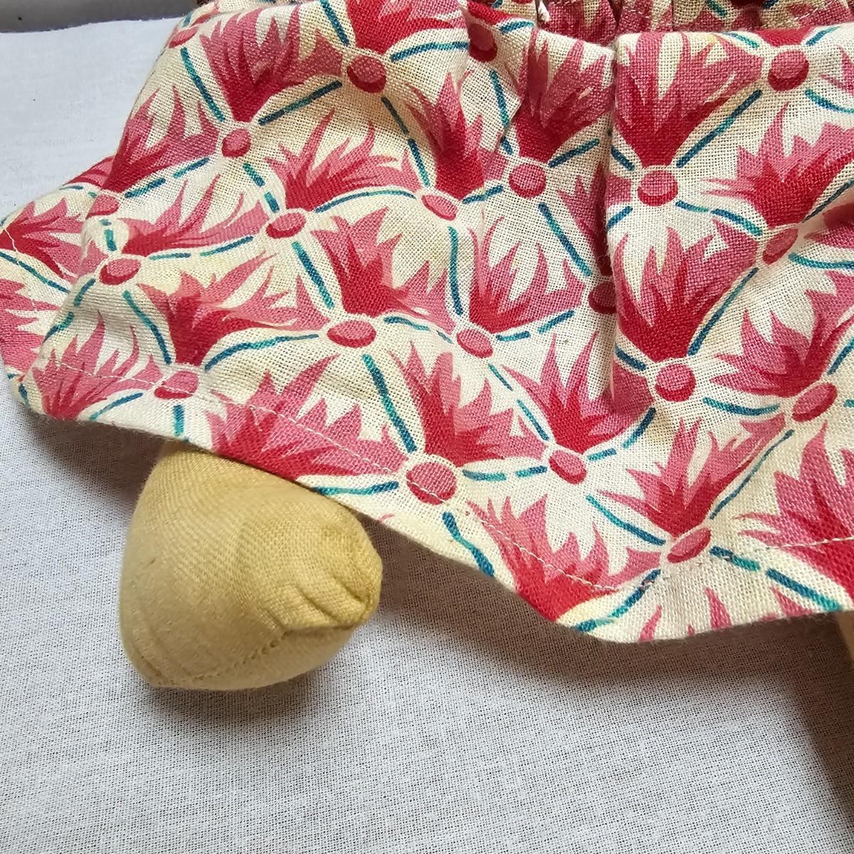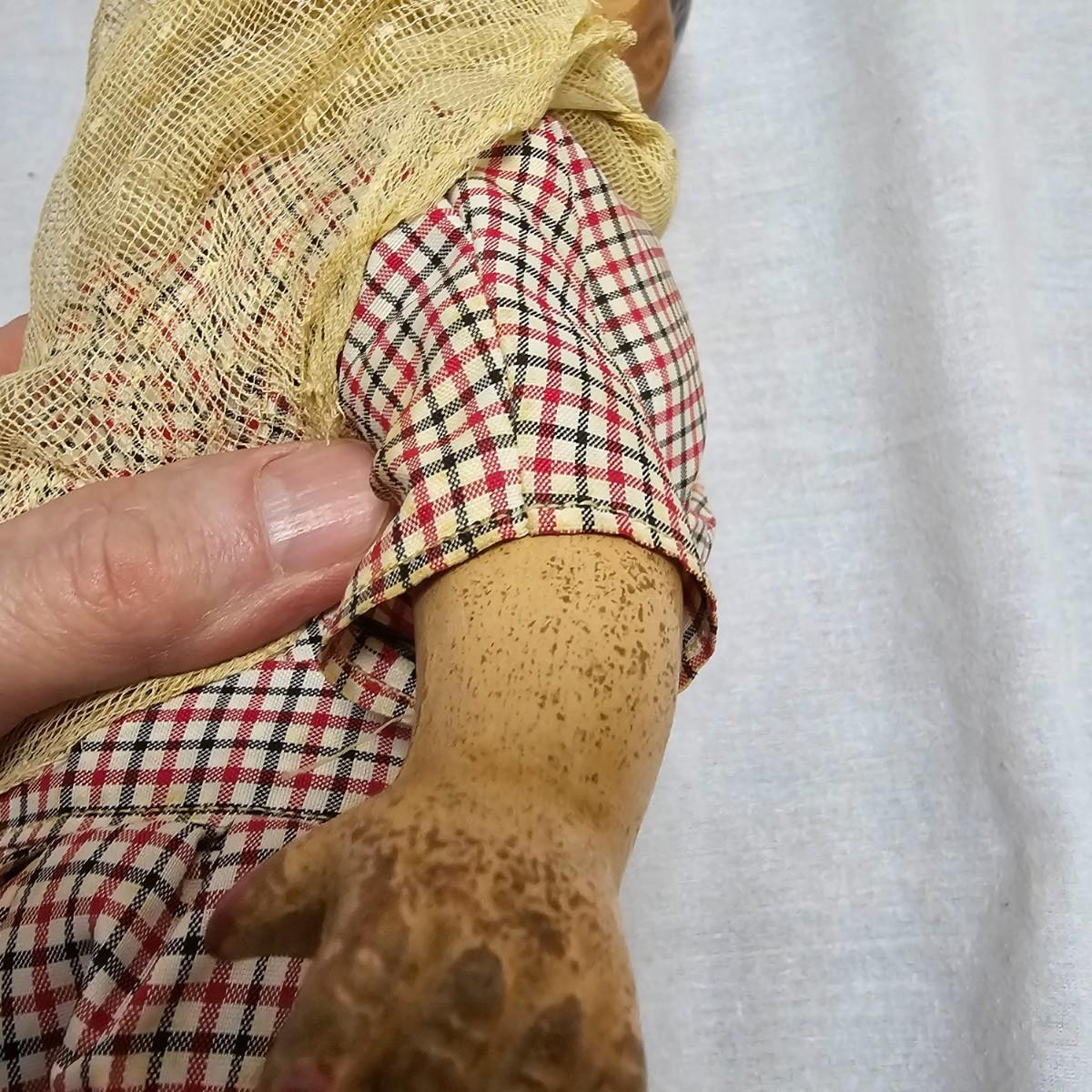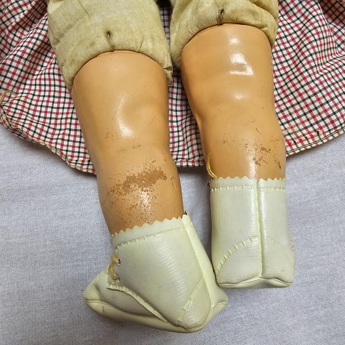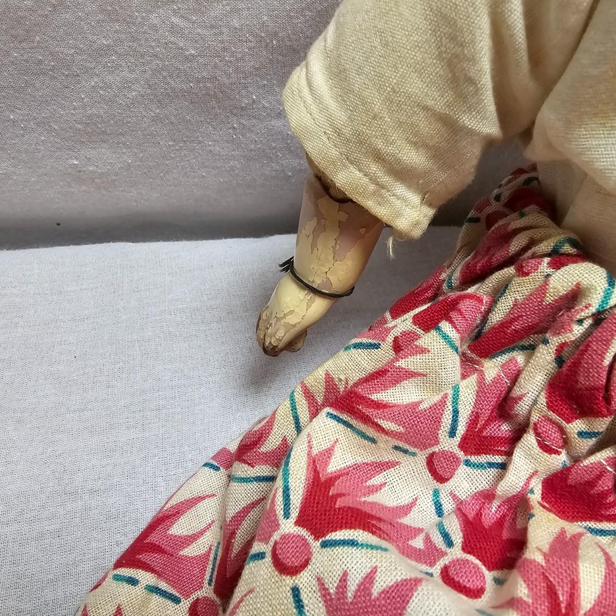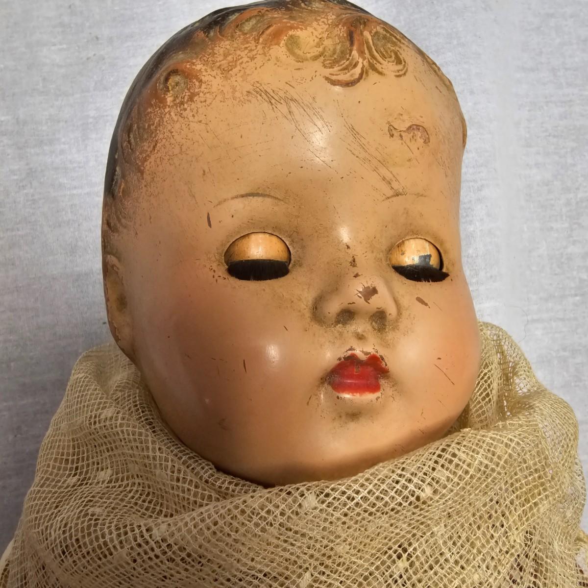 A pair of very well loved vintage baby dolls. Doll with red floral skirt and headpiece has porcelain head and hands. She measures 8" x 3" x 15"H. Eyes open and close. Legs, upper arms and body appear to be stuffed linen fabric. Face and hands have numerous chips and cracks. Manufacturer mark on back of neck but unrecognizable. The other doll is 9" x 4.5" x 18"H, has molded plastic heads, arms and lower legs. Eyes open and close, and she makes a cry when picked up. Clothing and scarf have some stains, and paint on head and hands is scratched. See photos for details. Shipping available.